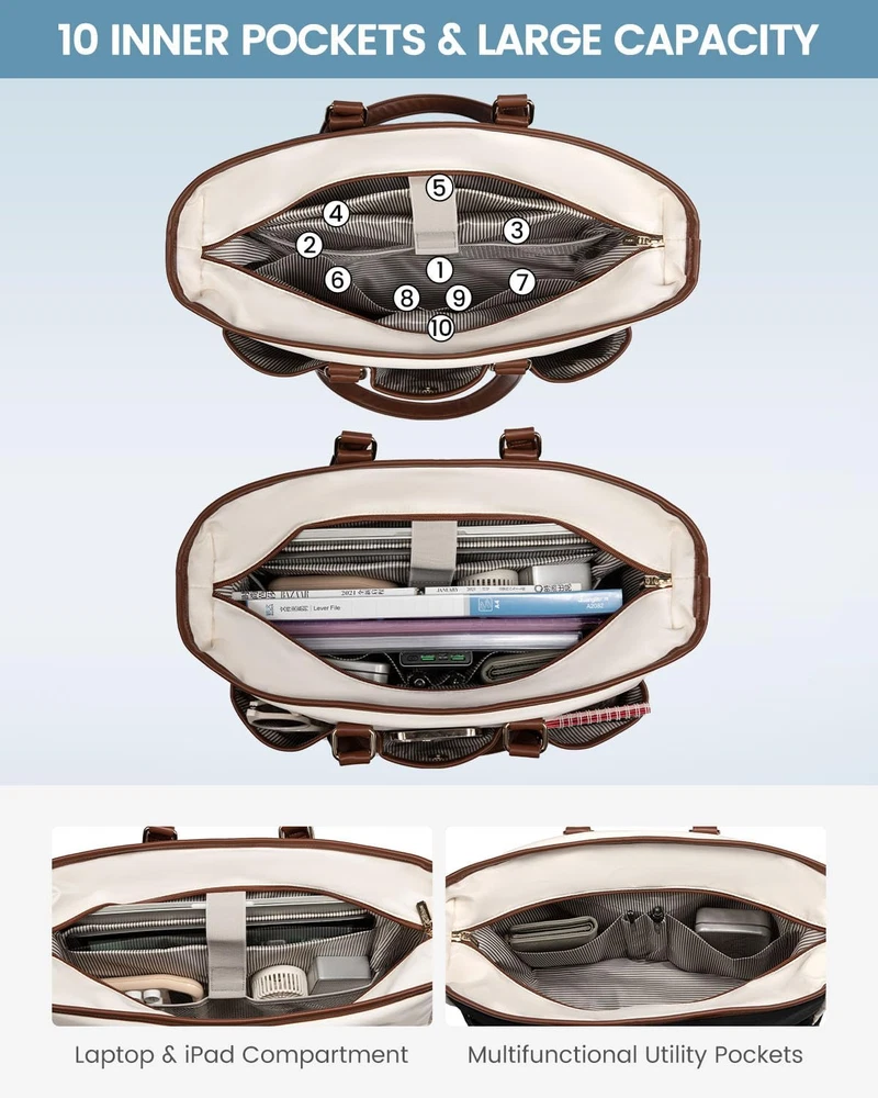 Multi-pocket Design for Versatile Use: Our work tote bag for women boasts 10 interior pockets, making it perfect for organizing your work essentials. Whether you're a nurse, teacher, or professional, this tote bag ensures everything has its place. Durable and Waterproof: Built to withstand daily use, this laptop bag for women features strong, waterproof materials that keep your items safe in any weather, ideal for work or weekend travel. Enhanced Security: The fully enclosed zipper top of the laptop tote bag for women offers maximum security, preventing items from falling out and keeping them dry in the rain. Perfect for both professional and casual settings. Stylish and Functional: With elastic side pockets that can hold large water bottles, this work tote bags for women combines style and function, ensuring you look good while staying prepared for any situation. Perfect for Various Scenarios: This bag is ideal not just as a work bag, but also as a teacher bag, nurse bag, gym bag for women, diaper bag, computer bags for laptops for women, everything tote bag, travel tote bags for women, or beach tote. Its stylish design makes it great gifts for teachers, working women and busy moms alike. Product Description Teacher Tote Bag This tote bag, with its multiple pockets and large capacity, is perfect for teachers' daily needs. It can hold many books and teacher essentials, making it an excellent Teacher's Day gift. Nurse Bag As a nurse bag, it features multiple pockets and ample space, perfect for carrying nurse essentials for work during daily hospital shifts. An ideal gift for nurses. Travel Tote Bags for Women This travel tote bag with a luggage sleeve is perfect for vacations and business trips. It ensures easy airport navigation and convenient carrying. Laptop Bag for Women Work This work bag for women features a dedicated laptop compartment, perfect for professional use. Stylish, functional, and ideal for the office or meetings. Diaper Bag This diaper bag tote features organized compartments, perfect for outdoor activities. It's stylish and practical for carrying baby essentials during outings. College Book Bag This laptop tote bag features a spacious design, perfect for carrying books and laptops. Ideal for college life, library visits, and daily classes.