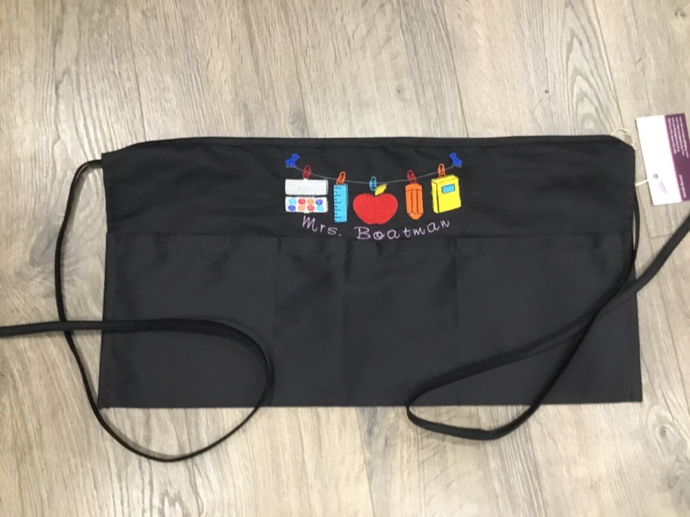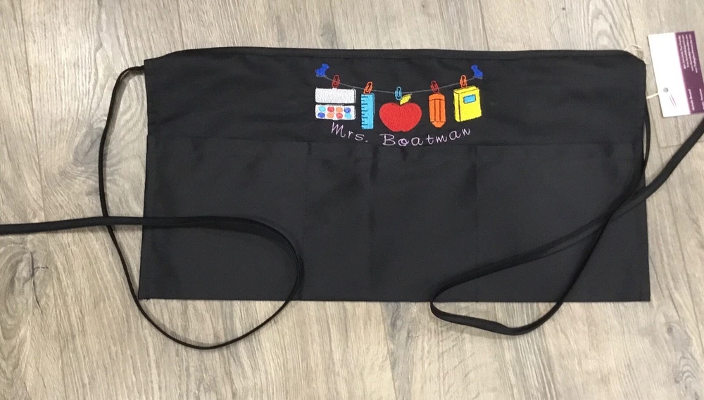 Back to school Personalized half apron. Three-Pocket Waist Apron. Great gift for teachers. Fits men and women. Available your choice of black, navy, red, royal blue and natural. Features: 65% polyester, 35% cotton twill 10" length, 19" width (Inches) three 6¼" wide front pouch pockets Natural is 100% cotton canvas