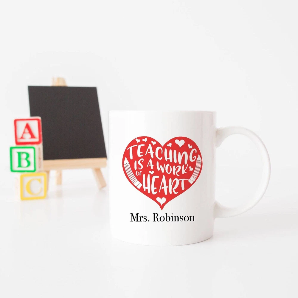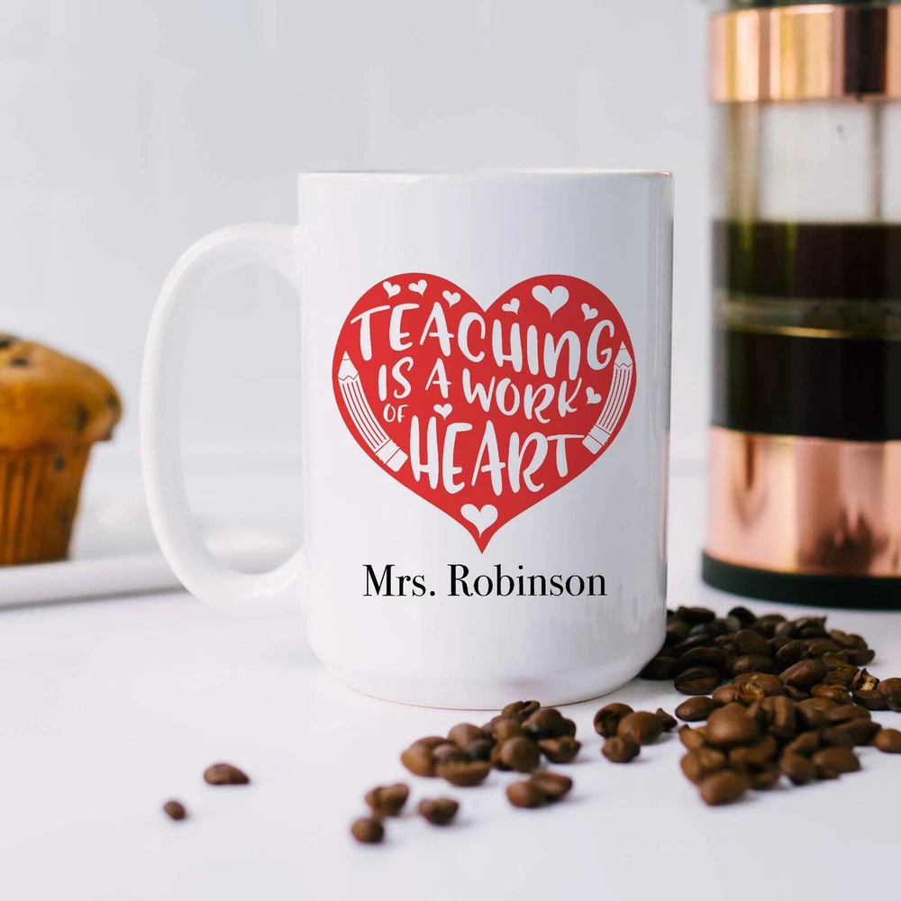 Teaching Is A Work Of Heart Custom Teacher Name Mug End Of Year Thank You Gift Product Details.. This high quality 11oz. ceramic white mug has a premium hard coat that provides crisp and vibrant color reproduction sure to last for years. Perfect for all hot & cold beverages. The highest quality printing possible is used. It will never fade no matter how many times you wash it. Material: 100% Ceramic. Print both sides. Dishwasher and Microwave Safe. High Gloss + Premium White Finish. Printed in the U.S.A. Personalized & Custom. We support personalized and custom mug to add custom, when placing an order, you can add notes to the "order note" in shipping address section. Also you can contact us directly via message. Shipping Info. Ready to ship in 1 to 2 business days, All products are made-to-order and proudly printed in the United States. Shipped by USPS and DHL, You will receive your order in 5-7 days. Replace & Refund. All products are defective during shipping broken, chipped will be replaced free of charge. You are not satisfied with the product, we will refund 100% money to you. If any other issues arise, please do not hesitate to message, we would be more than happy to assist you.