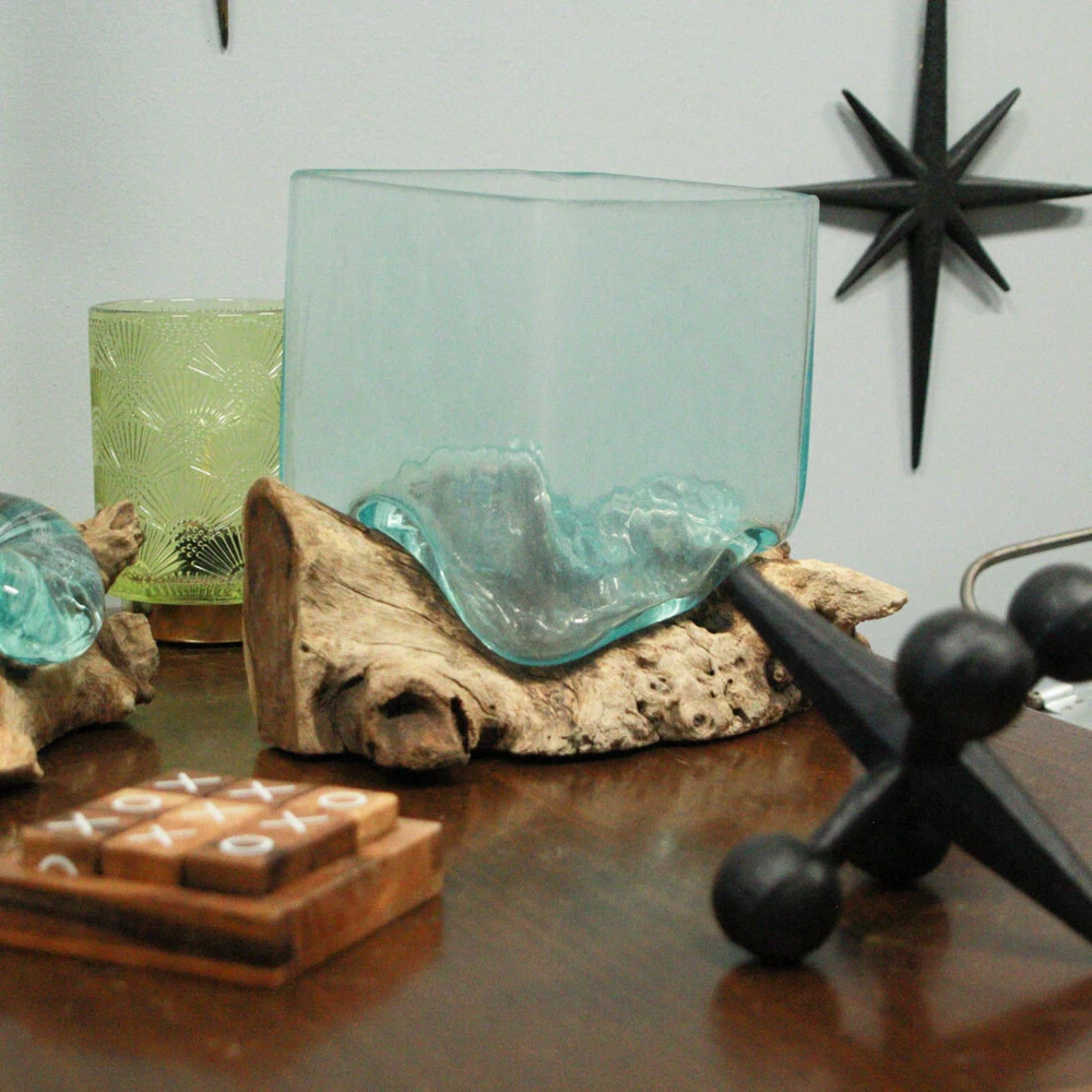 Versatile Size - This piece measures approximately 9 inches long, 8 inches high, and 7.5 inches wide, with slight variations due to its handcrafted nature, ensuring uniqueness in every item. Quality Craftsmanship - Crafted with care, this sculpture features a molten glass vase delicately formed over a teak driftwood base, creating an elegant and earthy decorative accent suitable for various purposes. Individual Beauty - The clear glass bowl is meticulously shaped over an organic wood base, resulting in a distinctive glassscape bottom, making it an exquisite addition to tables, counters, or desks, showcasing nature's artistry indoors. Our eBay Store About Us Add to Favorite Sellers Teak Driftwood and Melted Glass Square Vase, Bowl, or Planter – Approximately 8 Inches High – Nature-Inspired Elegance for Home and Patio Decoration Versatile Size - This piece measures approximately 9 inches long, 8 inches high, and 7.5 inches wide, with slight variations due to its handcrafted nature, ensuring uniqueness in every item. Quality Craftsmanship - Crafted with care, this sculpture features a molten glass vase delicately formed over a teak driftwood base, creating an elegant and earthy decorative accent suitable for various purposes. Individual Beauty - The clear glass bowl is meticulously shaped over an organic wood base, resulting in a distinctive glassscape bottom, making it an exquisite addition to tables, counters, or desks, showcasing nature's artistry indoors. Natural Charm - Ideal for succulent gardens, air plants, greenery, herb cultivation, or crafting personalized terrariums and fairy gardens, this piece adds a touch of the natural world to any space, bringing a sense of tranquility and beauty. Perfect Gift - Whether for your home or as a thoughtful present for loved ones, this unique and versatile glass and teak sculpture makes an excellent gift choice, showcasing the beauty of nature through artistic craftsmanship. Experience the perfect fusion of nature and artistry with this captivating sculptural vase. The square bowl, crafted from molten glass, features organic shapes that beautifully capture nature's essence. Its elegant design is complemented by the natural contours of teak driftwood, creating a striking contrast. Measuring approximately 9 inches long, 8 inches high, and 7.5 inches wide (sizes may vary slightly), this versatile piece offers endless possibilities for creative expression. Use it to showcase house plants, cultivate fresh herbs, or design a whimsical fairy garden. Alternatively, fill it with vibrant stones, shells, or dried flowers to create a stunning centerpiece. The transparent glass, with its molten elegance, enhances any space with its organic charm. Whether used as a decorative focal point, a terrarium, or a vessel for floral arrangements, this piece adds a touch of natural allure to your home. Each element is expertly crafted by artisans, embodying the beauty of nature and enriching your décor with unique sophistication. Product Details Color Brown Height 8 Length 9 Weight 6.3 LB
