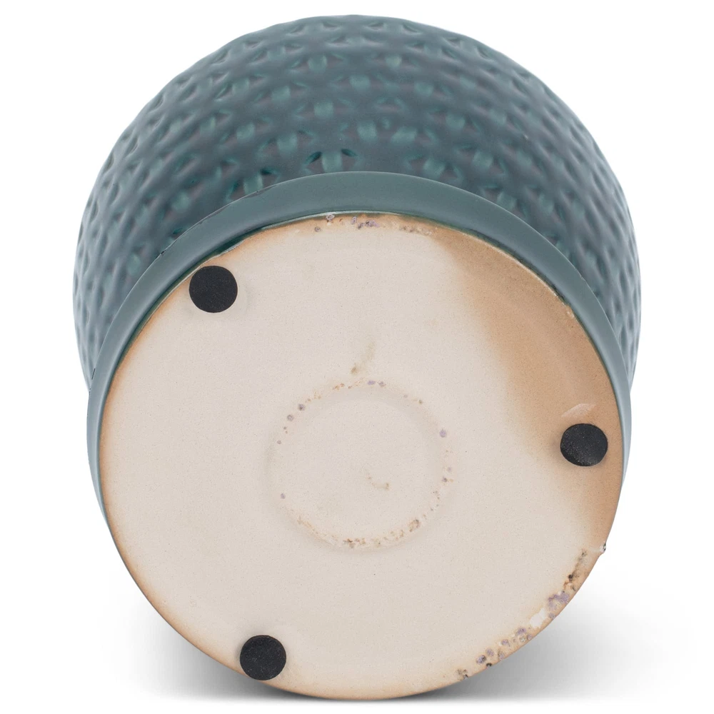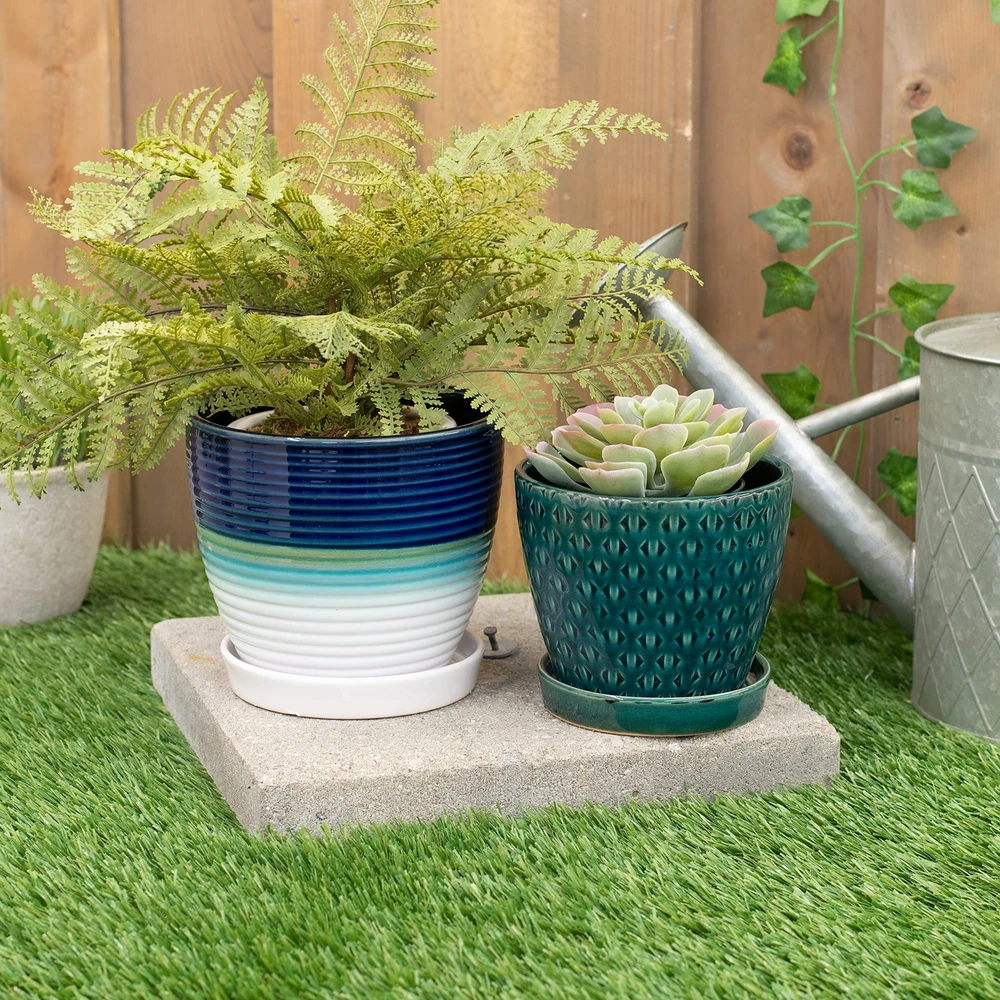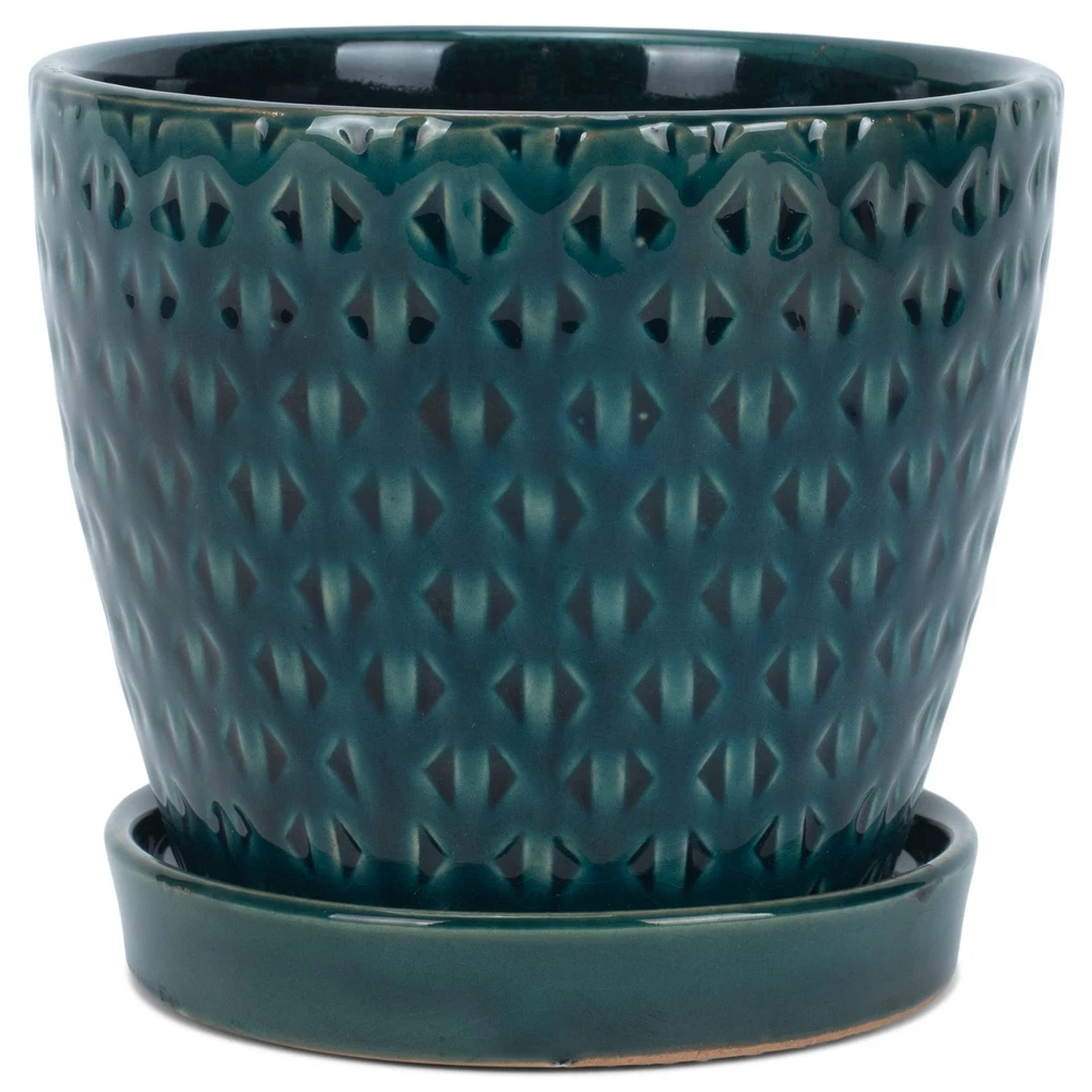 Embossed ceramic planter with a reactive teal glaze for long-lasting beauty. Measures 4.25-inches high and 5-inches in diameter and includes a matching saucer. Look to for a -stop-shopping home for all your floral, garden, gift and seasonal decor needs. For over 75 years has provided a wide range of seasonal designs, garden living, inspirational assortments and collections to help add functional decor to your outdoor spaces. INDOOR/OUTDOOR PLANTERS: Durable, high quality ceramic and glaze finish for long lasting beauty and use; suitable for any room in any home SMALL SIZE: Measures 4.25-inches high and 5-inches in diameter; matching saucer ALL-OVER INDENTED ARROW DESIGN ON EXTERIOR: Reactive teal glaze adds drama and dimension; nature of the process ensures no 2 look exactly alike IDEAL GIFT FOR GREEN THUMBS: Neutral design fits most décor and will accent any room in the home; add a favorite plant for a gift they'll never forget HOME AND GARDEN DÉCOR: Proud to be the leading source for all your home and garden décor for over 75 years - from floral containers, garden accessories whimsical to memorial, seasonal and holiday accents