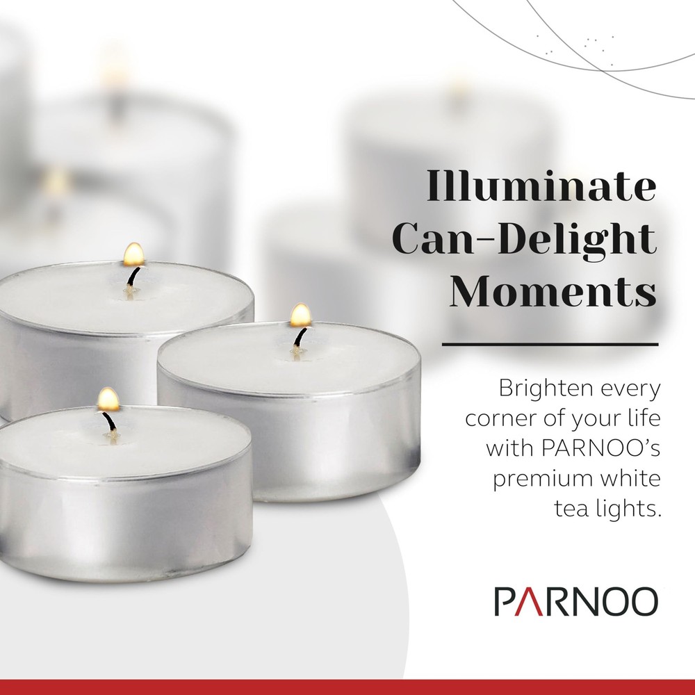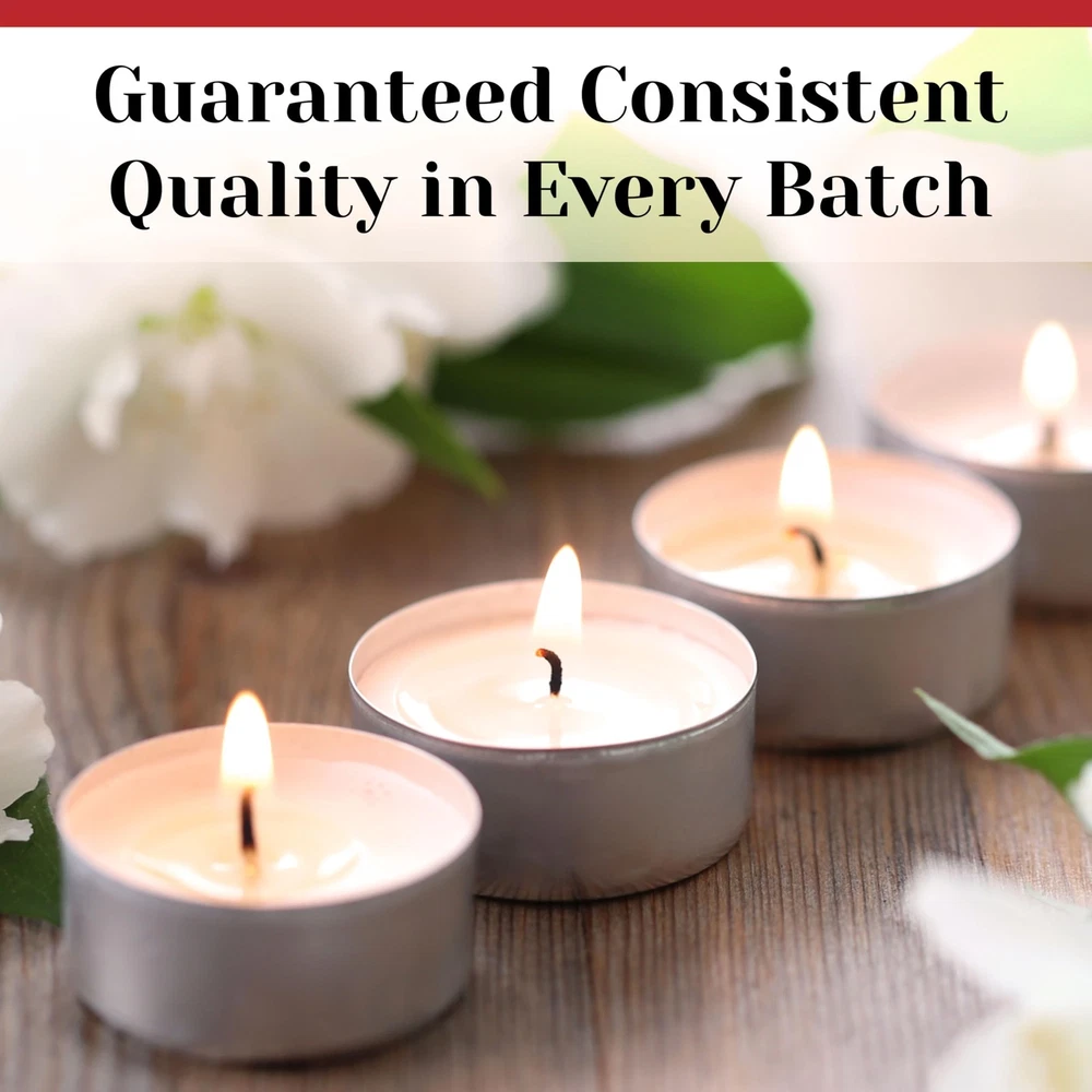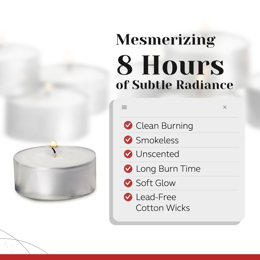 Illuminate Can-Delight Moments with 's Tealight Candles Brighten every corner of your life with 's premium collection of white tea lights. Each small candle sits snugly in a metal cup, ensuring stability and ease of placement in a variety of settings, from tealight candle holder to mason jars. Whether you're setting the mood for a romantic dinner, lighting up a cozy lantern, keeping your food warm, or preparing for an unexpected power outage, these bulk candles are your go-to solution. Experience the serenity of clean, soot-free burning with our meticulously crafted candle pack. Our unscented votive candles and tea lights candles promise an ambiance free from clogged nostrils and unsightly stains, ensuring a pure and unadulterated glow. Our long burning candles are designed to last. Crafted from high-quality wax with a lead-free cotton wick, these long lasting candles promise a continuous, steady flame for up to 8 hours. Say goodbye to frequent relighting and embrace uninterrupted warmth and candle light, making them perfect as both romantic candles and emergency candles long burning. Our long lasting tea lights serve as the ultimate accessory for creating a magical atmosphere. Ideal for grand occasions or intimate moments, these small tea light candles transform any space into a haven of relaxation and romance. Product Features Clean Burning Unscented Long Burn Time Soft Glow Wax & Lead-Free Cotton Encased in Metal Cups Fits Most Standard Votive Holders Lanterns Mason Jars Potpourri Burners Luminaries Romantic Centerpiece Other Decorative Holders About Us Discover the world of , where we bring you a diverse selection of candles that effortlessly enhance any atmosphere, decor theme, and occasion. We believe in creating a timeless ambiance that you can share with your loved ones. At , each flicker of our candles transforms moments into connections and celebrations, enriching the beauty and elegance of your gatherings. Clean Flames in Every Flicker: Soothe your senses with our soot-free, clean-burning, unscented votive candles and tealight candles bulk set — no more clogged nostrils or unsightly stains on fabrics!