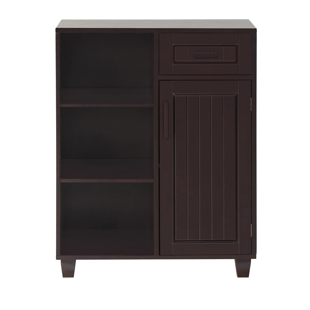 Upgrade your home storage while adding classic decor with the Teamson Home Catalina Wooden Floor Cabinet with Storage Drawer. This decorative cabinet features a sleek espresso finish and a crown molded door for a beautiful addition to your space. The included top drawer, 3 open shelves, and inner adjustable shelf help to reduce clutter and keep your home tidy. Constructed from durable engineered wood, this floor cabinet is built to provide you with long-lasting organization. Easy, step-by-step instructions and all of the hardware needed for installation are included for quick assembly. Purchase this stylish cabinet alone or with other items from the Catalina collection for a cohesive, updated look. The Teamson Home Catalina Wooden Floor Cabinet with Storage Drawer measures 15.5" x 26" x 34 Teamson Home Catalina Mixed Storage Freestanding Floor Cabinet Features Dark espresso finish with beadboard-paneled doors and wooden pull handles Two exterior adjustable shelves on one side of the cabinet and one interior adjustable shelf inside Constructed from durable engineered wood, less likely to warp, crack, or rot to provide long-lasting use Easy step-by-step instructions and all of the hardware needed for installation included Dimensions: 15.51" L x 25.98" W x 34.29" H SKU:7718 The Teamson Home Catalina Wooden Mixed Storage Freestanding Floor Cabinet features a sleek espresso finish with a beadboard paneled door and crown molding for a timeless addition to your space. Two open exterior adjustable shelves flank the left side of the cabinet while storage is hidden away on the right in a top drawer and small cabinet with an adjustable shelf inside. Constructed from durable engineered wood, this modern-styled floor cabinet provides you with long-lasting organization.
