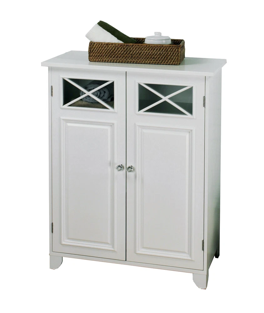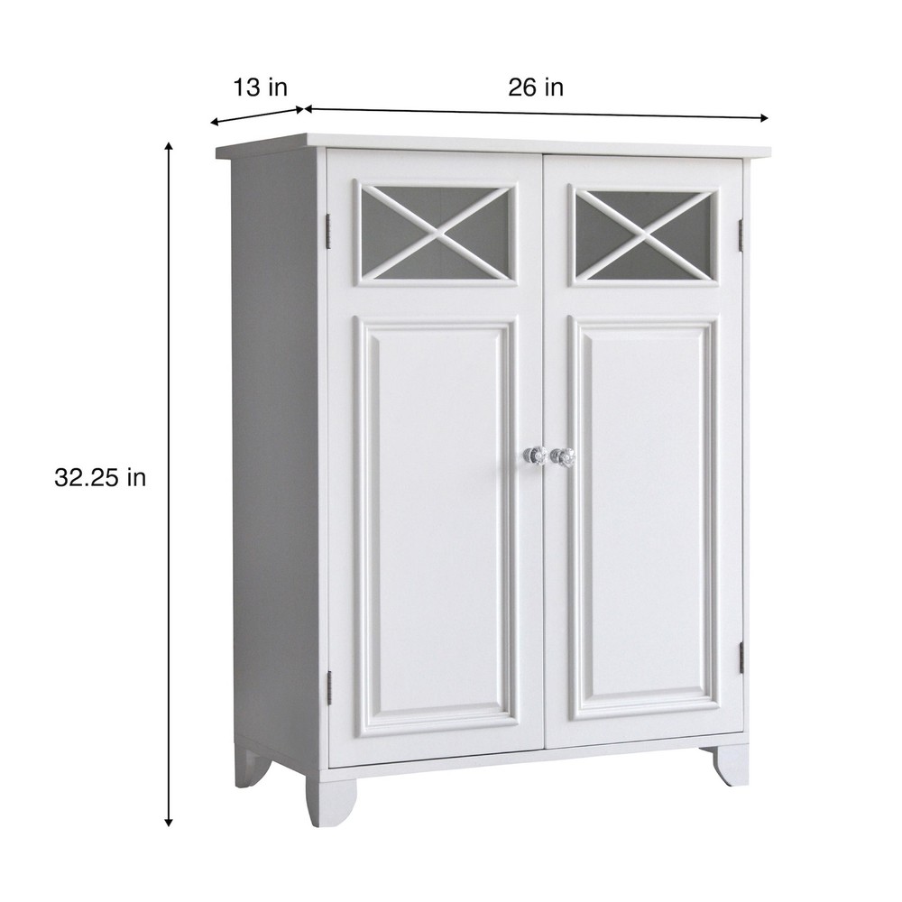 Upgrade your home storage while adding classic decor with the Teamson Home Dawson Wooden Floor Cabinet with Cross Molding and 2 Doors. This decorative cabinet features a white finish with cross molding on the glass-paneled doors and clear knobs for a beautiful addition to your space. The included fixed shelf and adjustable shelf help to reduce clutter and keep your home tidy. Constructed from durable engineered wood, this floor cabinet is built to provide you with long-lasting organization. Easy, step-by-step instructions and all of the hardware needed for installation are included for quick assembly. Purchase this stylish cabinet alone or with other items from the Dawson collection for a cohesive, updated look Teamson Home Dawson Two-Door Freestanding Floor Cabinet Features Features a classic white finish with cross molding on the glass-paneled doors and clear knobs for a beautiful addition to your space Features fixed shelf and adjustable shelf inside with magnetic latches to keep it closed Constructed from durable engineered wood, less likely to warp, crack, or rot to provide long-lasting use Easy step-by-step instructions and all of the hardware needed for installation included Dimensions: 25.98" L x 12.99" W x 32.24" H SKU:6841 Teamson Home Dawson Wooden Two-Door Freestanding Floor Cabinet features a white finish with decorative cross molding on two glass-paneled doors. Made of durable, engineered wood, it has a fixed and adjustable interior shelf for organization. Add extra storage for bathroom and kitchen supplies, or as a decorative piece to keep items organized and your home clutter-free.