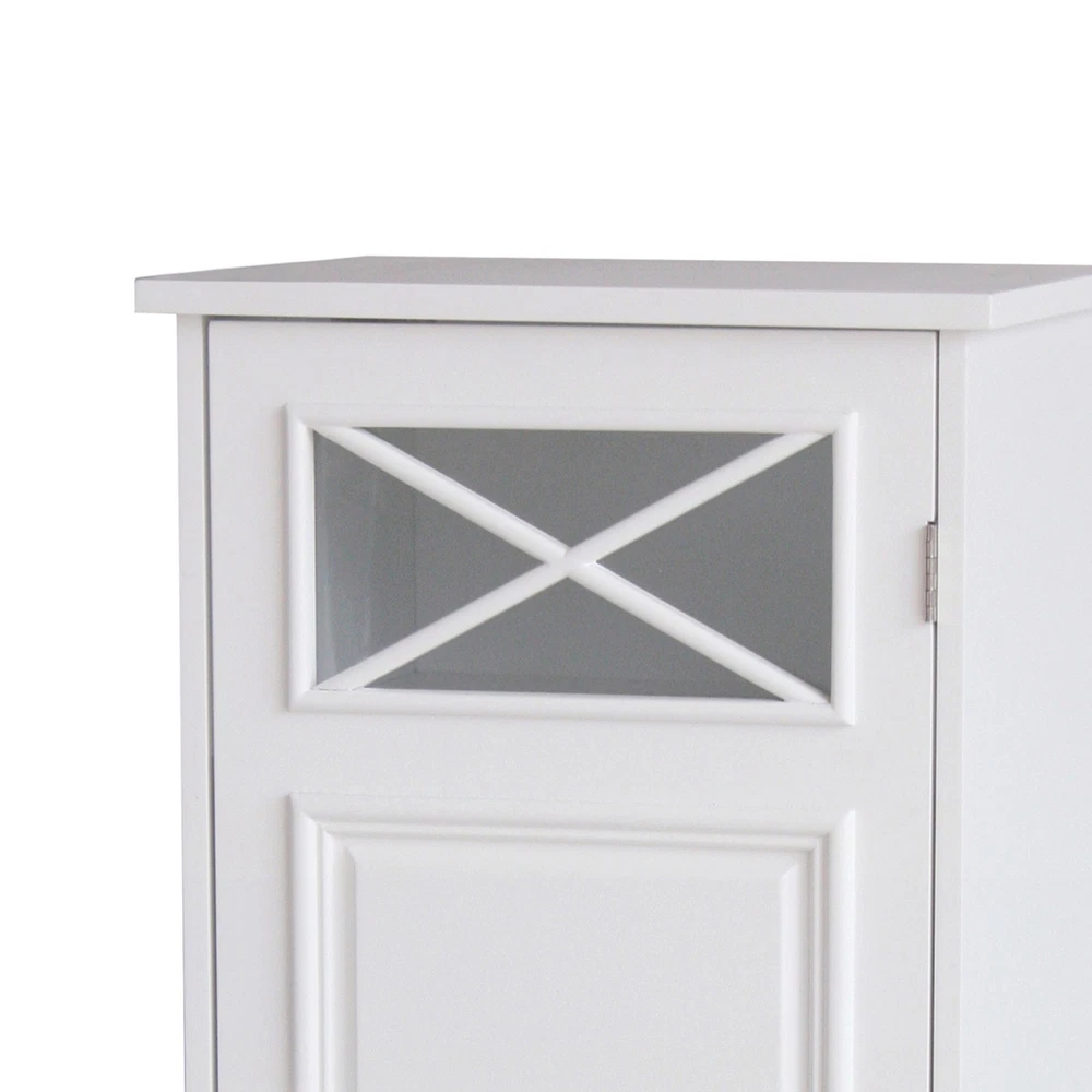 Upgrade your home storage while adding classic decor with the Teamson Home Dawson Wooden Floor Cabinet with Cross Molding. This decorative cabinet features a white finish with cross molding on the glass-paneled door and a clear knob for a beautiful addition to your space. The included fixed shelf and adjustable shelf help to reduce clutter and keep your home tidy. Constructed from durable engineered wood, this floor cabinet is built to provide you with long-lasting organization. Easy, step-by-step instructions and all of the hardware needed for installation are included for quick assembly. Purchase this stylish cabinet alone or with other items from the Dawson collection for a cohesive, updated look Teamson Home Dawson Freestanding Slim Floor Cabinet, White Features Features a classic white finish with cross molding on the glass-paneled door and clear knobs for a beautiful addition to your space Features three interior shelves for organization inside with magnetic latches to keep it closed Constructed from durable engineered wood, less likely to warp, crack, or rot to provide long-lasting use Easy step-by-step instructions and all of the hardware needed for installation included Dimensions: 12.99" L x 15.0" W x 32.01" H SKU:6834 Teamson Home's Dawson Freestanding Slim Floor Cabinet features a white finish with decorative cross molding on a glass-paneled doors. Made of durable, engineered wood, it has three fixed interior shelves for storage and organization anywhere. Add extra storage for bathroom and kitchen supplies, or as a decorative piece to keep items organized and your home clutter-free.