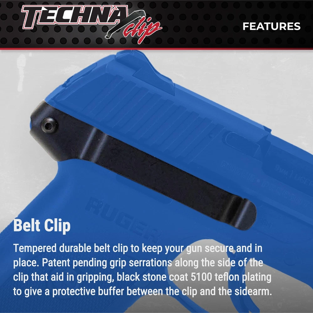 Are you tired of holsters that are bulky and bulgy? Are you ready for an amazingly comfortable and fast method for concealing your sidearm? Then, check out the Techna Clip for the Ruger LCP.380, a truly minimalist solution for those who conceal carry. It's a gun clip that easily affixes to your sidearm to deliver a secure, lightweight and discreet carry option without a holster. Your Techna Clip installs quickly and requires NO gunsmithing to your sidearm. Now you can stash your pistol in your pocket, on your waist, or even in the small of your back. Included in the Techna Clip kit is a fully-machined tapped and threaded steel replacement pin for attaching the Techna Clip to the Ruger LCP.380, a spring tempered Belt Clip made from High Carbon Spring Steel, plated with Black Teflon Stone Coat 5100, 2 screws (1 extra), 2 locking washers (1 extra), 1 Allen wrench. The high quality Teflon Stone Coat 5100 coating prevents abrasion to the sidearm by providing a thin but highly durable cushion between the Techna Clip and the slide. The Techna Clip comes in (black) and fits the Ruger LCP.380 models. This model will not fit the Ruger LC9/S or LC models; please see our other listings. Instructions: To install, simply remove the Ruger factory rear frame pin from the frame of the sidearm with a punch and mallet. Then, replace the rear frame pin with the replacement pin that was provided in the Techna Clip kit. Mount the Techna Clip on the right side of the slide with the provided screws and Allen wrench. Note: To keep the clip securely in place, the screw hole is slightly offset from the rear frame pin. Why buy a Techna Clip? Our Concealment System helps you eliminate the bulk and printing of your daily conceal-carry gun. Say goodbye to your bulky holsters that add unnecessary weight and discomfort. Conceal and carry on the go with our easy “Clip It & Go” system!" Instructions: To install, simply remove the Ruger factory rear frame pin from the frame of the sidearm with a punch and mallet. Then, replace the rear frame pin with the replacement pin that was provided in the Techna Clip kit. Mount the Techna Clip on the right side of the slide with the provided screws and Allen wrench. Note: To keep the clip securely in place, the screw hole is slightly offset from the rear frame pin. Why buy a Techna Clip? Our Concealment System helps you eliminate the bulk and printing of your daily conceal-carry gun. Say goodbye to your bulky holsters that add unnecessary weight and discomfort. Conceal and carry on the go with our easy “Clip It & Go” system! LOW PROFILE CONCEALMENT: Minimize bulk and printing with our gun clip holster concealment system, designed for seamless, low-profile concealed carry. BUILT FOR DURABILITY: Our high-carbon spring steel Glock clip holster is plated with Teflon Stone Coat 5100 for enhanced durability and corrosion resistance. It also includes grip plate replacement screws. EASY INSTALL: First, remove the rear frame pin from the gun's frame. Then, replace it with the provided threaded pin from Techna Clip. Finally, mount the gun holster clip on the right side of the slide using the included screws and Allen key. PERFECT MODEL MATCH: This holster belt clip is only compatible with compatible with Ruger LCP .380 ACP Pistols (it is not compatible with Ruger LC9/S or LC models). THE TECHNA CLIP WAY: We focus on minimalist firearm carry solutions that ensure a secure and discreet way to carry handguns, eliminating the bulk and hassle of other holsters. We provide a comfortable, zero-bulk alternative that’s user-friendly.
