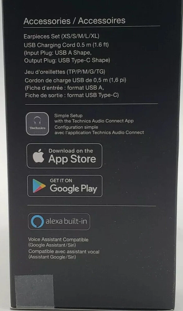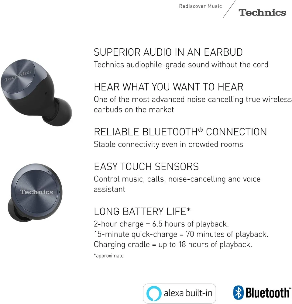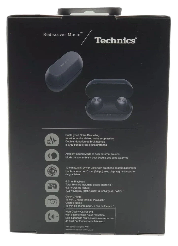 Technics True Wireless Earbuds with Industry Leading Noise Cancelling, Bluetooth Earbuds, Dual Hybrid Technology, Hi-Fi Sound, Compact Design, Alexa Compatible, Black Key Features Dual Hybrid Noise Cancelling Technology Technics’ newly-developed, proprietary Dual Hybrid Noise Cancelling Technology combines analog and digital processing for one of the best noise-cancelling true wireless earbuds on the market. With Feedforward and Feedback methods, experience effective noise cancellation while listening to your favourite music. Turn on ambient noise amplification when you want to hear external sound. Technics Sound Technology uses a wide ⌀10mm dynamic driver, creating a wide sound field and space perception that sounds like it's coming from much larger speakers. The earbuds are also treated with graphene coating to increase their strength and reduce components vibrating unnecessarily in the diaphragm, creating an elegant vocal sound. The Acoustic Control Chamber positioned behind the driver precisely controls the airflow to the front & back of the diaphragm for optimising the driver performance. Elegant & Stylish Design A compact circular design has been adopted for the EAHAZ70W true wireless earbuds. A spin treatment that symbolises the high-quality design of Technics headphones has been applied to the ornamental part to achieve a high-grade appearance. The charging cradle has a lightweight and high-grade appearance with the aluminium material, and features an upper surface hairline and engraved logo that marks the true Technics hi-fi audio quality. Reliable Connection The Left-Right Independent Signalling System helps maintain a stable connection with proper sound balance between right and left channels. The high performance MEMS microphone and labyrinth cabinet structure, combined with the beamforming technology deliver excellent voice call quality. Audiophile-Grade Sound Large 10mm dynamic driver adopting graphene coated PEEK diaphragm and acoustic control chamber are designed to deliver a dynamic feeling. Excellent Call Quality Beamforming technology and high performance MEMS mic reduce wind noise and transmit voice clearly. Control at Your Fingertips Dual touch sensors allow you to easily control music playback, volume and tracks, as well as receive, reject or end calls, manage noise-cancelling and ambient sound amplification, and interact with voice assistant. Long Battery Life 2-hour charge = 6.5 hrs of playback*. Charging cradle provides up to 18 hrs playback*. *approximate General Features and More Info Water Resistant IPX4 water resistance protects from sweat and splashes. Lightweight, Comfortable Fit Comes with 5 earpiece sizes for the perfect, comfortable fit (XS, S, M, L, XL). Technics Audio Connect App Various functions are available by installing the free Technics Audio Connect app onto your smartphone - it enables easy pairing and initial settings. IMPORTANT INFO While we do our best to describe the item and take utmost care to package it but as humans we are capable of making mistakes. We sell a lot of open box items and that is why you always get the best prices in our store but expectations could vary for every buyer. If there is ANY issue with the product you have received, please contact us and we will rectify the issue. After any transaction ebay gives you a chance to leave feedback and DSR ratings for the seller. We strive for a 100% positive feedback and 5 Star EBAY DSR ratings. Please contact us if you plan to leave any less than a 5 star rating for us. We will do our best. This is our promise. If you are unhappy and would like to return the item, we will do that gladly. We will get the item back and will issue a full refund. You can buy from us with complete confidence. Warranty We offer a warranty period for all our products which is mentioned in the listings, during which we will be happy to replace the item, if we are unable to provide a replacement or repair the item, we will issue a full refund. Contact us We can be contacted at any time through eBay messages if you have any questions, comments or product requests. We will respond to you within 48 hours and do our best to help you out! We encourage our customers to contact us with any questions or concerns! We'd like to be sure you are completely satisfied with your purchase. Why Buy From Us While there are tons of open box products being sold on ebay, we are different in our approach towards consumer satisfaction. We stand behind our sales & hold full responsibility towards what we sell. Our items are fully tested and functional and ship with all required peripherals and manuals (electronic manuals are provided where paper manual is not available), packaged nicely.