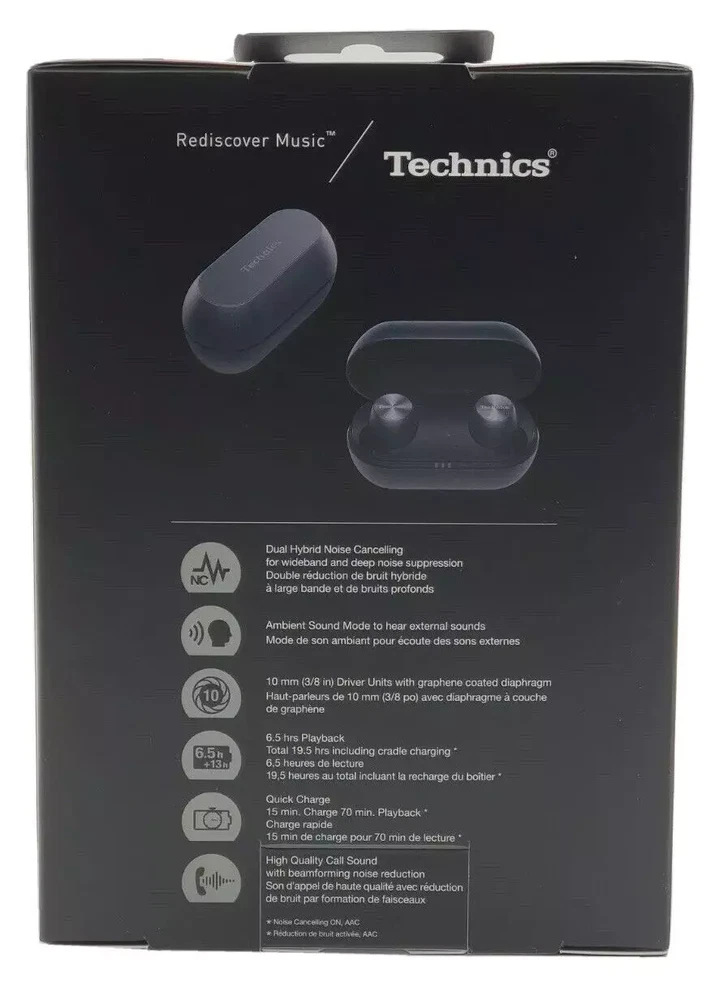 Technics True Wireless Earbuds with Industry Leading Noise Cancelling, Bluetooth Earbuds, Dual Hybrid Technology, Hi-Fi Sound, Compact Design, Alexa Compatible, Black Key Features Dual Hybrid Noise Cancelling Technology Technics’ newly-developed, proprietary Dual Hybrid Noise Cancelling Technology combines analog and digital processing for one of the best noise-cancelling true wireless earbuds on the market. With Feedforward and Feedback methods, experience effective noise cancellation while listening to your favourite music. Turn on ambient noise amplification when you want to hear external sound. Technics Sound Technology uses a wide ⌀10mm dynamic driver, creating a wide sound field and space perception that sounds like it's coming from much larger speakers. The earbuds are also treated with graphene coating to increase their strength and reduce components vibrating unnecessarily in the diaphragm, creating an elegant vocal sound. The Acoustic Control Chamber positioned behind the driver precisely controls the airflow to the front & back of the diaphragm for optimising the driver performance. Elegant & Stylish Design A compact circular design has been adopted for the EAHAZ70W true wireless earbuds. A spin treatment that symbolises the high-quality design of Technics headphones has been applied to the ornamental part to achieve a high-grade appearance. The charging cradle has a lightweight and high-grade appearance with the aluminium material, and features an upper surface hairline and engraved logo that marks the true Technics hi-fi audio quality. Reliable Connection The Left-Right Independent Signalling System helps maintain a stable connection with proper sound balance between right and left channels. The high performance MEMS microphone and labyrinth cabinet structure, combined with the beamforming technology deliver excellent voice call quality. Audiophile-Grade Sound Large 10mm dynamic driver adopting graphene coated PEEK diaphragm and acoustic control chamber are designed to deliver a dynamic feeling. Excellent Call Quality Beamforming technology and high performance MEMS mic reduce wind noise and transmit voice clearly. Control at Your Fingertips Dual touch sensors allow you to easily control music playback, volume and tracks, as well as receive, reject or end calls, manage noise-cancelling and ambient sound amplification, and interact with voice assistant. Long Battery Life 2-hour charge = 6.5 hrs of playback*. Charging cradle provides up to 18 hrs playback*. *approximate General Features and More Info Water Resistant IPX4 water resistance protects from sweat and splashes. Lightweight, Comfortable Fit Comes with 5 earpiece sizes for the perfect, comfortable fit (XS, S, M, L, XL). Technics Audio Connect App Various functions are available by installing the free Technics Audio Connect app onto your smartphone - it enables easy pairing and initial settings. IMPORTANT INFO While we do our best to describe the item and take utmost care to package it but as humans we are capable of making mistakes. We sell a lot of open box items and that is why you always get the best prices in our store but expectations could vary for every buyer. If there is ANY issue with the product you have received, please contact us and we will rectify the issue. After any transaction ebay gives you a chance to leave feedback and DSR ratings for the seller. We strive for a 100% positive feedback and 5 Star EBAY DSR ratings. Please contact us if you plan to leave any less than a 5 star rating for us. We will do our best. This is our promise. If you are unhappy and would like to return the item, we will do that gladly. We will get the item back and will issue a full refund. You can buy from us with complete confidence. Warranty We offer a warranty period for all our products which is mentioned in the listings, during which we will be happy to replace the item, if we are unable to provide a replacement or repair the item, we will issue a full refund. Contact us We can be contacted at any time through eBay messages if you have any questions, comments or product requests. We will respond to you within 48 hours and do our best to help you out! We encourage our customers to contact us with any questions or concerns! We'd like to be sure you are completely satisfied with your purchase. Why Buy From Us While there are tons of open box products being sold on ebay, we are different in our approach towards consumer satisfaction. We stand behind our sales & hold full responsibility towards what we sell. Our items are fully tested and functional and ship with all required peripherals and manuals (electronic manuals are provided where paper manual is not available), packaged nicely.