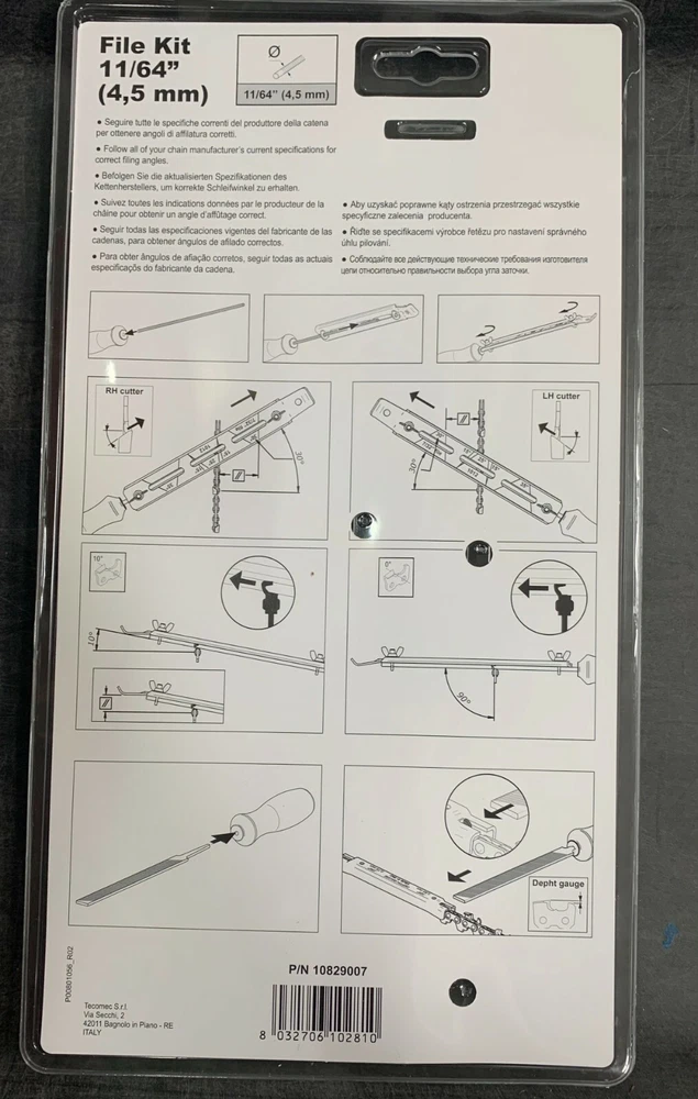 Tecomec Deluxe Chainsaw Sharpening kit, this kit is used to sharpen .325 chisel chain. This filer comes with a 11/64" file, however you can use any size chainsaw round file in file holder. This professional high quality filing kit comes with the chainsaw chain filing guide (file holder), (1) 11/64" chainsaw round file and (1) 6" flat file for depth gauges, both these files are "top" quality Vallorbe Swiss made files! Also included is (2) filing handles one for each file and (1) depth gauge tool made in Italy. The kit also includes filing instructions. To order this same kit that includes (3) 7/32" files please see our listing number: 385864725634 We have a limited supply of these so when there're gone there're gone! Tecomec is an Italian company established in 1985 and is located in the Reggio Emilla region, this area is renowned worldwide for its top in quality technology. Tecomec also has locations in China, France, United States, South America, Maroc and South Africa. Tecomec is a company of the Emak Group which, in turn, belongs to the Yama Group with over 30 companies affiliates and represents the biggest Italian group engaged in the design, production and sales of farming, gardening and forestry applications.
