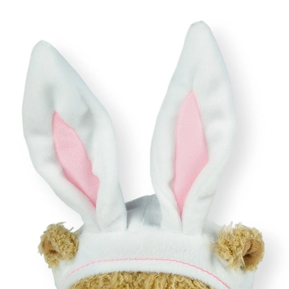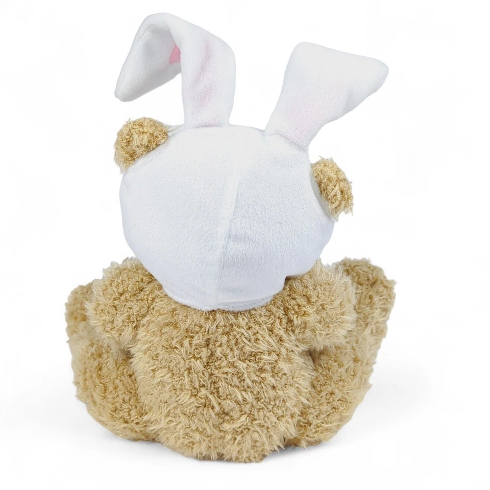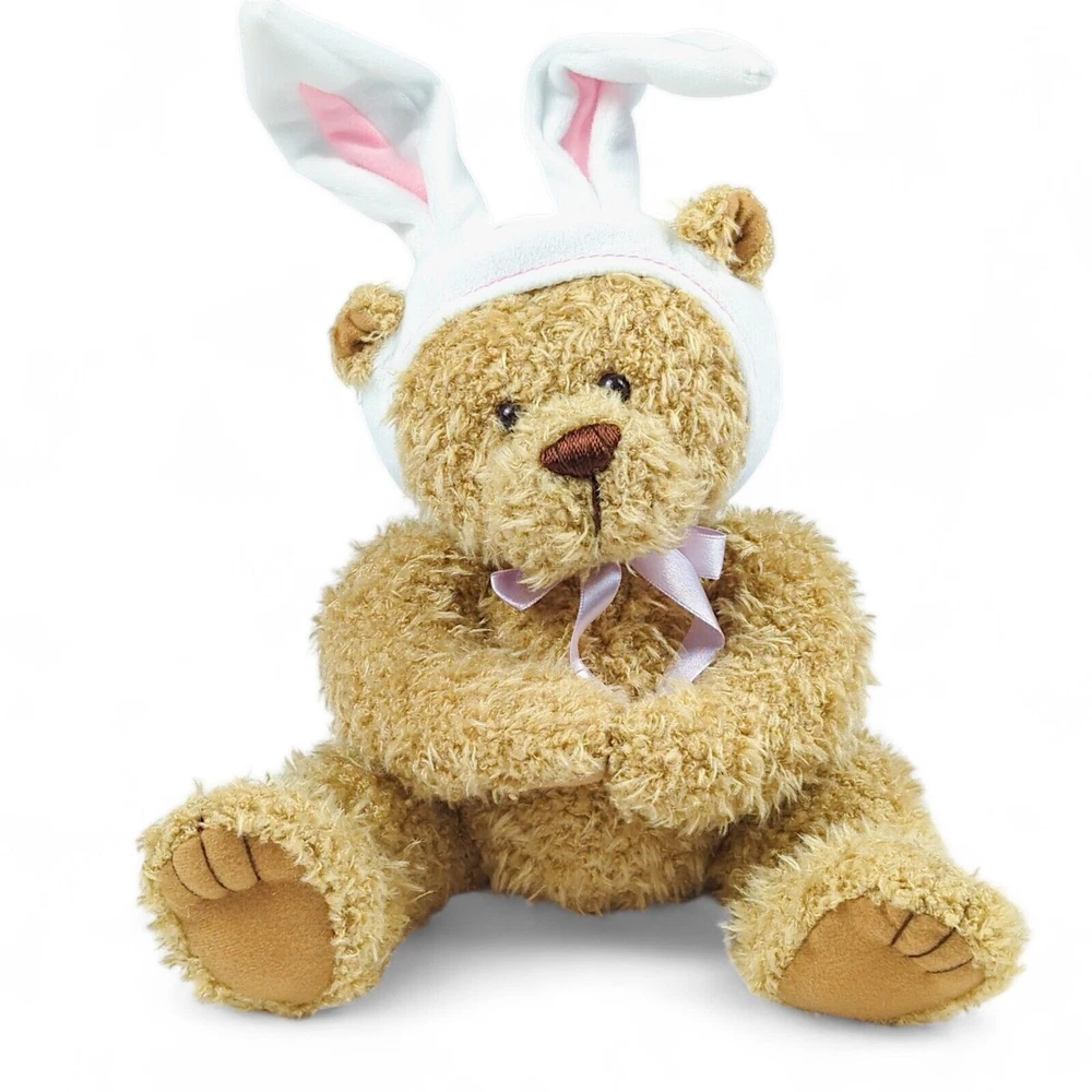 Plush Stuffed Easter Teddy Bear • Brown Bear wearing white bunny ears • Flexible wire in the ears allows you to bend and shape the ears into place • Ear headpiece is tied around the neck with the ribbon, but the bow is attached to the bear's neck and therefore the ear headpiece is not removable • Paws are connected together in front • While seated, bear itself is approximately 9" wide and 8" tall not including ears -- add another 4.5" with ears This is a pre-owned, used item in good condition. No stains, holes, or loose seams.