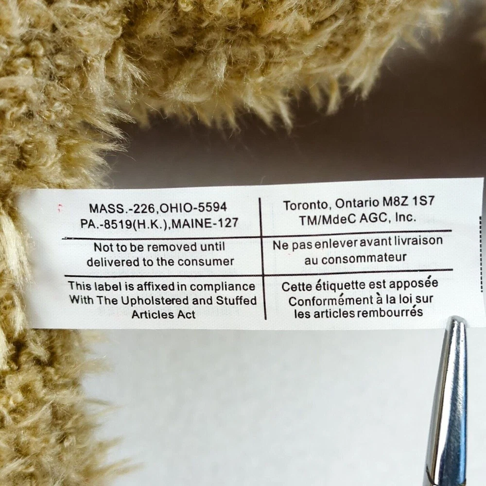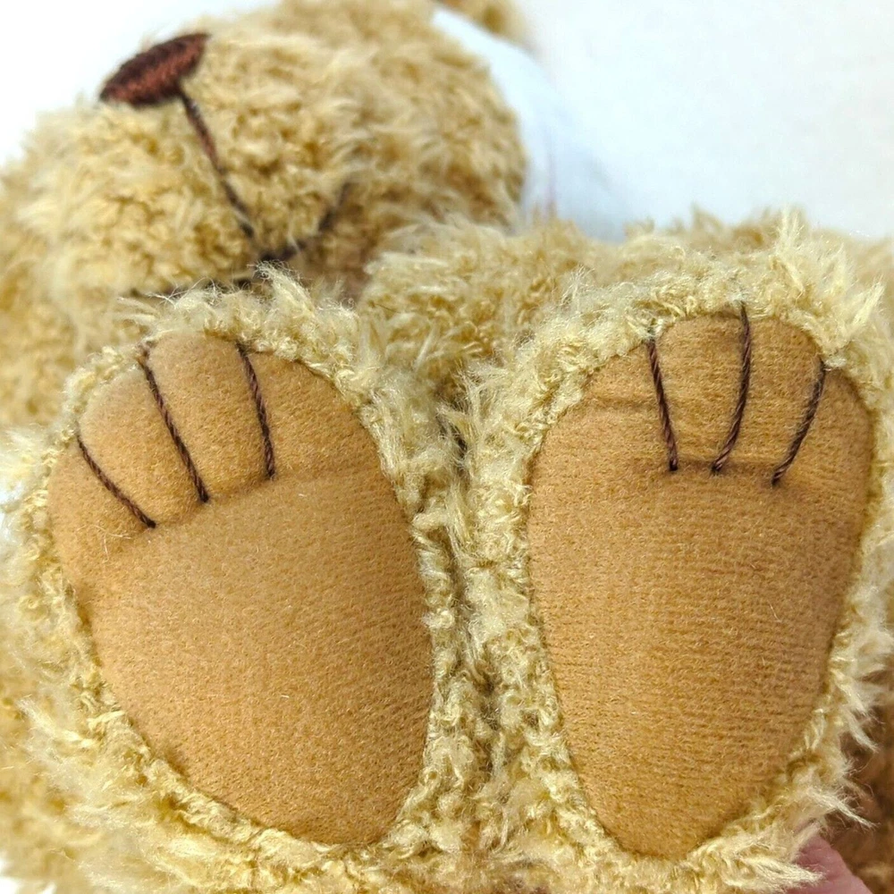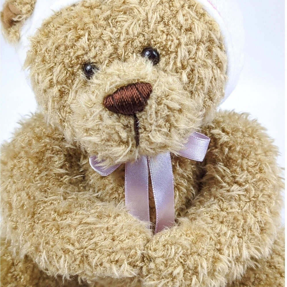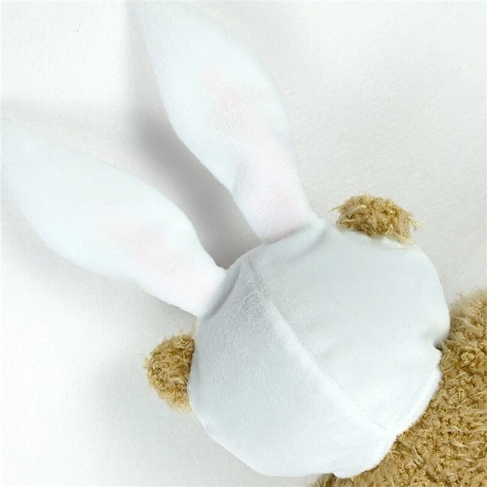 Plush Stuffed Easter Teddy Bear • Brown Bear wearing white bunny ears • Flexible wire in the ears allows you to bend and shape the ears into place • Ear headpiece is tied around the neck with the ribbon, but the bow is attached to the bear's neck and therefore the ear headpiece is not removable • Paws are connected together in front • While seated, bear itself is approximately 9" wide and 8" tall not including ears -- add another 4.5" with ears This is a pre-owned, used item in good condition. No stains, holes, or loose seams.
