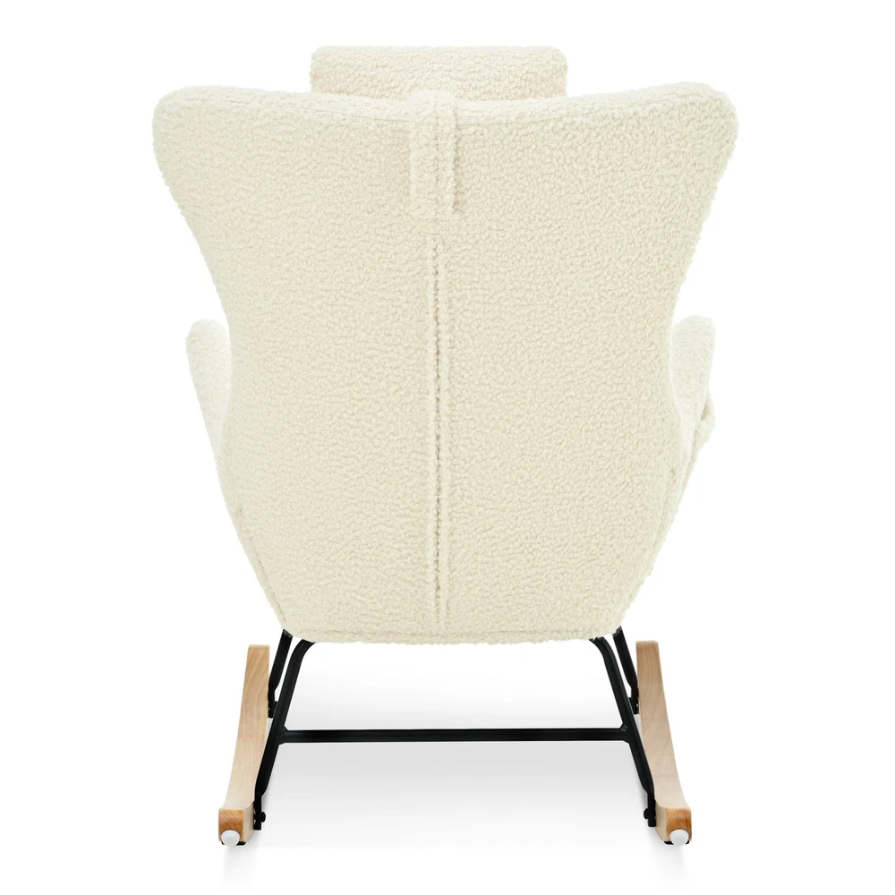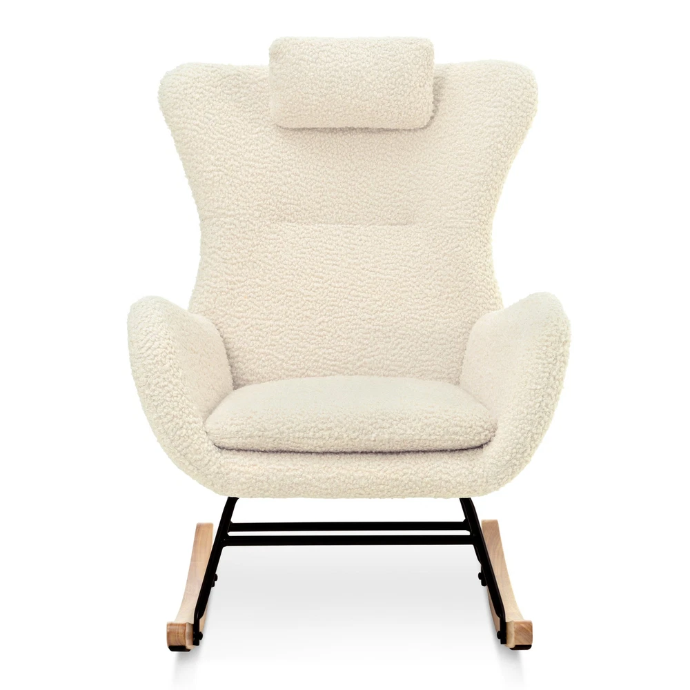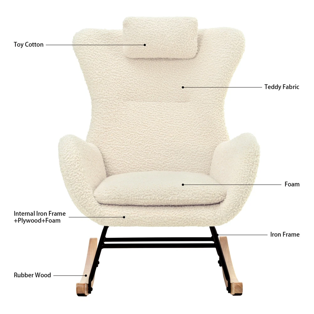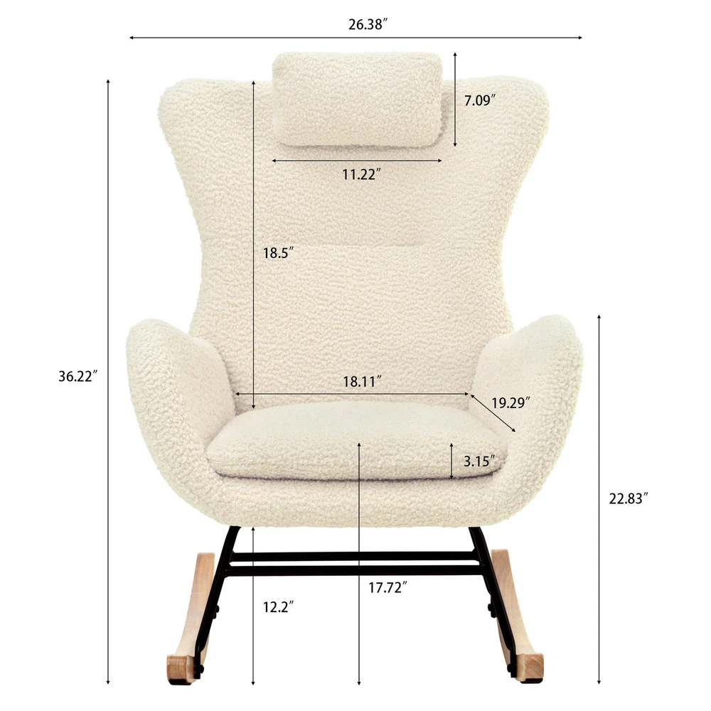 Specifications Place of Origin China Main Color Beige Main Material Polyester Dangerous Goods #dangerFlag# Dimensions & Weights Assembled Length (in.) 26.38 Assembled Width (in.) 34.25 Assembled Height (in.) 36.22 Weight (lbs) 24.20 Product Features ★ Various colors available ★ The seat area is wide, and the backrest and seat cushion are filled with high-density sponge, which is more elastic and not easy to deform, and conforms to ergonomic standards and human functions. ★ The overall frame is made of iron and plywood to ensure structural safety. The base is supported by metal iron frame and rubber, which further improves the stability of the rocking chair without worrying about instability, and is suitable for long-term use. ★ The rocking chair has a very soft cushion, which can provide you with enough wide space. The wide and high backrest provides you with great comfort, which can provide strong support for your whole body. The headrest can adjust its height, which will effectively support your neck and head. Combined with the rocking design, it can relax your body as much as possible. In addition, it is also a good gift for parents and friends. ★ The side hanging pocket design can release space and store easily. ★ The anti-skid pad at the end of the wooden leg provides a soothing effect. The swing is not more than 30 degrees, which is designed according to the most comfortable swing rhythm of the human body. It is not only suitable for the elderly to sit on the chair and read newspapers, but also suitable for the mother to sit on the chair and let the baby sleep. ★ Use high-quality hardware connection, easy to install and durable. Just follow the instructions to install and enjoy in a few steps. Description Weights & Dimensions & Description Product Type: Rocking Chair Product size: 26.38 'W* 34.25'D *36.22 'H Seat Length: 18.11 ' Seat Depth: 19.29' Seat Hight: 17.72'