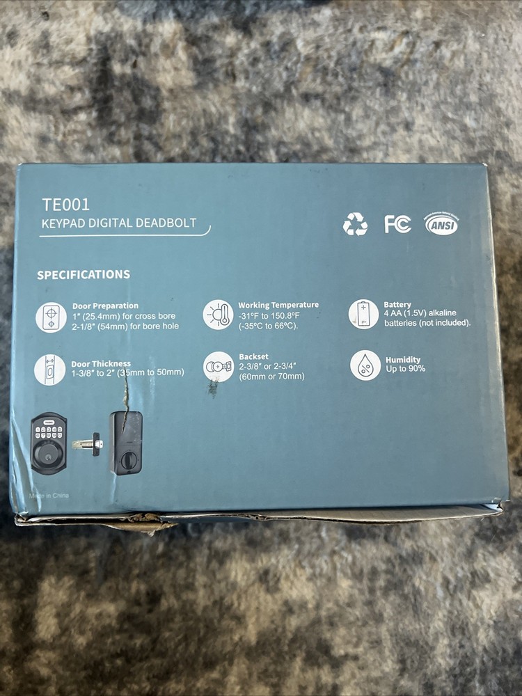 The Teeho TE001 Keypad Digital Deadbolt is a modern, electronic entry door lock designed for security and convenience. It boasts a sleek black, oval shape with a satin finish and is made of durable zinc material. The lock is suitable for a variety of doors, including front entrance doors, closet doors, and commercial use. Key features of this deadbolt include a one-touch locking mechanism, auto-lock functionality, and the ability to program a one-time pin code or 2D user code for added security. The lock is IP65 waterproof and operates within a temperature range of -22°F to 158°F. The package comes with all necessary items for installation and use, including the deadbolt door lock, latch, strike plate, two standard keys, and both English and Spanish installation and programming instructions.