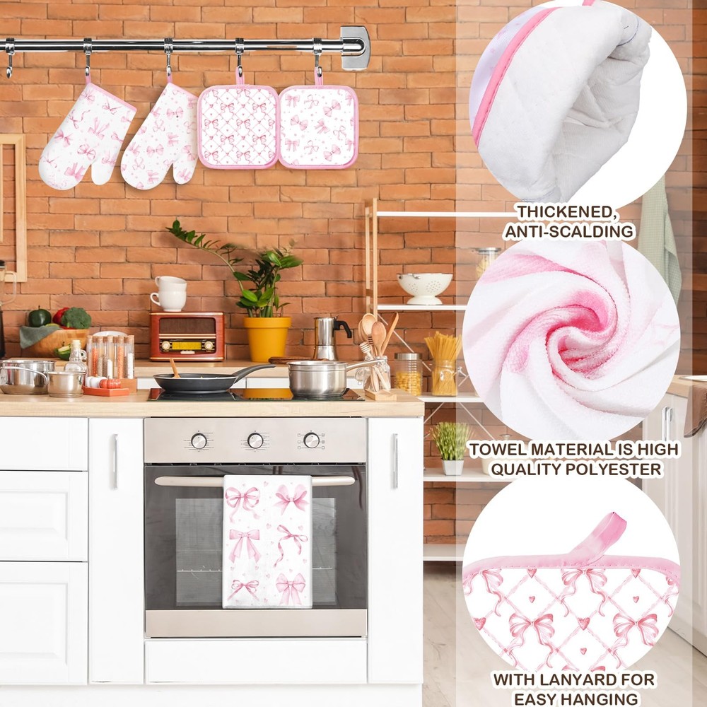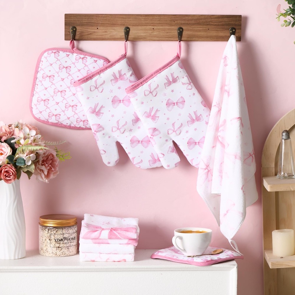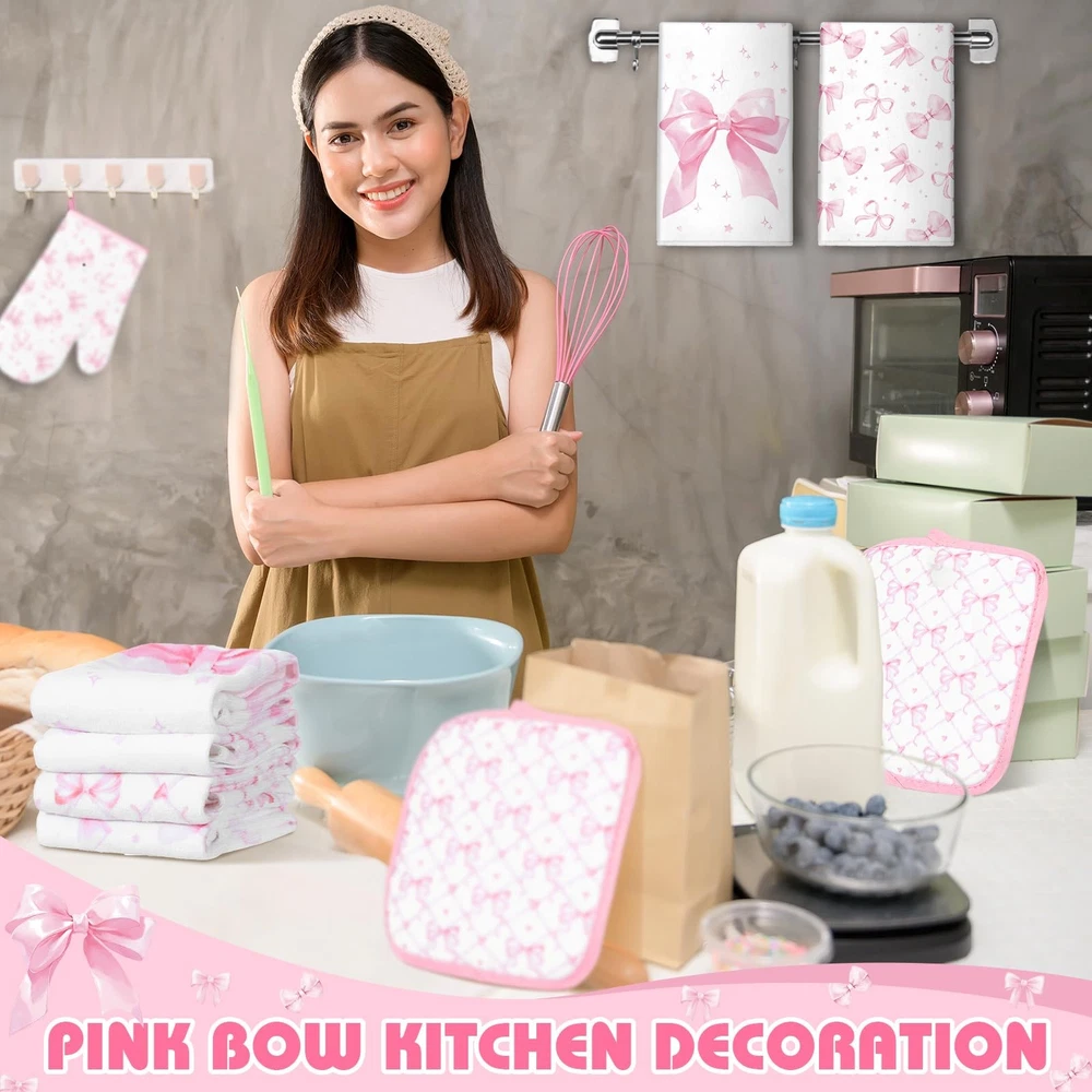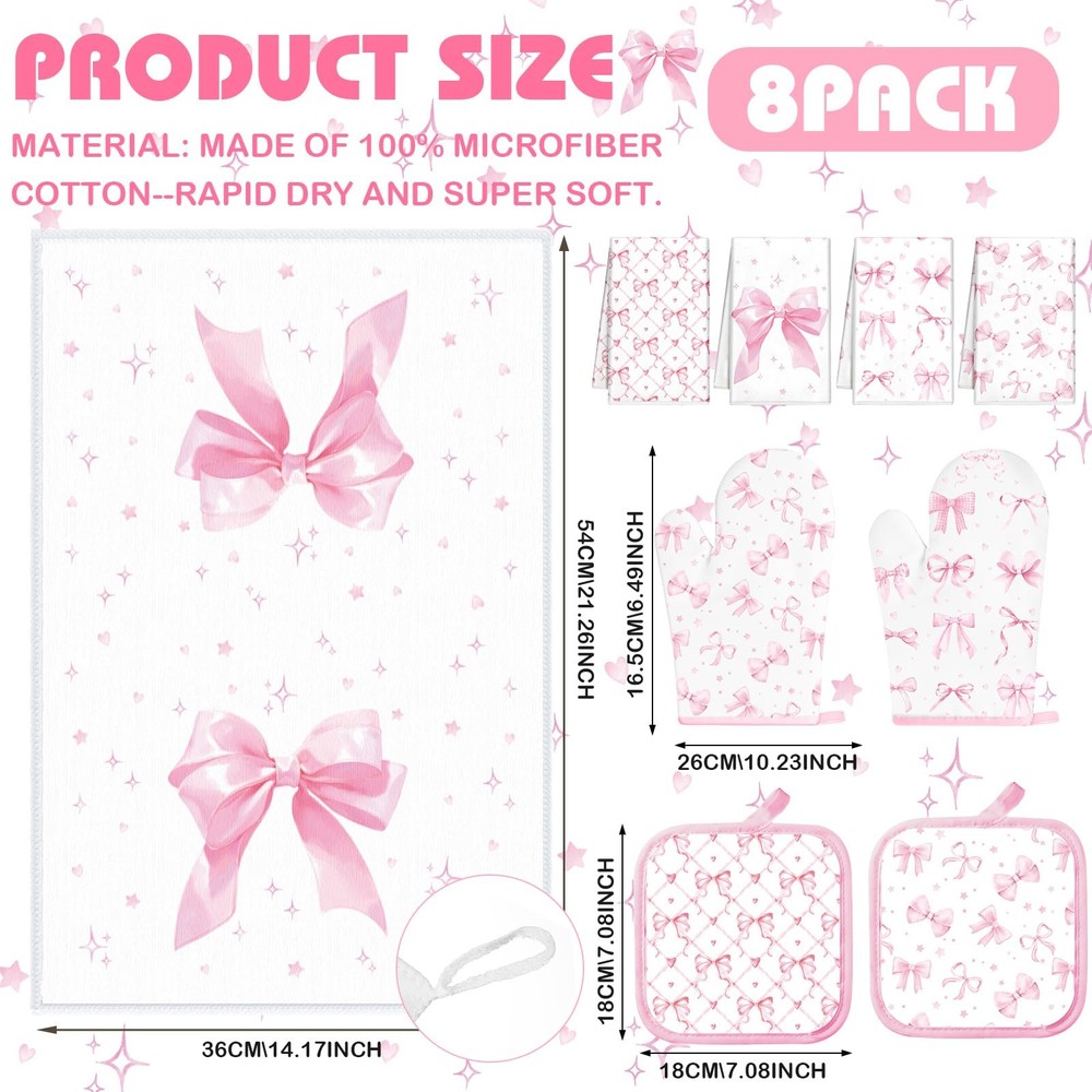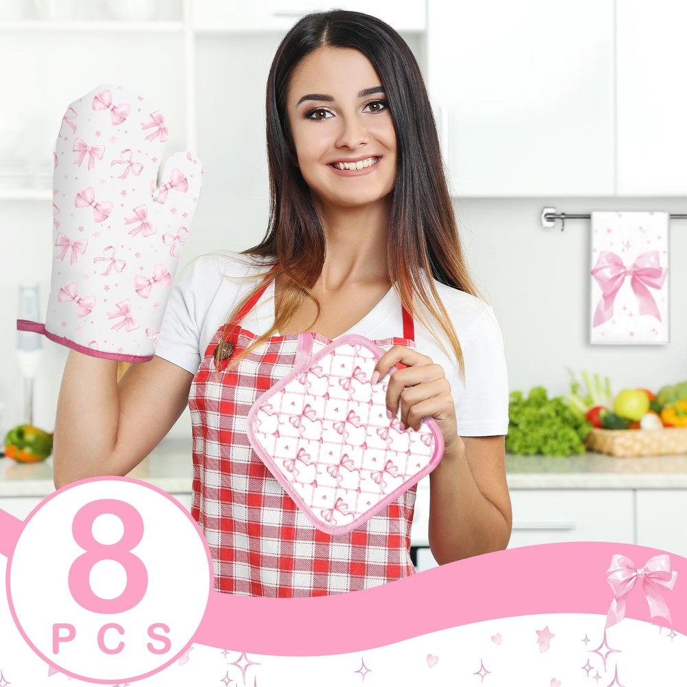 Teenyyou 8 Pcs Pink Bows Kitchen Towels Pot Holders and Oven Mitt Set Coquett...