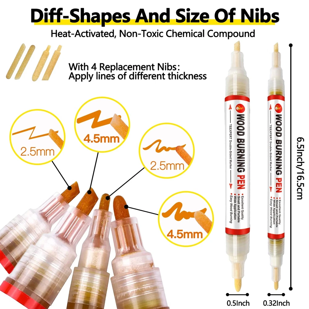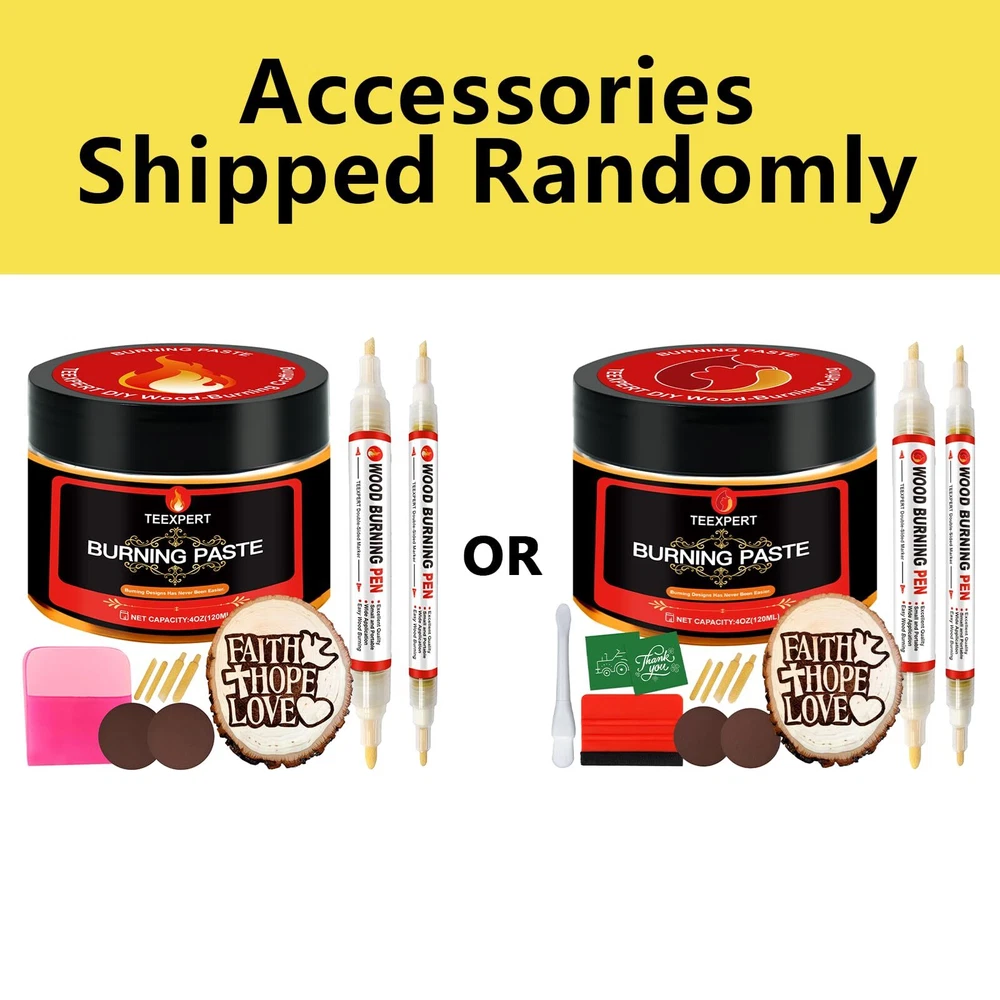 DIY HEAT-ACTIVATED KIT:Transform your wooden projects into stunning works of art with our Wood Burning Kit! Our specially designed kit can burn your designs onto wooden surfaces in just 5-10 minutes. Drawing, heating, and charring are done perfectly, making it a safe, simple, and efficient choice for wood-burning projects. It's perfect for beginners to enjoy creating fun projects at home WOOD BURNING PASTE: With a squeegee and a thin layer of burn paste, 4OZ/125g wood burning gel can be used for drawings on stencil stickers and huge wood pieces. Use a heat gun to burn your design for 1-3 minutes to have the work done. The use of the wood-burning paste is a secure, convenient, and effective solution for traditional heating instruments WOOD BURNING MARKER:Double-Sided scorch pen, The oblique and bullet tips, scorch pen are appropriate for small wooden signage or detailed pattern designs. All you need to do is press the tip of the marker down until ink runs into it and you're ready to start sketching, making it easy for homemade DIY wood projects of both beginners and artists PACKAGE INCLUDES:Teexpert wood-burning gel pen kit includes 1 wood burning paste, 2 wood burning pens, 4 diff-nibs, 1 screen-printing squeegee, and 2 sandpapers. All components are secure and non-toxic, and the paste and ink are both uniforms. Burning designs have never been easier WIDE APPLICABILITY:A NEW HOBBY IS BORN, Our Wood Burning Kit can be used on a wide range of wooden products, from scenes and signs to tables and chairs. It's perfectly ideal for gift-making, crafting, art studios, and more. Perfect gift set for Valentine's Day, Mother's Day(mother day gifts for mom), Father's Day, or Thanksgiving Day