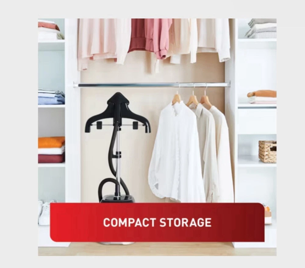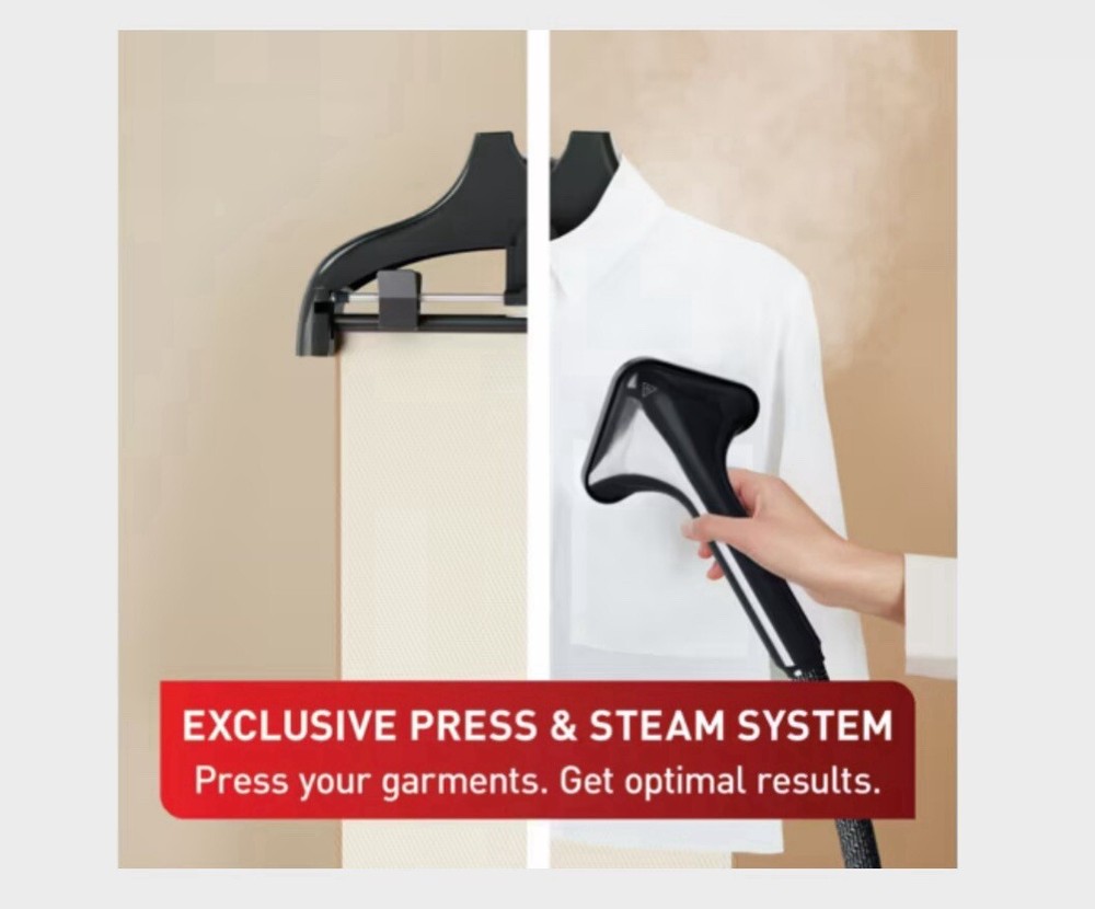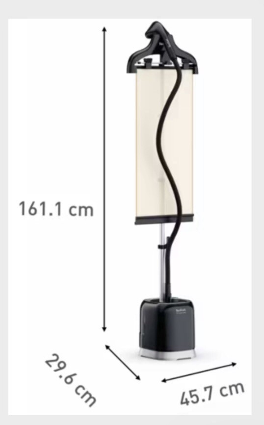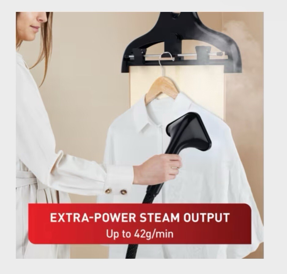 Type: Garment Steamer Steam Output: 42g/pm Wattage: 1800 Water Tank Capacity: 1.5L Removable water tank: Yes Auto shut off: No Cord Storage: Yes Cord Length: 1.8m Additional Features: Large and triangular metal steam head with pointed tip to remove creases efficiently on all fabrics, 45 Second heat up time, Full garment steaming on any fabric in total security, with no risk of burning, tearing or damaging your clothes. Refresh and remove Odors from jackets or other clothing with total ease from the comfort of your own, Metal steam head, Steam control on handle, Steam ready indicator, Steam on demand, Weight 4.75 kg. Included accessories: Thick brush, Steam bonnet, Press and steam curtain