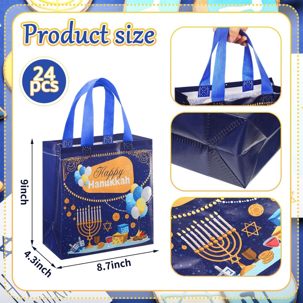 Features: Vibrant Color and Eye Catching Design: These Hanukkah gift tote bags come in the traditional blue color, symbolizing tranquility and spirituality. The hexagrams, candlesticks, and lettering design are intricately designed and shiny, to add a festive touch to your Hanukkah celebrations. The shiny surface captures light and attention, making your gifts stand out Quick and Easy: This is a nice way to quickly wrap a gift, without the trouble of wrapping paper. Will make a bag for those who love to give gifts but don't like to wrap presents. Easy as eating a pie to bring your distinguish gifts to your dear lovers, friends or babies Specifications: Material: non Woven Color: white, navy, blue Size: 9x8.7x4.3 inches Package includes: 24 Pcs Notes: Manual measurement, please allow slight errors on size. The color may exist a slight difference due to different screen displays. Pack of 24 Bags: the package includes 24 Hanukkah reusable bags, which are enough to meet your daily and party uses; It is an ideal choice for Hanukkah parties, family gatherings, and festive events Six Design Styles: including stars, Hanukkah candlesticks, gyroscopes, candles, etc., bring people a warm holiday party atmosphere and impress your guests; These Hanukkah gift tote bags come in the traditional blue color, symbolizing tranquility and spirituality Quality Craftsmanship: the Hanukkah reusable tote bag is Made of non-woven fabric, its sturdy structure and reinforced handle ensure that these bags will not be easily torn, resistant to tearing and wear, ensuring your gifts stay safe and well protected; With easy to carry handles, making it easy to address gifts to friends and family Ideal Dimensions: with dimensions of approx. 9x8.7x4.3 inches, our Hanukkah reusable gift bags with handles offer enough space to tuck in your holiday gifts neatly; Whether it's small toys, candies, books, or clothing, these Hanukkah tote bags can suit a wide range of gift sizes and types, suitable for all your gifting needs Versatility and Utility: these Hanukkah gift wrap bags are not just for Hanukkah gifts; Their elegant design and excellent craftsmanship make them ideal for other occasions, too; You can use these Hanukkah goodie bags at birthdays, anniversaries, and other special occasions for giving gifts or as decorative pieces