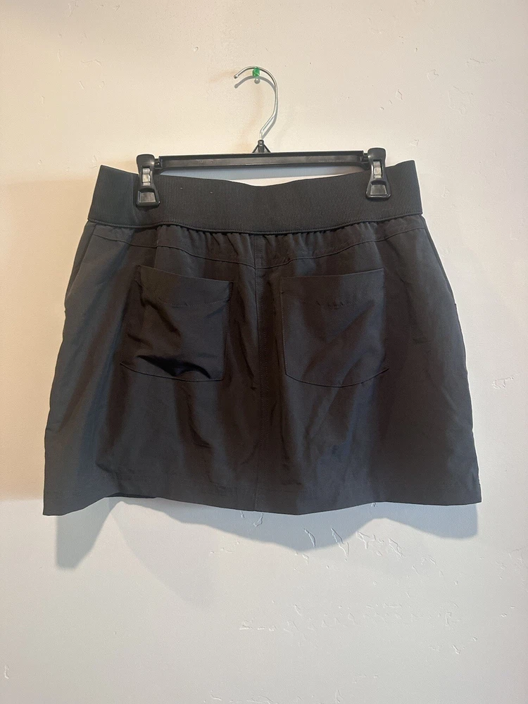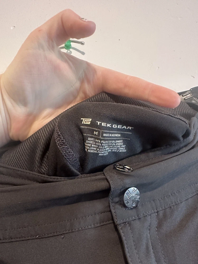 This Tek Gear skort is a versatile piece for women who enjoy activewear and casual wear. The black skirt and shorts are made of a polyester blend fabric that is blended for comfort and durability. The skort features a zip closure and pockets, making it a practical choice for gym and training sessions or casual outings. The size M skort is machine washable, which is a plus for busy women who want to stay active and stylish. The skort is designed with a classic theme and a regular fit, making it a suitable choice for various body types. Whether you're going for a workout or a casual day out, this Tek Gear skort is a great addition to your activewear collection. 43