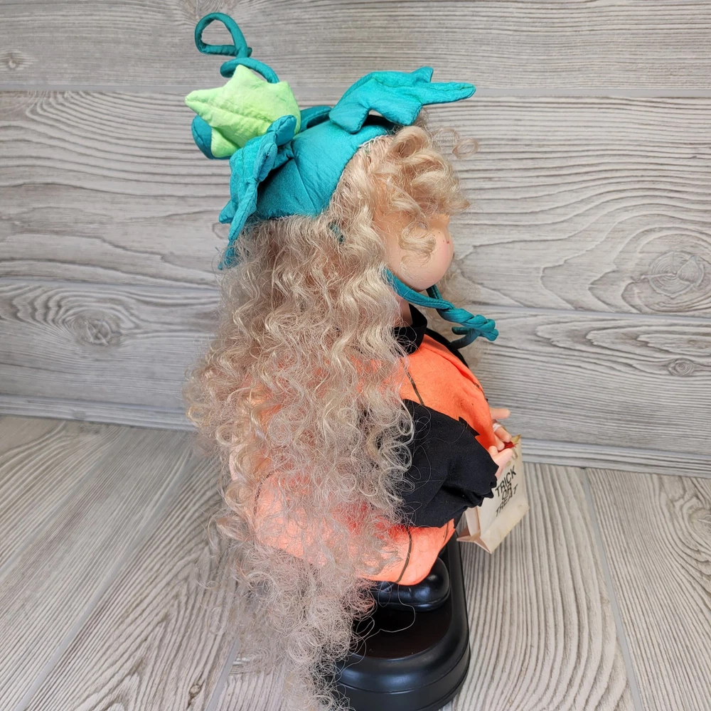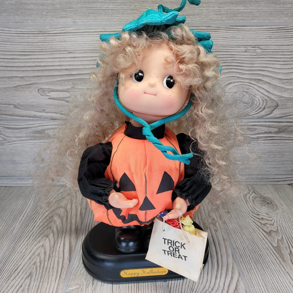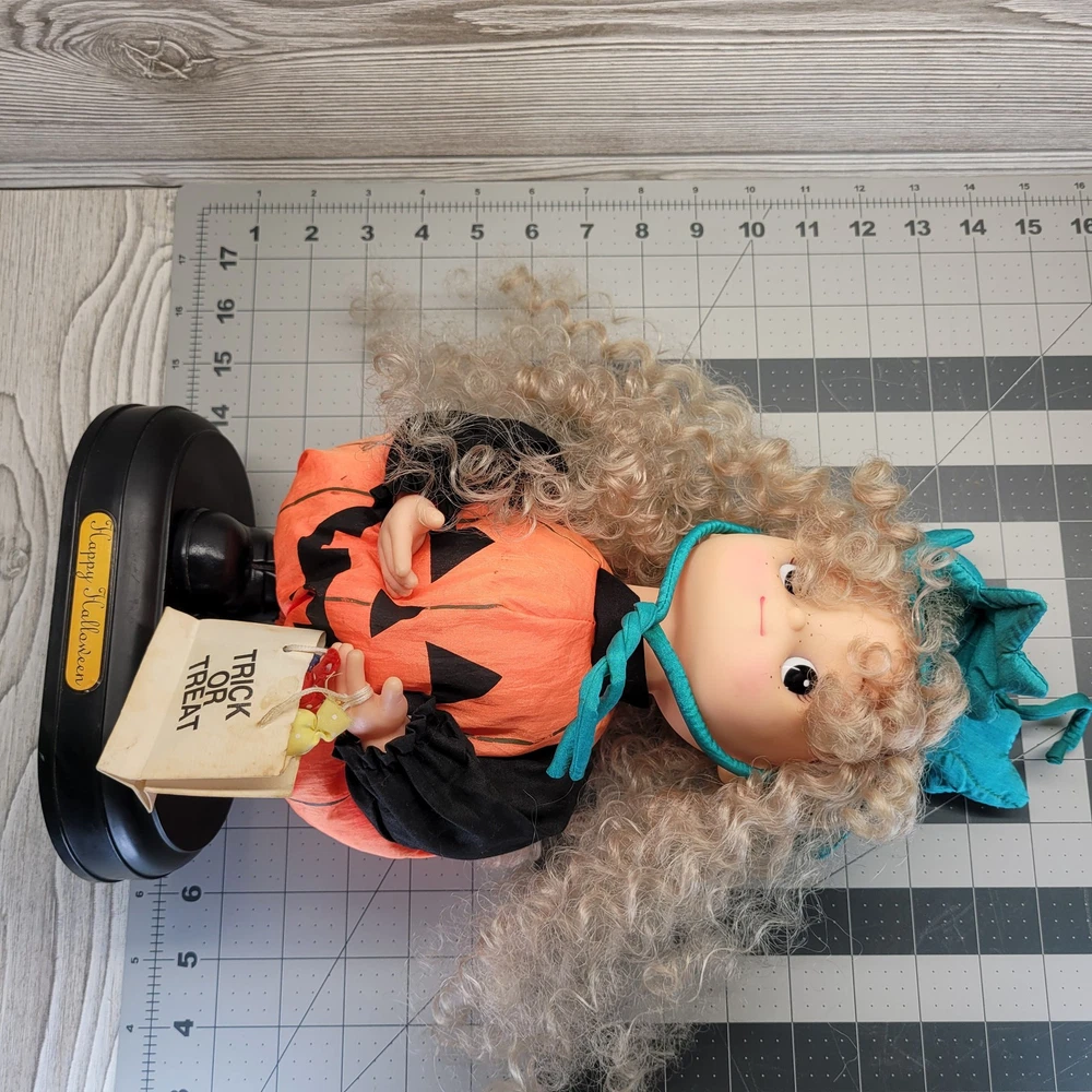 Vintage Telco Creations Halloween Animated Doll in Pumpkin Costume Condition: Used – Light wear, minor signs of age including some discoloration on the trick or treat bag. No major visible flaws. See all photos for details. Features adorable vinyl face with painted freckles, curly blond hair, and large eyes Wears a plush orange pumpkin jack-o-lantern costume with black shirt and shoes Comes with attached "Trick or Treat" bag, includes original bows and fabric "candy" details Unique teal and green stuffed pumpkin vine hat Plastic base with "Happy Halloween" label Animated: This doll moves when batteries are inserted (battery compartment is clean, untested) Model/Stock No. 54220, barcode and label on base Tag reads: Telco Creations Inc., 120 Andrews Road Hicksville, NY 11801 U.S.A., Made in China Marketed by Wal-Mart Stores, Inc., Bentonville, Arkansas Great vintage Halloween decor for collectors or display Doll stands approximately 14" tall with base (see photo with measurement grid for reference) Classic 1990s Halloween animated figure