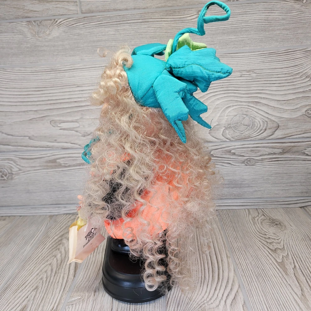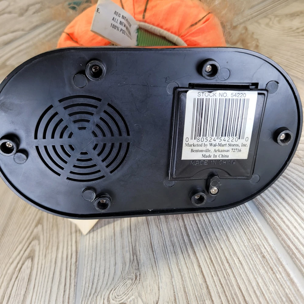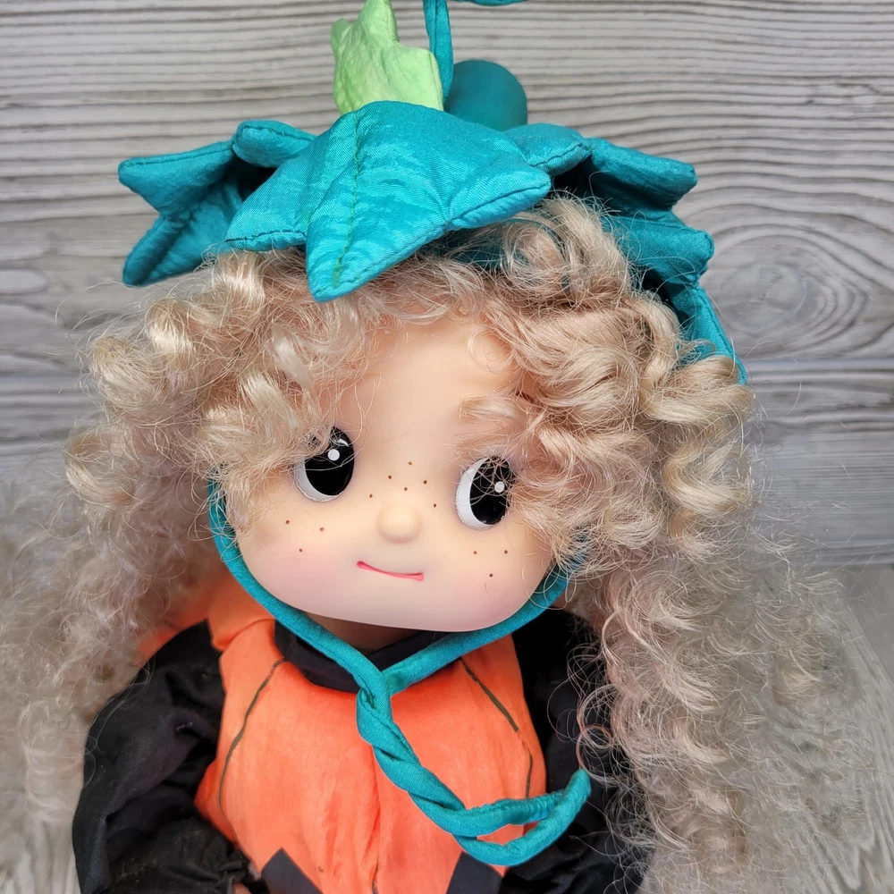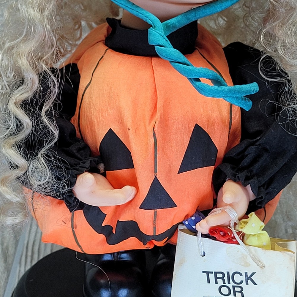 Vintage Telco Creations Halloween Animated Doll in Pumpkin Costume Condition: Used – Light wear, minor signs of age including some discoloration on the trick or treat bag. No major visible flaws. See all photos for details. Features adorable vinyl face with painted freckles, curly blond hair, and large eyes Wears a plush orange pumpkin jack-o-lantern costume with black shirt and shoes Comes with attached "Trick or Treat" bag, includes original bows and fabric "candy" details Unique teal and green stuffed pumpkin vine hat Plastic base with "Happy Halloween" label Animated: This doll moves when batteries are inserted (battery compartment is clean, untested) Model/Stock No. 54220, barcode and label on base Tag reads: Telco Creations Inc., 120 Andrews Road Hicksville, NY 11801 U.S.A., Made in China Marketed by Wal-Mart Stores, Inc., Bentonville, Arkansas Great vintage Halloween decor for collectors or display Doll stands approximately 14" tall with base (see photo with measurement grid for reference) Classic 1990s Halloween animated figure