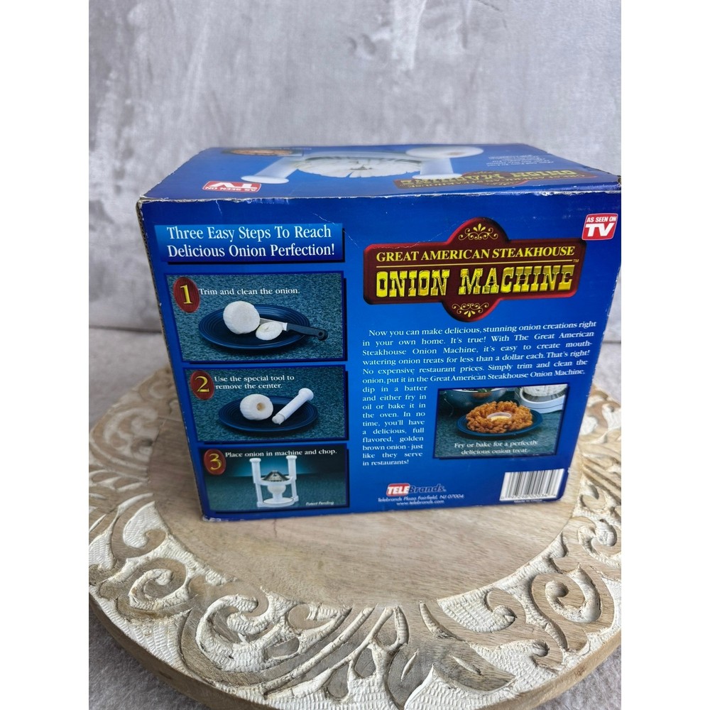 Great American Steakhouse Onion Machine creates restaurant-style blooming onion appetizers in your own kitchen. This manual slicer is designed to handle any size onion, providing a uniform cut for perfect frying or baking results. The unit disassembles easily for compact storage and is dishwasher safe for quick cleanup. Included with the machine is a specialized coring tool and a cookbook featuring recipes for batters and dipping sauces to complete the steakhouse experience. Brand: TeleBrands Model: Great American Steakhouse Onion Machine Color: White Material: Plastic, Stainless Steel Components: Slicer Base, Coring Tool, Cookbook/Instruction Guide Features: Dishwasher Safe, Disassembles for Storage Power Source: Manual Keywords: Blooming Onion, Onion Blossom, Kitchen Gadget, As Seen On TV, Appetizer Maker, Party Food, Restaurant Style, Deep Fryer Accessory, Cooking Tool, Vintage Kitchen, Culinary Gift, Home Chef, Steakhouse Style Thank you for your interest-discountduet