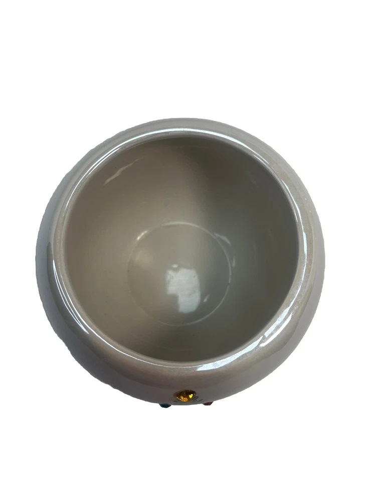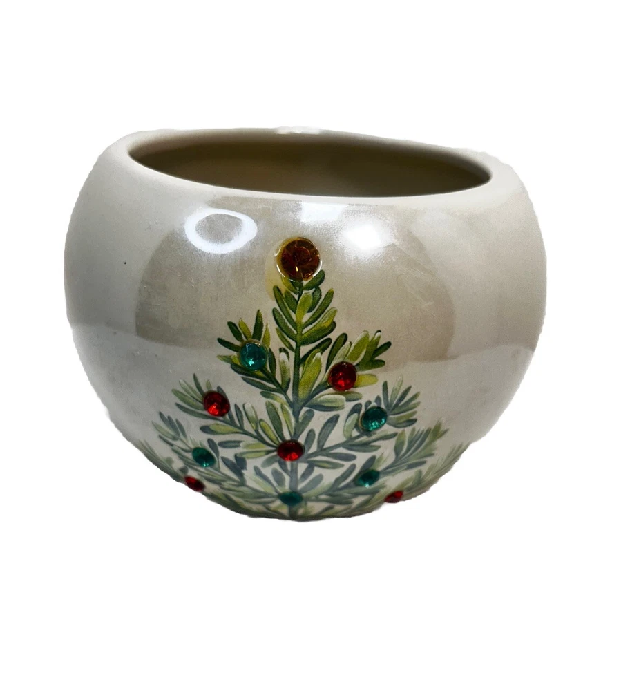 This Teleflora Christmas ball shaped planter is a festive and colorful holiday collectible. Made of ceramic in China, it features a Christmas tree design etched with jewels, adding a touch of sparkle to your holiday decor. The multicolor design is perfect for adding a cheerful touch to your home during the Christmas season.