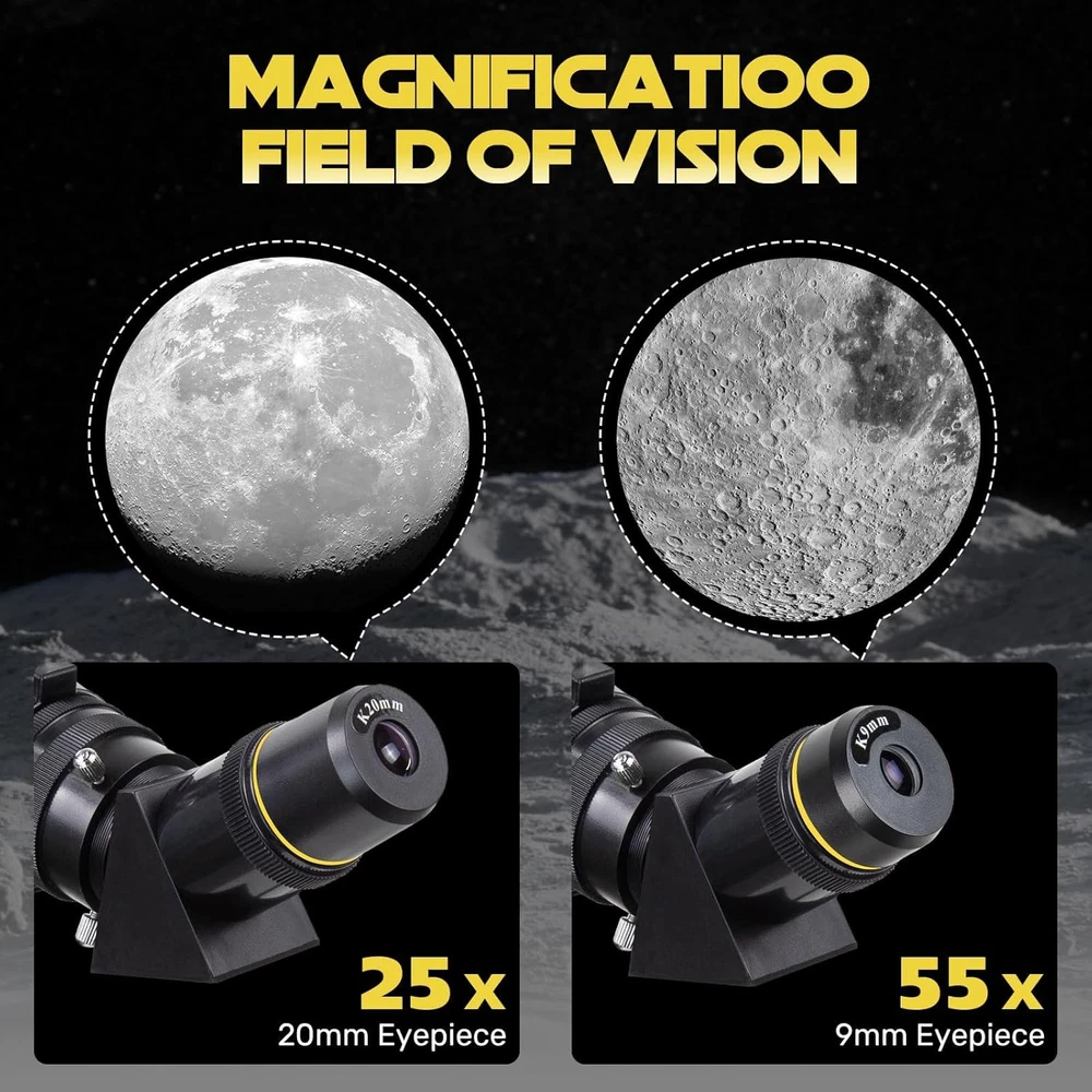 Store New Arrivals Add to Favorite View Feedback Contact Telescope 80Mm Aperture 500Mm Refractor Telescope for Adults, Telescopes for Astronomy with Fullsize Tripod & Phone Adapter, Portable Telescopes Backpack Description Objective Lens Diameter 80 Millimeters Eye Piece Lens Description Standard eyepiece lens material and coatings for K20mm and K9mm eyepieces Product Dimensions 17.32"D x 11.41"W x 5.72"H Compatible Devices Smartphone Item Weight 7.05 pounds Lens Coating Description Multi-Coated Exit Pupil 3.2 Millimeters Focus Type Manual Focus Finderscope Reflex [A LARGER AND CLEARER FIELD OF VIEW] Our telescope features an 80mm aperture and a 500mm focal length, Compared to a 50mm aperture, it provides a broader field of view. Additionally, it is equipped with multi-coated optical lenses that effectively enhance light transmission, reduce chromatic aberration, and offer a larger and much clearer field of view. With this telescope, you will be able to observe celestial bodies with clarity and receives more intricate details. [ENHANCED VIEWING EXPERIENCE] Our telescope comes equipped with two top-quality Kenller eyepieces (K20mm and K9mm), offering an exceptional magnification range from 25x to 55x. With a variety of magnification options at your fingertips, effortlessly adjust the magnification to observe captivating lunar details like never before – from mesmerizing craters to majestic mountains. Embark on a journey into the enchanting lunar landscapes with stunning detail. [EASY TO INSTALL, CONVENIENT TO CARRY] Telescopes is designed with user-friendliness in mind. You can effortlessly set up the telescope within 15 minutes, thanks to the accompanying instruction manual and installation guide that serve as your best assistants. Additionally, you can easily pack the telescope and all its accessories into the provided backpack. Whether you're admiring the stars, moon, you will never miss an opportunity to embrace the beauty of nature. [THE WONDER GIFT FOR ALL] Looking for an extraordinary gift that appeals to all ages? Look no further! Our telescope is the ideal present for dads, moms, sons, daughters, grandkids, boyfriends-in-law – anyone fascinated by the cosmos. Its versatility and ease of use make it an excellent choice for both beginners and experienced enthusiasts. [WARRANTY AND SERVICE] With over 20 years of industry expertise, our team of technical experts is dedicated to providing exceptional service and support. When you register your telescope with HOROX, you receive a warranty, ensuring your astronomical journey is backed by an unwavering commitment. Product Description HOROX 80MM APERTURE 500MM, BRING YOU INFINITE POSSIBILITIES TO EXPLORE THE UNIVERSE! UNPARALLELED 80MM APERTURE Unleash the power of an impressive 80mm aperture, capturing more light and revealing celestial objects with astonishing clarity. Immerse yourself in a world of vibrant details and awe-inspiring views. 2 EYEPIECES PROVIDE DIFFERENT LEVELS OF DETAIL The HOROX astronomical telescope is equipped with 20mm and 9mm eyepieces, each offering distinct details. By adjusting the focal length, you can achieve magnification ranging from 20x to 55x. 45° DIAGONAL Telescope for adults paired with a 1.25-inch prism that boasts a 99% light transmission rate and minimizes chromatic aberration to the maximum extent. The 45-degree design ensures a comfortable viewing experience, whether you're observing the moon or distant landscapes. 5 X 24 FINDERSCOPE The 5x24 star finder scope offers a wider field of view, allowing you to observe a broader area. With its assistance, you can quickly identify observation targets by referencing the relative positions of stars and then use the telescopes to further explore celestial details.(Note: The image of the finderscope is inverted) NEW UPGRADED PHONE HOLDER The mobile phone holder is designed with different eyepiece focus holes, eliminating the issue of mismatch between the size of the phone camera and the eyepiece hole. This ensures a seamless experience when using your phone for photography, minimizing any noticeable artifacts caused by incompatible hole sizes. A MORE STABLE TRIPOD Crafted with a 1.1 inchs thick aluminum alloy, the tripod offers three adjustable settings to accommodate various usage scenarios. Equipped with a built-in level gauge and compass, it allows for quick adjustments during use. With 360° rotation and 180° angle adjustment, you will no longer be limited when observing celestial objects. ABOUT US We offer the best prices around on high quality products. Our E-store includes media such as books, movies, music and games while offering electronics, toys, sporting apparel, clothing, tools, general home, garden items and more. SHIPPING We are always working hard to ensure your package arrives as soon as possible. Please understand that some factors like weather, high postal traffic, and the performance of shipping companies are outside of our control. We offer free shipping to the lower 48 states and ship within 2 business days of payment, usually sooner. We do not accept P.O. Boxes. Please provide a physical address. For shipping outside of the continental USA, we only use eBay's Global Shipping Program.The item is shipped to KY and then sent to the rest of the world. International customers are responsible for all duties and taxes. Continue to check out in order to calculate costs for shipping the item to your country. Messages regarding eBay's Global Shipping Program MUST be directed at eBay EXCLUSIVELY. RETURNS We offer a 30-Day Return Policy on items which you are not completely satisfied with. You have the option for a full-refund or an exchange of the item. No returns are available on items shipped outside of the USA. PAYMENT We accept PayPal. CONTACT US This page content is yet to come Please ad us to your favorite seller and visit again later Thank You CUSTOMER SATISFACTION We try our very best to make sure every customer is completely satisfie