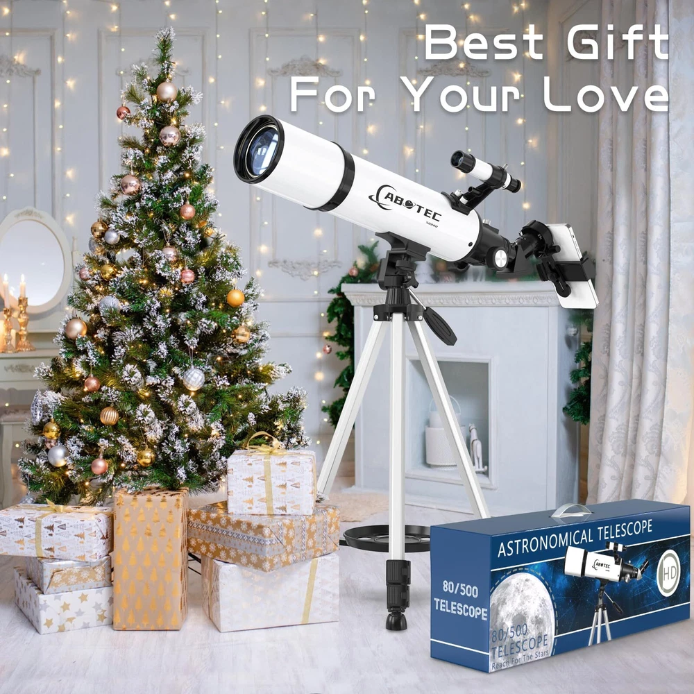 80mm Objective Lens Our telescope is equipped with a large 80mm objective lens and the lens is fully coated with high transmission coatings. The large aperture can collect more light and the high transmission optics lens can increase light transmittance and reduce the reflection of light. Compare with other 70mm models, our telescope can get brighter and clearer images. Professional telescopes for adults astronomy can help 8-12 kids & adults & beginners view the planets and stars more easily. High Magnification The telescope has 25X-250X magnification. Our telescope with 500mm focal length, 3 eyepieces(K25mm, K10MM and K6mm) and a 3X Barlow lens. The 3x Barlow lens trebles the magnifying power of each eyepiece. So you can get magnification from 25X to 250X. The magnification is enough to see the moon and planets. It’s a great telescope for adults and astronomy beginners. Portable Telescope for Travel The refractor telescope has a bag and an adjustable tripod. The tripod is stable and it can be adjusted from 22” to 48’’. The tripod also has a tray, which is convenient for you to replace and store eyepieces. All accessories can be put into the bag, which is convenient for you to carry when you go out and travel. Our telescope set also includes a smartphone adapter and a wireless remote. The phone adapter is the latest, which can let your phone attach to the telescope more stably, so you can take some photos easier through your phone. Easy to Assemble and Use This telescope is quick and easy to set up. We have a full set of manual and a video installation guideline. Don't worry about any installation problems. Even the kids and astronomy beginners can install it by themselves without any tools. It’s a great astronomy gift for astronomy beginners. 3 Years Customer Service provide a 3-year customer service. If you have any question about the products and service, please feel free to contact us, we will do our best to help you in 24 hours. 【80mm Large Aperture】The telescope has an 80mm aperture and a fully coated optics lens. The big aperture can capture more light, the high transmission optics lens can improve light transmittance and reduce the reflection of light, so the telescopes for adults astronomy will bring you more bright and clear images. 【25X-250X High Magnification】The telescope equipped with 3 eyepieces(K6mm, K10mm, K25mm) and a 3X Barlow lens. The 3x Barlow lens trebles the magnifying power of each eyepiece. You can get 25X-250X high magnification with a 500mm focal length. Whether observing moon or viewing planets, our telescope can meet your all needs. It’s a great telescope for adults & 8-12 kids & astronomy beginners. 【Portable & Stable】Our refractor telescope has a bag and an adjustable tripod. All accessories can be packed into the bag, which is convenient for you to carry out. The tripod is stable and the height can adjust from 18.1” to 44.9’’, which can be used in many different viewing positions. The tripod also has a tray for easy replacement and storage of eyepieces. 【Easy to Use】 The telescope is easy to assemble even for astronomy beginners and kids. We have the detailed installation manual and video installation instructions to teach you. Our telescope set includes the upgraded phone adapter and wireless remote. The mobile phone can be attached to the telescope more stably, which is convenient for you to take some amazing photos through your phone. It’s a great astronomy gift for beginners and it will encourage them to love learning about space. 【Satisfaction Service】We provide 3 years satisfaction service. If you are not satisfied with our product or have any questions, please feel free to contact us to get 24-hour technical support from our expert team.