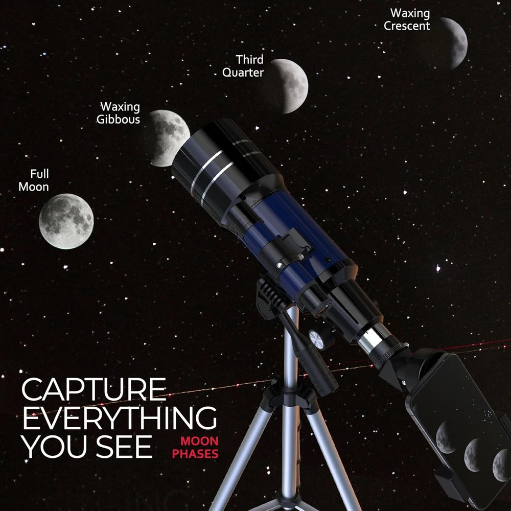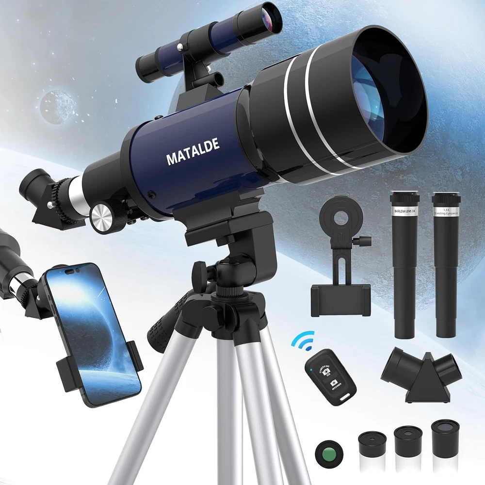 Store New Arrivals Add to Favorite View Feedback Contact Telescope for Kids, 70Mm Aperture (15X-150X) AZ Mount Telescopes for Astronomy Beginners, Portable Refractor Telescope with Tripod, Phone Adapter and Wireless Remote, Dark Blue Description Optical Tube Length 70 Millimeters Optical-Tube Length 70 Millimeters Eye Piece Lens Description Barlow Item Dimensions D x W x H 13.8"D x 2.8"W x 2"H Color Dark Blue Mount Altazimuth Mount Item Weight 1.7 Kilograms Number of Batteries 1 CR2032 batteries required. (included) Objective Lens Diameter 70 Millimeters Product Dimensions 13.8"D x 2.8"W x 2"H Telescope Mount Description Altazimuth Mount 【15X to 150X Magnification】This astronomical telescope boasts 3 eyepieces (K20mm, K12mm and K6mm), and 3X and 1.5X Barlow lenses, allowing for magnifications ranging from 15X to 150X. Enjoy clear views with a 70mm aperture and fully coated optics glass lens. The lenses also feature scratch-resistant coatings to enhance durability. 【Great Gift for Kids】The kids telescope can be used to observe the Moon and bright planets,but also good for daylight viewing of wildlife. Perfect Christmas or birthday gift for kids 8-12, 5-7 and astronomy beginners. The telescope for adults helps children build interest in astronomy and science, exploring the unknown, enjoy the nature and away from screen. 【Easy to Assemble and Adjust Viewing Angle】Assembling the space telescope is a breeze, even for beginners and kids. We provide a detailed installation manual and video instructions to guide you. The adjustable tripod ensures stability and can be set at heights ranging from 13.5 to 47.6 inches, accommodating various viewing positions. 【Wireless Remote & Phone Adapter& Moon Filter】Our telescope for kids & adults comes equipped with a smartphone adapter and a wireless camera remote for seamless connectivity. Simply attach your phone to the adapter, connect it to the eyepiece, and start capturing breathtaking images while exploring the wonders of nature. The included moon filter enhances your observation experience by providing brighter, clearer views of the moon while protecting your eyes from glare. 【Quality and Satisfaction Guaranteed】: Our beginner telescope is perfect for stargazing, birdwatching, and exploring wildlife. With a commitment to your satisfaction, we offer a 2-year warranty and 24-hour technical support from our expert team. You can confidently explore the cosmos with our reliable product. Product Description The video showcases the product in use. The video guides you through product setup. The video compares multiple products. The video shows the product being unpacked. 1 Multi-Angle Rotation 2 Phone Holder Setup Steps 3 45° Diagonal Mirror 4 Moon Filter 1 15X-150X Magnificatons 2 Large Aperture 1 Adjustable Tripod Tube 2 Finder Scope 3 Diagonal Mirror 4 Three Eyepieces 5 3X Barlow Lens ABOUT US We offer the best prices around on high quality products. Our E-store includes media such as books, movies, music and games while offering electronics, toys, sporting apparel, clothing, tools, general home, garden items and more. SHIPPING We are always working hard to ensure your package arrives as soon as possible. Please understand that some factors like weather, high postal traffic, and the performance of shipping companies are outside of our control. We offer free shipping to the lower 48 states and ship within 2 business days of payment, usually sooner. We do not accept P.O. Boxes. Please provide a physical address. For shipping outside of the continental USA, we only use eBay's Global Shipping Program.The item is shipped to KY and then sent to the rest of the world. International customers are responsible for all duties and taxes. Continue to check out in order to calculate costs for shipping the item to your country. Messages regarding eBay's Global Shipping Program MUST be directed at eBay EXCLUSIVELY. RETURNS We offer a 30-Day Return Policy on items which you are not completely satisfied with. You have the option for a full-refund or an exchange of the item. No returns are available on items shipped outside of the USA. PAYMENT We accept PayPal. CONTACT US This page content is yet to come Please ad us to your favorite seller and visit again later Thank You CUSTOMER SATISFACTION We try our very best to make sure every customer is completely satisfied. If there's a problem, message us! We're happy to help. WE ACCEPT Copyright © 2021 AutoDS. | All Rights Reserved