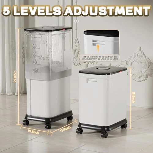 Return Policy Fast Delivery Trusted seller Telescoping Kitchen Trash Can with Lid,20L to 45L Adjustable Capacity/Height Garbage Can,Plastic Slim and High Trash Bin with Wheels for Bathroom/Bedroom/Living Room/Office Commercial Trash Cans Product Description No Bending Over - this Commercial Trash Cans kitchen garbage can can be adjusted in height from 16.9 inches to 28.4 inches, allowing you to avoid bending over when throwing garbage. Meanwhile, its capacity will increase from 20 Liters/5.3 Gallons to 45 Liters/12 Gallons, containing more garbage 5 Levels Adjustments - large kitchen trash can with lid by pressing the buttons on both sides of the trash can, you can adjust the height and capacity of the trash bin in 5 levels and choose the level that best suits your usage needs. Tfore, it can be used in any room such as kitchen, bathroom, living room, bedroom, study room, laundry, dining hall, etc(5 Levels: 20L, 30L, 35L, 40L, 45L) Save Space - kitchen trash can on wheels indoor the telescopic function allows the 45L trash can to occupy only 20L of space, which is perfect for anyw space is limited, such as single apartments, individual offices, etc. Tall and thin garbage bin fits snugly to narrow openings and small places Trash Can on Wheels -big yard trash cans with wheels equipped with 4 universal wheels on the base, this kitchen waste bin can be easily moved to anyw you need it. Besides, wheeled design is convenient for you to dispose of some heavier garbage Isolate Odors -tall slim plastic garbage can kitchen lidded garbage container lock unpleasant smells inside, keeping your home's air fresh. T is a box on the cover of trash can w you can put fragrance in it Package Contains - 1 pack Trash Can, 1 pack Trash Can Lid, 4 pack Universal Wheels, 15 count Trash Bags(Pack of 1) Shipping Returns Payment Shipping Shipping is FREE to all addresses other than APO/PO boxes in the lower 48 states. All our stock ships from US-based warehouses. Shipped via USPS or UPS (depending on location and package weight) Unless stated otherwise, all orders will ship within 24-72 hours of your payment being processed. Check our feedback to see the great reviews of FAST shipping we offer. Returns Seller does not accept returns Payment We currently accept payment via eBay managed payments only. Once payment is cleared, we will dispatch your shipment within 1-3 business days. Please refer to the "Shipping" tab for more information regarding shipping speed to your destination.