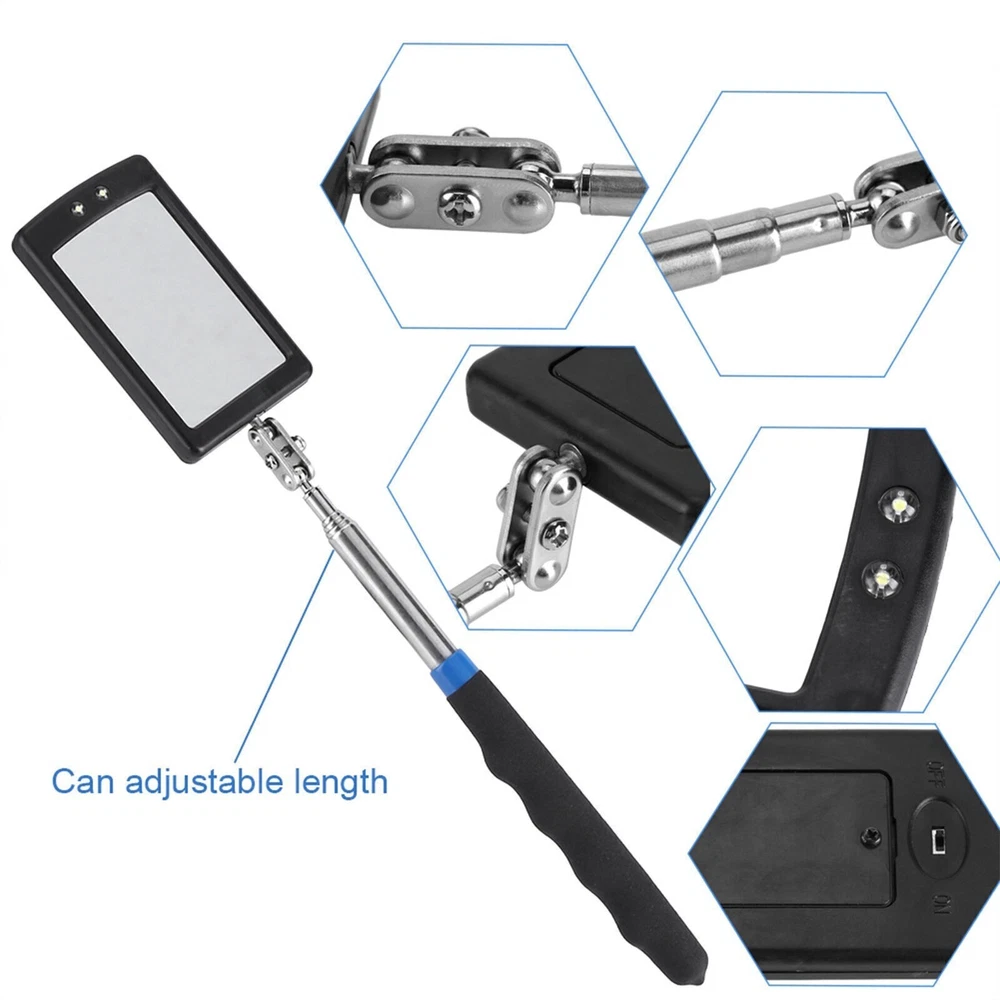 Description: This item is made of alloy steel and solid ABS plastic, durable and sturdy, safe and eco-friendly to use. It has 2 extra bright LED lights which can facilitate the inspection of hard-to-see and hard-to reach areas in vehicles, machinary etc, easily peering into the dark crevices of your workspace. It also features a 360 degree rotary ball joint for extra viewing capabilities, allowing inspection mirror to swivel freely, yet holding a desired position. Ideal tool for toolmakers, machinists, inspectors and mechanics, lights make it especially useful for dark and hard-to-see places. Worth buying. Features: Made of alloy steel and solid ABS plastic, durable and sturdy, safe and eco-friendly to use. It has 2 extra bright LED lights which can facilitate the inspection of hard-to-see and hard-to reach areas in vehicles, machinary etc, easily peering into the dark crevices of your workspace. It also features a 360 degree rotary ball joint for extra viewing capabilities, allowing inspection mirror to swivel freely, yet holding a desired position. Comfortable handle with soft, non-slip ABS grip which is designed for sure control. The length can be adjusted according to various situation. Ideal tool for toolmakers, machinists, inspectors and mechanics, lights make it especially useful for dark and hard-to-see places. Specification: Condition: 100% Brand New Material: Alloy Steel & ABS Color: Shown as picture Mirror Size: Approx. 5 * 8cm / 2.0 * 3.1inch Handle Length: Approx. 20.4 - 79cm / 8 - 31.1in Package Weight: Approx. 100g Package Included: 1 * Vehicle Inspection Mirror Note: The color of rubber ring is sent in random. All the items will be dispatched within one business day by Airmail after the payment is clear. Most times you will receive your order within 10-30 business days after we transfer your package to the delivery company. We cannot guarantee the delivery timeframe if the post office has any unexpected delays due to holiday,weather,customs, or other conditions. Some countries like Russia, Brazil, or some European countries may take up to 50 days or longer for delivery. We appreciate your patience if you haven't received items in 30 days(Russian customers may need more patience by reason of the local delivery system and/or customs). If you are concerned in any way, please feel free to contact us via ebay message instead of leaving negative/neutral feedback or opening a dispute . We will do our best to solve any problem(resend or refund any missingitem). Customs duty is obligation and liability of citizens in yourresponsible for any tax and custom duty incurred. Generally, thedelay or failure delivery is sometimes caused by the policy of different customs. Our listing price includes the value of goods,packaging cost,and export taxes,not including international duties. duties,taxes,and charges are not included in the item price or shipping fee. The duties are buyers' responsibility. Please check with your country's customs office determine what these additional costs will be prior to your purchase. All disputes arising from the duties will be submitted to ebay for solution. Any questions, pls. contact us via ebay message or email us. We will reply your message within 48 hours. If you do not receive our reply within 48 hours, pls. post a message again because sometimes our message system may block some emails. If you are satisfied with our service, pls. kindly leave us a positive feedback and give us the Detailed Seller Rating with all " 5 " in very area. Our aim is to provide Level Customer Service, your recognition will encourage us greatly and serve you better. We strive to keep all our customers satisfy. We will do our up most to exceed your expectations in customer service, communication and dispatching of your orders.