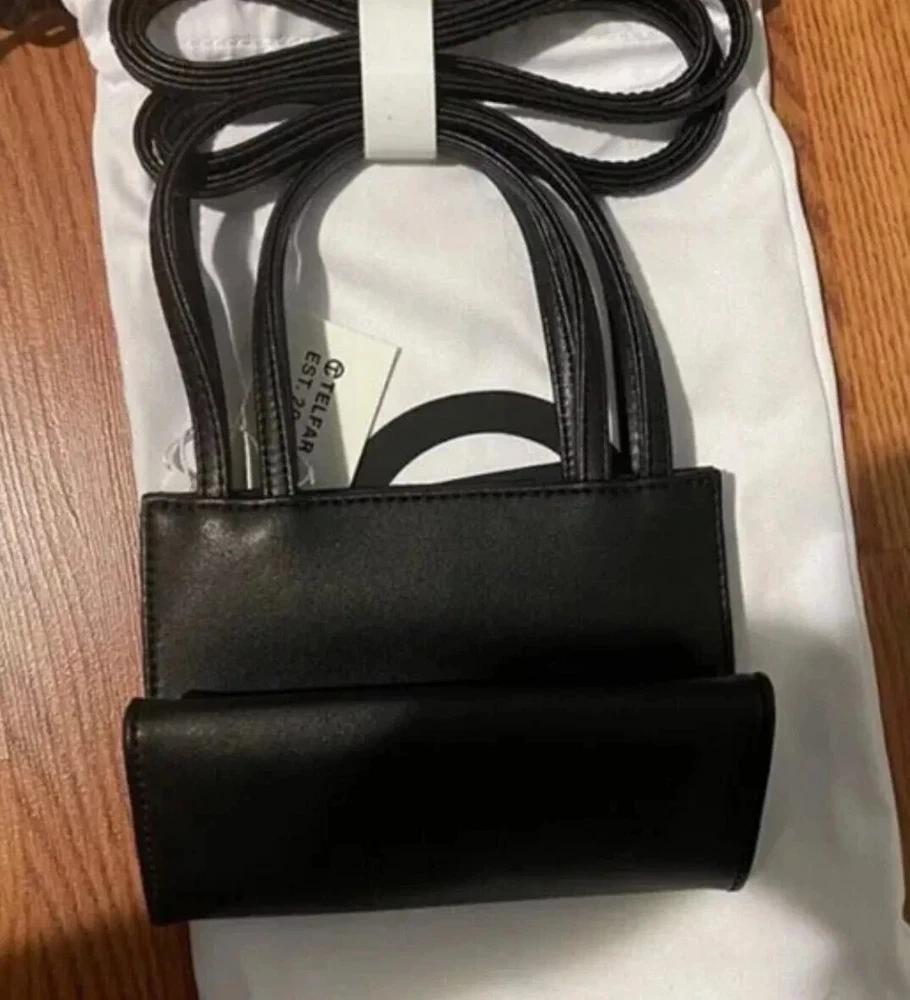 Telfar Small Shopping Bag egan Leather Tote Bag Crossbody Bag Featuring a double strap (handles and cross-body straps), embossed logo, and magnetic snap closure. Made from faux leather and twill lining. Bag is packaged in the Telfar drawstring dust bag with screen-printed logo. Small is the party bag + the afterparty too. (Height 4 3/4", Width 6 5/8", Depth 3", Strap Drop 21", Handle Drop 4 3/4") New with Tags.
