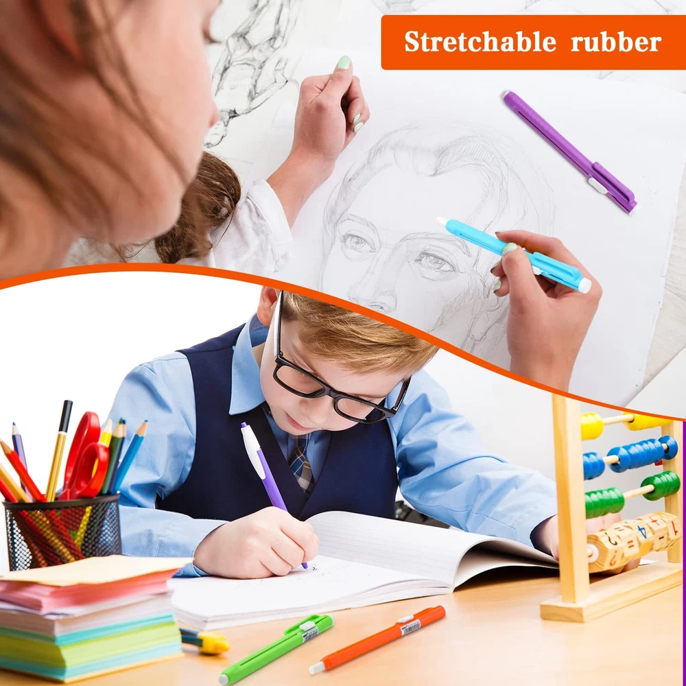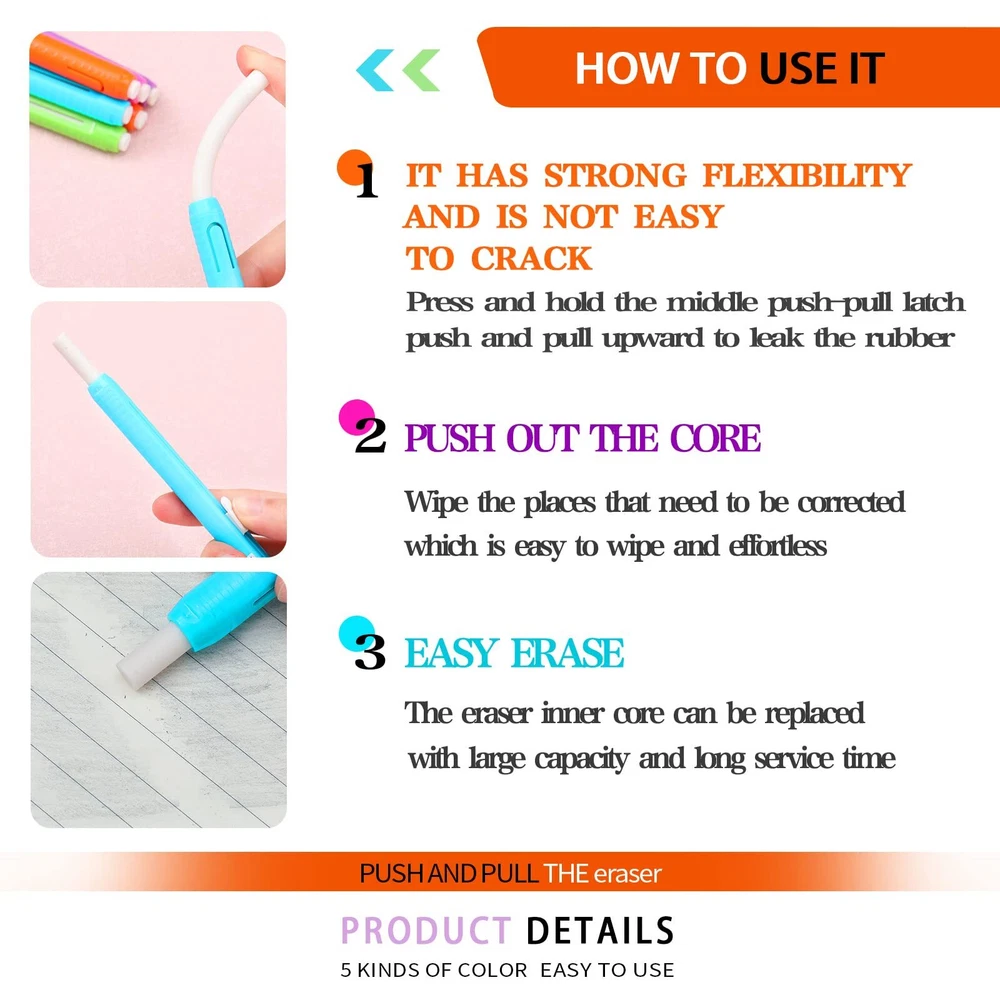 Features: Delicate gifts: You can send these erasers for pencils to your friends, partners and family members, they will be satisfied when they receive these gifts. School competition award: Stick erasers can be school and classroom competition awards to encourage students to study hard and move forward. Specifications: Material: rubber and plastic Color: green, blue, orange, purple, pink Size: 13.5 x 1 cm/ 5.31 x 0.39 inches Package includes: 15 x Retractable click erasers Notes: Manual measurement, please allow slight errors on size. The color may exist a slight difference due to different screen displays. Abundant Quantity: you will receive 15 pieces of rubber retractable erasers, the sufficient quantity is enough for your daily use and replacement needs, you can use them at home or in office Assorted Colors: drawing eraser for artists have green, blue, orange, purple, pink for you to choose, with a white stick eraser inside, you can choose your favorite color according to your preference Safe and Sturdy Material: erasers in assorted colors are made of quality rubber and plastic, safe and nontoxic, light weight but not easy to break, can be applied for a long time; They are the ideal school supplies for children Broad Range of Occasions: mechanical erasers for artists can be applied to erase mistakes on notes, diaries, envelopes, exercise books, suitable for students, teachers, kids, artists, drawing rooms, designers, office workers and so on Easy to Use: pencil retractable cute erasers are easy to use, erase mistakes on notes, a gentle push, convenient and quick, you can easily and cleanly erase the wrong text or lines