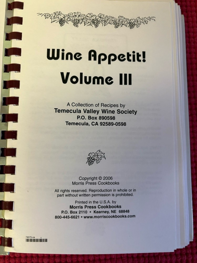 The Temecula Valley Wine Society Wine Appetit! Volume III Cookbook is a hardcover book published in 2006 featuring various authors. This cookbook focuses on wine-related topics and culinary delights, making it a valuable resource for wine enthusiasts and food lovers alike. With its English language text and comprehensive collection of recipes and tips, this book is sure to be a prized addition to any wine-related library. *** Please Note: The majority of the items I sell on eBay are items I have obtained or purchased through outside sources and unless noted, I am not the original owner and cannot guarantee they come from smoke and/or pet free environments. I describe all of my items to the best of my ability, with information available at the time or through research. However, the nature of on-line purchasing may leave some descriptions open to different interpretations. I am NOT an expert by any means. I always try to provide all pertinent information and provide several pictures and measurements. If you feel I have missed something or need clarification, please contact me. All questions are welcomed and will be responded to within 24 hours. I want you to be pleased with your purchase and I do NOT accept returns. Please reduce, reuse and recycle. Final sales, no refunds, no returns. REASONABLE offers considered Shipping through USPS for the majority of the items. Sometimes UPS will used for bigger items, whichever is less expensive. I cannot be responsible for shipping times and these may vary due to inclement weather, pandemics, holidays, etc.; however, I do send the item out within 24 hours of payment. I have heard your complaints about shipping costs but I do not determine the prices nor do I intentionally inflate shipping. I do not charge any additional “materials or handling” fees. I reuse packaging materials whenever possible. I only charge actual shipping - calculated by eBay and its algorithms. Shipping costs have increased dramatically and the least expensive option is almost always USPS Ground Select. The USPS tracking number will be referenced on your eBay record. There may be slight color discrepancies due to flash/lighting and monitor settings. Measurements are measured with the item laying flat. Thank you!