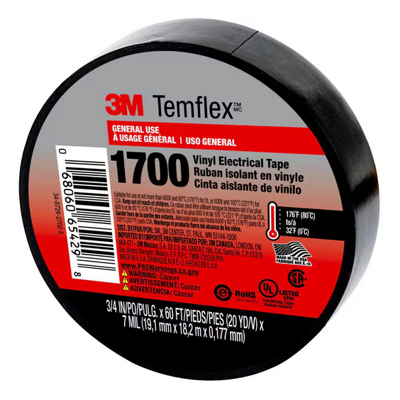 π¦ Product Description: The Temflex 1700 Electrical Tape is a general-purpose vinyl tape designed for reliable insulating and bundling in residential, commercial, and automotive electrical work. This 3/4 in. x 60 ft. black tape offers dependable performance and professional results. β‘ Features & Benefits: β General-Purpose Use: Ideal for insulation, splicing, and wire bundling β Size: 3/4 inch wide x 60 feet long β fits most electrical applications β Strong Adhesion: Sticks securely to wires and cables in various conditions β UL Listed & CSA Certified: Meets key industry safety standards β Flexible & Stretchable: Conforms easily to irregular surfaces β Weather-Resistant Vinyl: Durable for indoor and light outdoor use