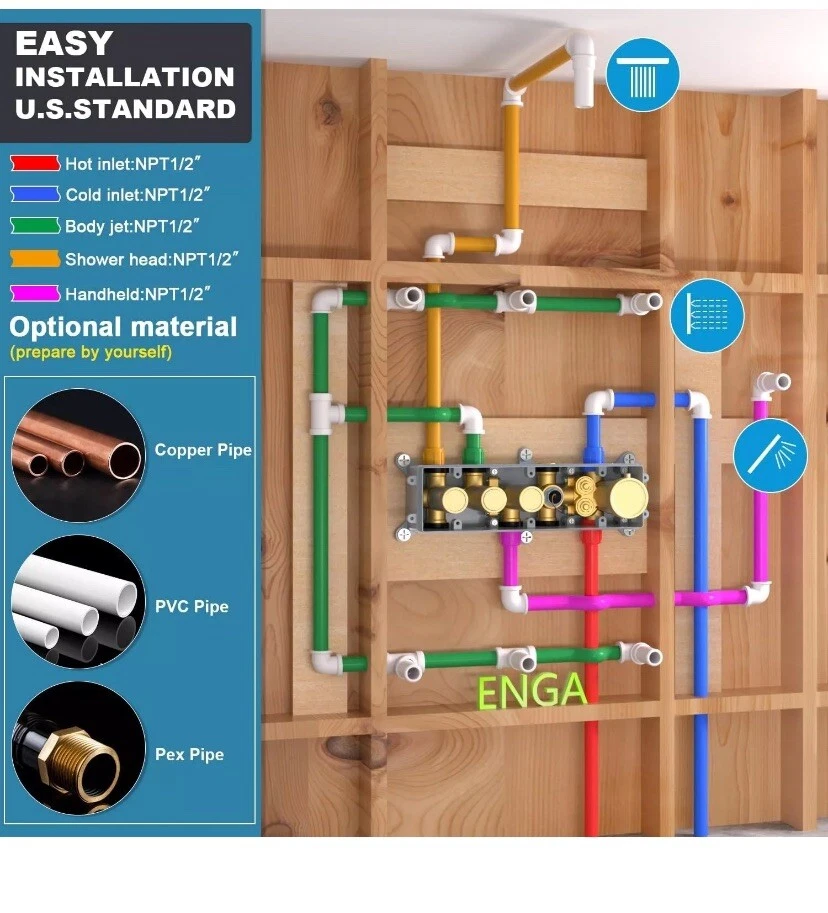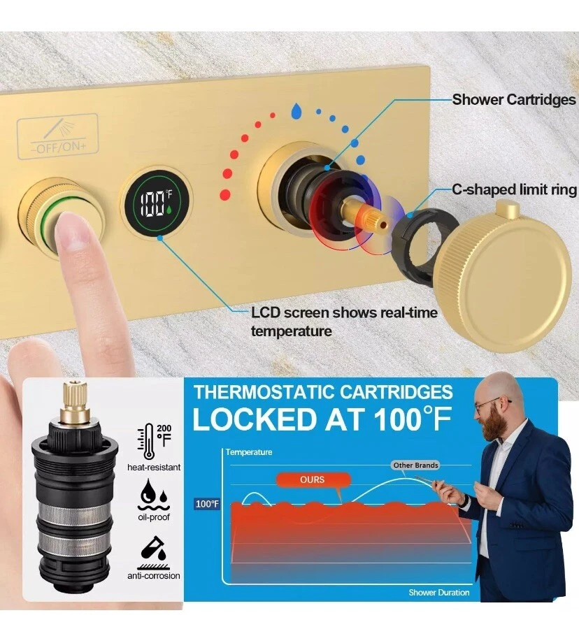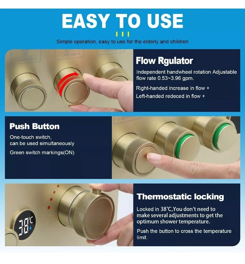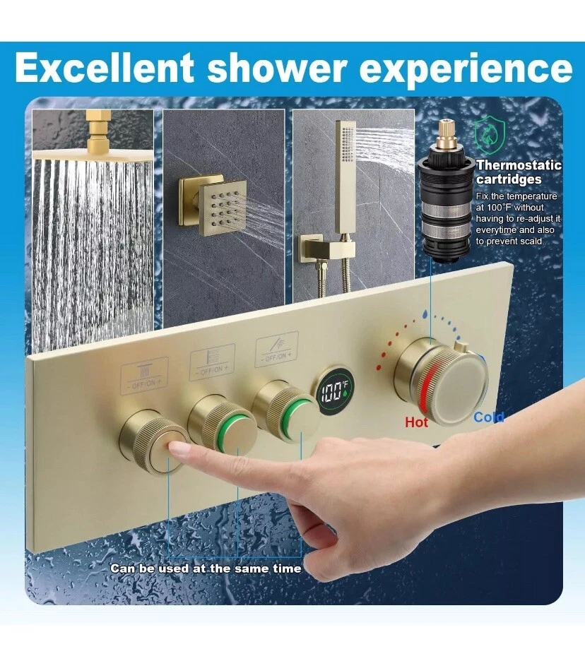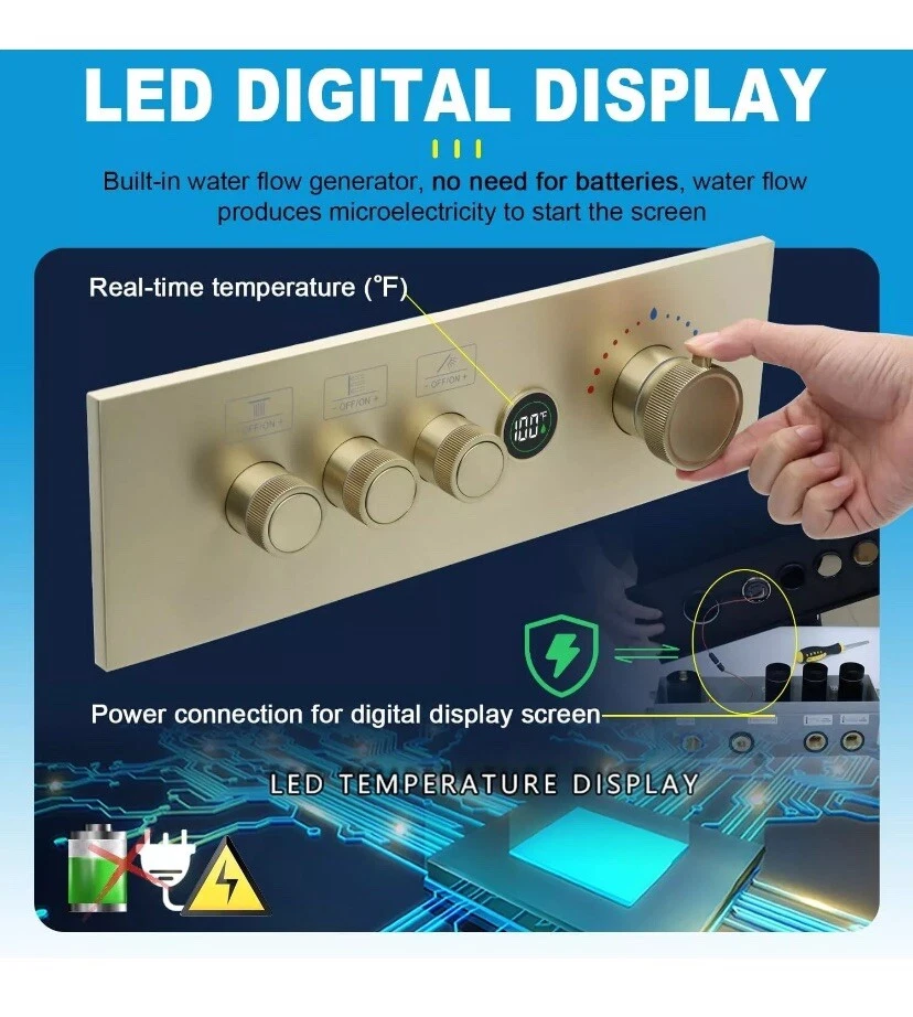 Temperature Display Shower Mixer Valve, 3 Way Push-Button 3-way, Brushed Gold About this item 【Digital Temperature Display】This 3-way digital thermostatic shower valve provides precise temperature control, water flow customization, safety features, and convenience, enhancing your showering experience. The current real-time water temperature from the LED display of the shower valve. 【Push Button On-off & Flow Control】3 way shower diverter valve combines push-button and flow regulation concepts. Each button is equipped with a flow regulator, when you press the button switch, you can turn the regulator left or right to adjust the flow. Moreover, the three button-style diverters on the valve allow for multiple modes to be used at the same time. 【Thermostat Shower Mixing Valve】The digital thermostatic valve allows you to set and maintain a precise water temperature for your shower. Universal thermostatic shower valve, pressure balancing shower diverter avoids the discomfort caused by sudden changes in water temperature and is very suitable for the elderly or children, which features scald prevention, more considerate for your family. 【Generous Flow Rate】Water flow rate at 80 psi: Use one function is 3.83 gpm, 2 functions use together is 4.32 gpm, 3 functions use together is 4.45 gpm. 3-way shower valve, American standard NPT threads, 3 outlets and 2 (hot or cold) inlets are 1/2". 【Easy to install】This shower mixer valve is engineered for easy installation and maintenance. The embedded box design, say goodbye to the trouble of removing the wall for maintenance. Solid brass material + high-quality surface treatment can ensure the quality and service life of the product.