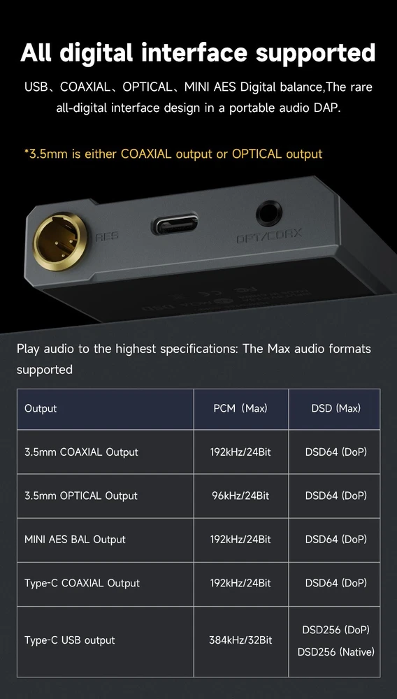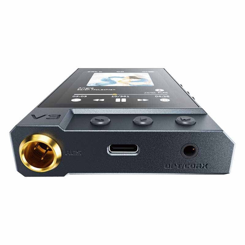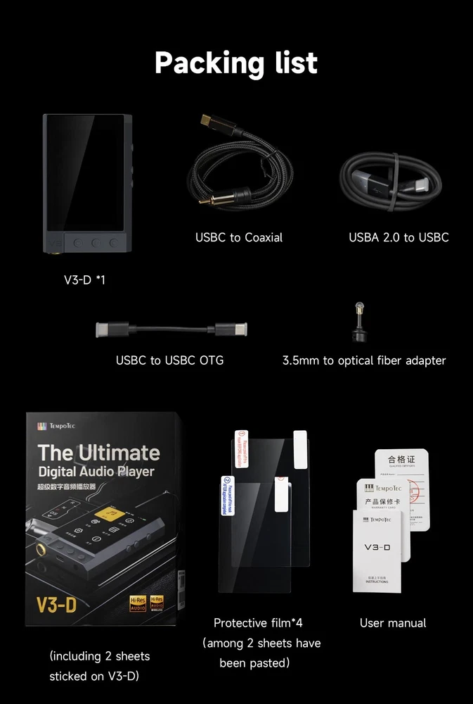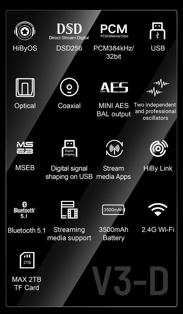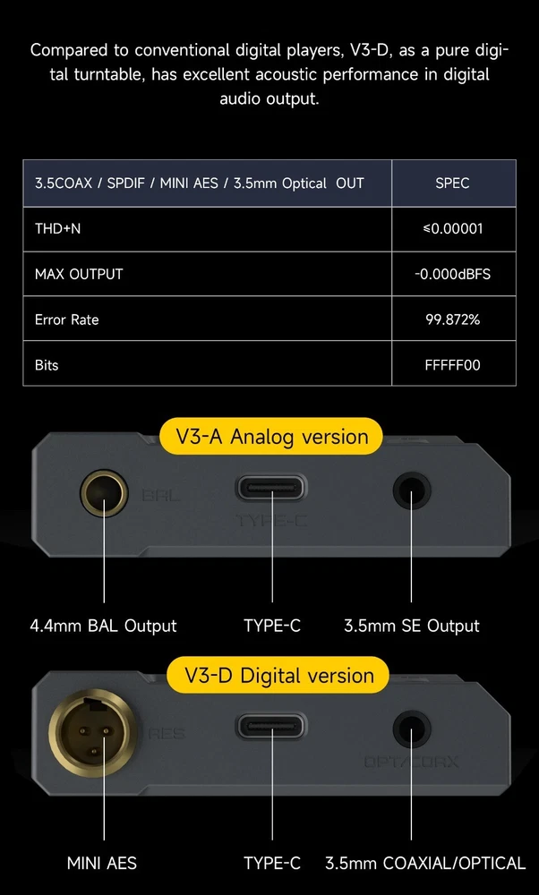 * V3-D is a digital player and doesn’t have analog output . It must be used together with other DAC TempoTec V3-D HiFi Portable digital audio player and turntable, supports Bluetooth, USBC, Coaxial output, Optical output and mini AES. The functions supported of this hifi music player: Wireless included: Bluetooth 5.1 and 2.4GHz WiFi Input support: Local playback (Micro SD) Bluetooth input (LDAC, AAC, SBC), AirPlay, DLNA Streaming media (Tidal, Qobuz), USB input audio Output Support: Optical, Coaxial, MINI AES,USB output Bluetooth output (LDAC, aptX, AAC, SBC) Supported formats: DSD256, PCM 384kHz/32bit Control: HiByLink, Hardware buttons TempoTec V3-D works as audio source to connect with TemopTec March M3 via USB, or with TempoTec Serenade X via Coaxial or Optical cables.