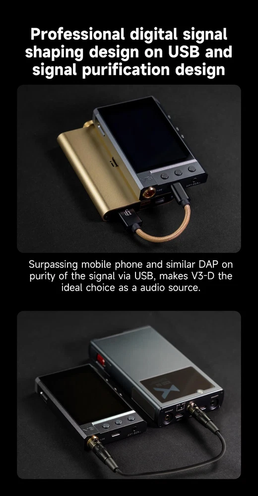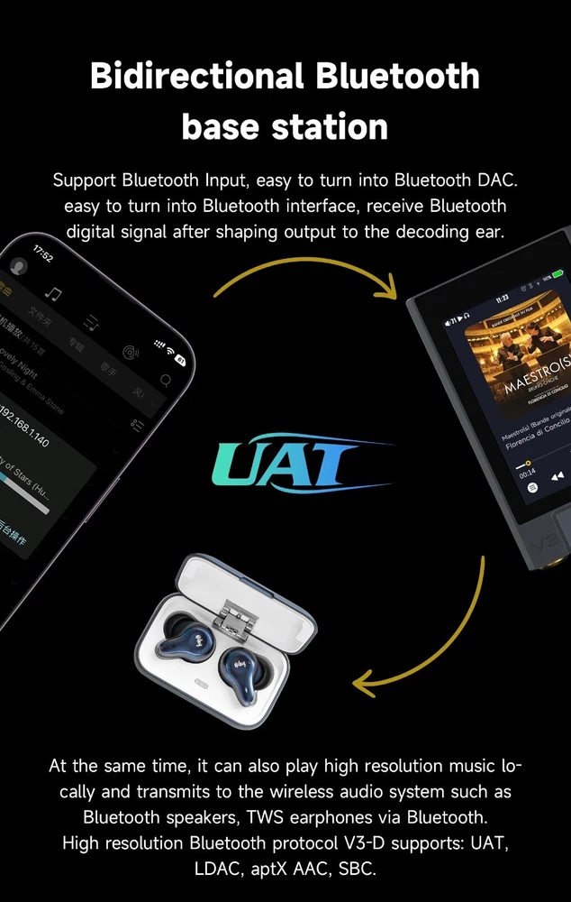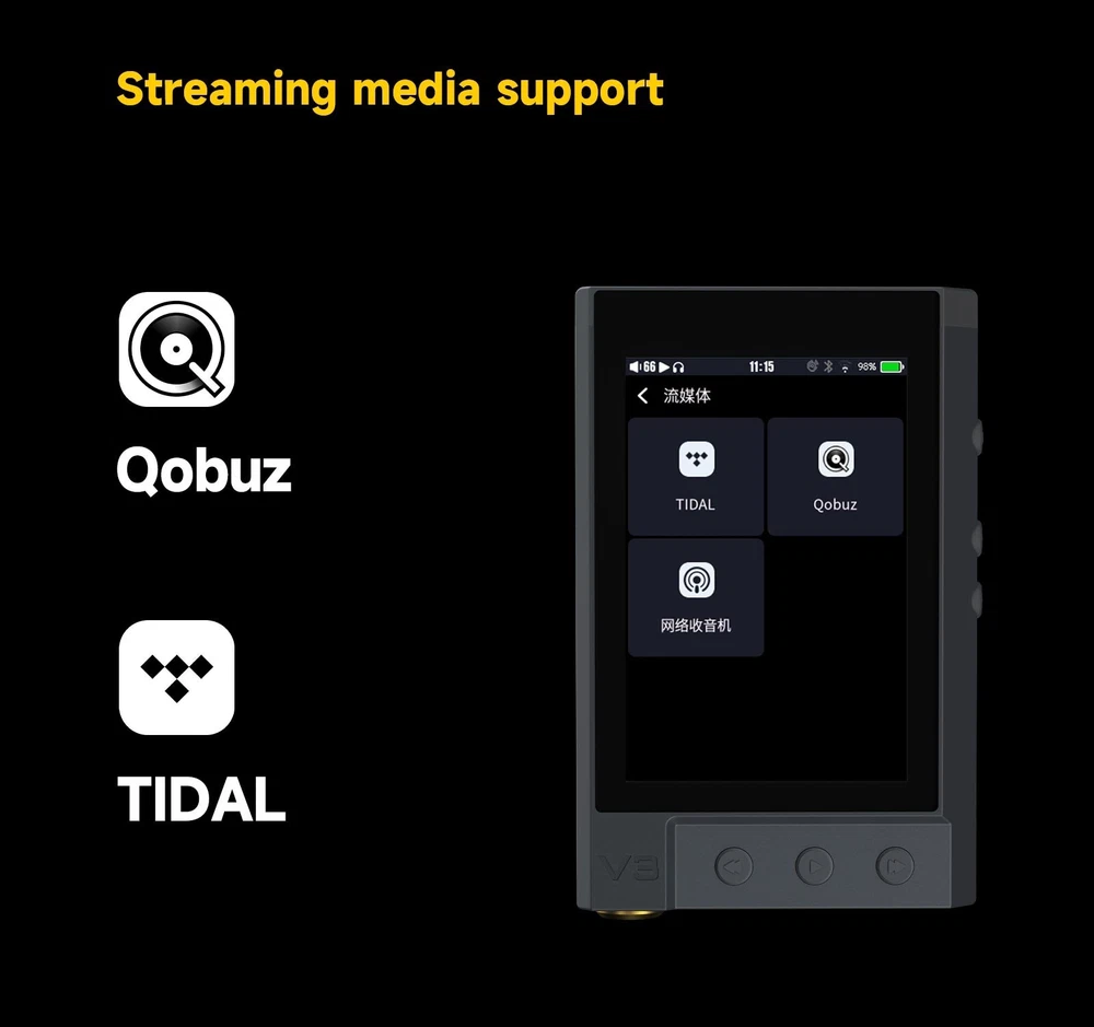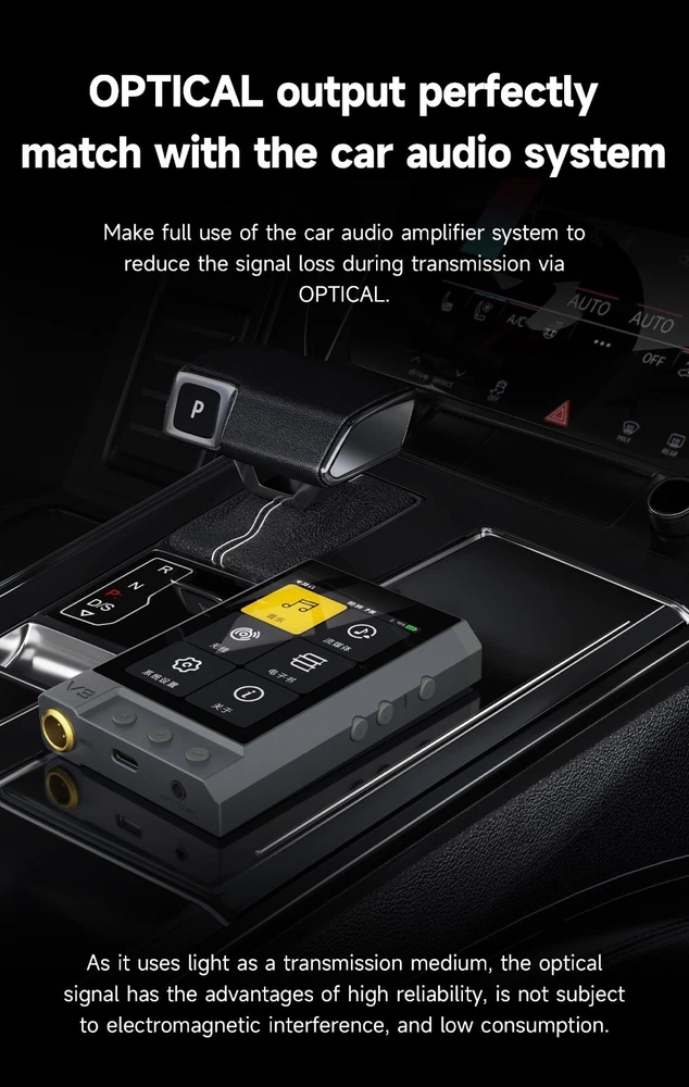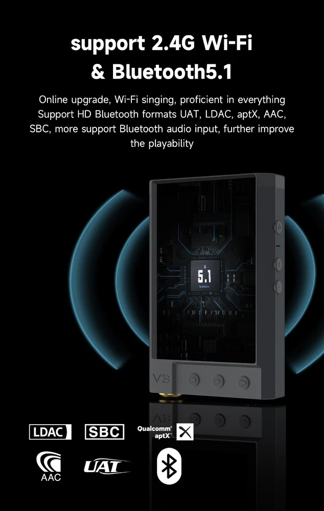 * V3-D is a digital player and doesn’t have analog output . It must be used together with other DAC TempoTec V3-D HiFi Portable digital audio player and turntable, supports Bluetooth, USBC, Coaxial output, Optical output and mini AES. The functions supported of this hifi music player: Wireless included: Bluetooth 5.1 and 2.4GHz WiFi Input support: Local playback (Micro SD) Bluetooth input (LDAC, AAC, SBC), AirPlay, DLNA Streaming media (Tidal, Qobuz), USB input audio Output Support: Optical, Coaxial, MINI AES,USB output Bluetooth output (LDAC, aptX, AAC, SBC) Supported formats: DSD256, PCM 384kHz/32bit Control: HiByLink, Hardware buttons TempoTec V3-D works as audio source to connect with TemopTec March M3 via USB, or with TempoTec Serenade X via Coaxial or Optical cables.