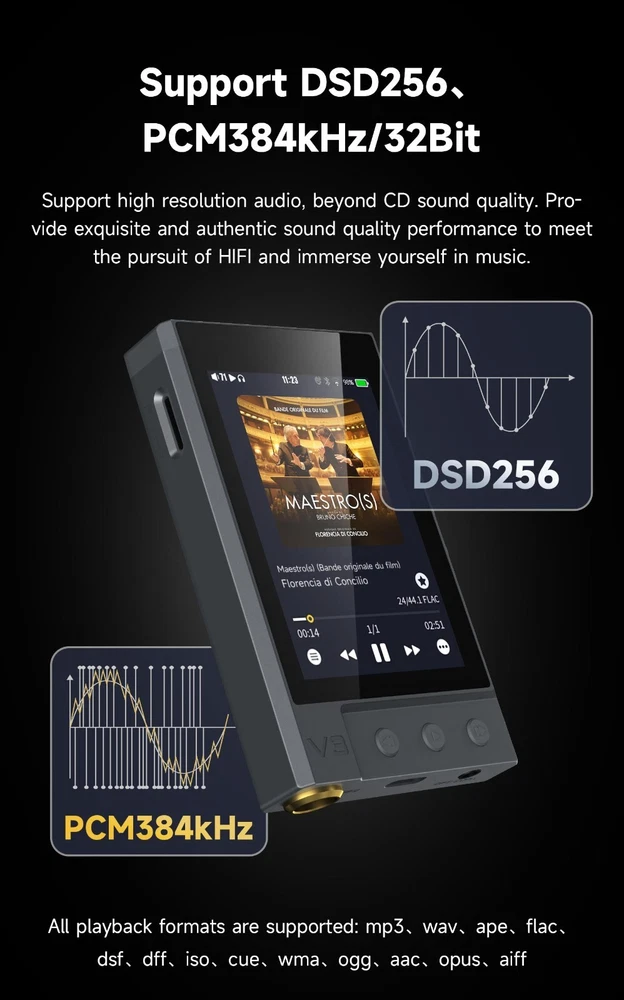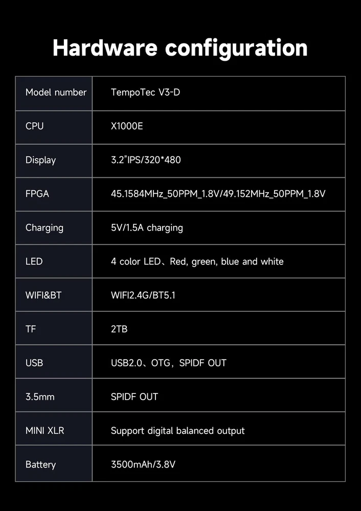 Generation: 1st Generation Brand: TempoTec Year Manufactured: 2023 Screen Size: 3.2 Country/Region of Manufacture: China Item Height: 65mm UPC: 6950697905109 Playable Media Format: MP3, AAC Color: Gray Item Weight: 200g Item Length: 100mm gtin13: 6950697905109 Type: Audio Decoder Item Width: 17mm Product Line: TempoTec Manufacturer Warranty: 1 Year Model: TempoTec V3-D Connectivity: Bluetooth Features: Support 2TB Expansion