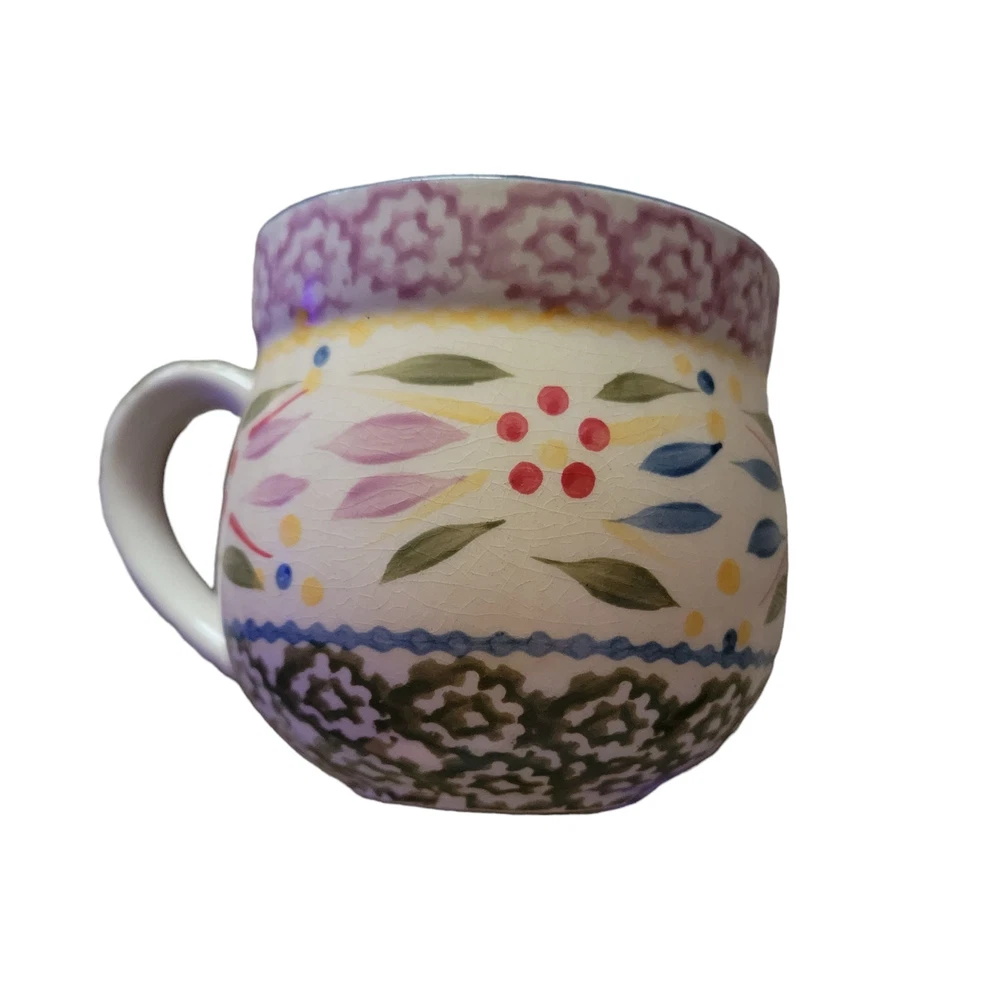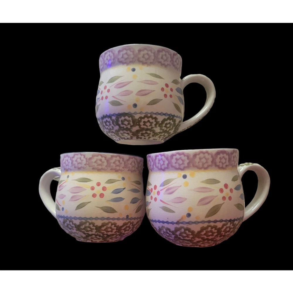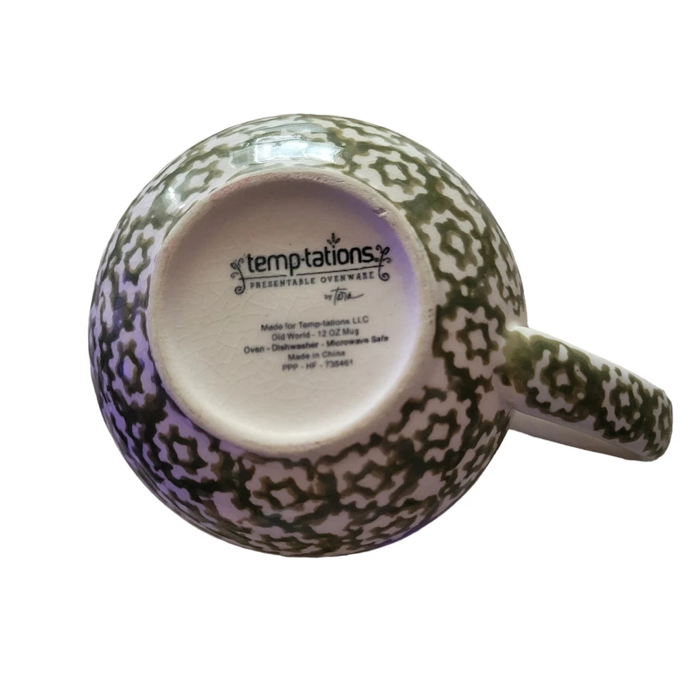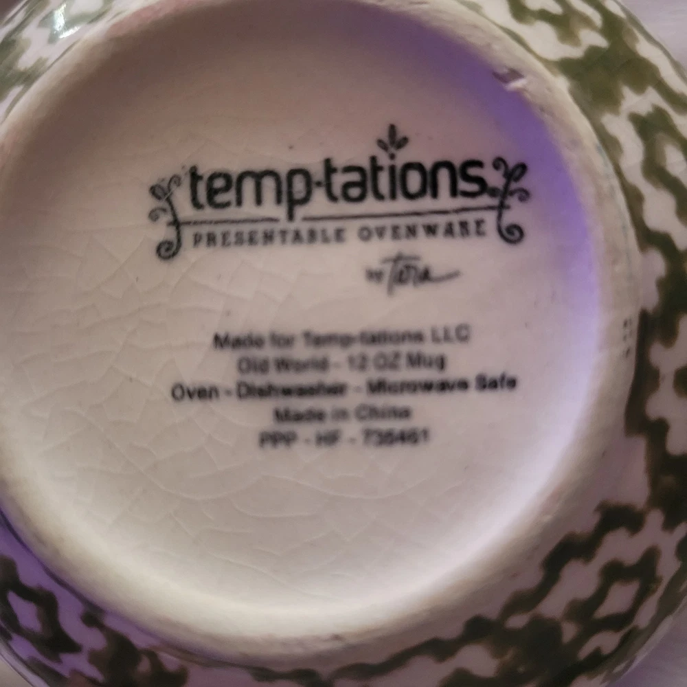 Temptations Old World Mugs Set of Three Mugs Rare Beige and Green Colors Oven, microwave, dishwasher safe 12 Ounces Made in China By Tara Set of three The mugs have no chips or cracks. There is some crazing on both mugs that can hardly been seen. The crazing can only be seen with a bright phone light. They are stored in a smoke free area.