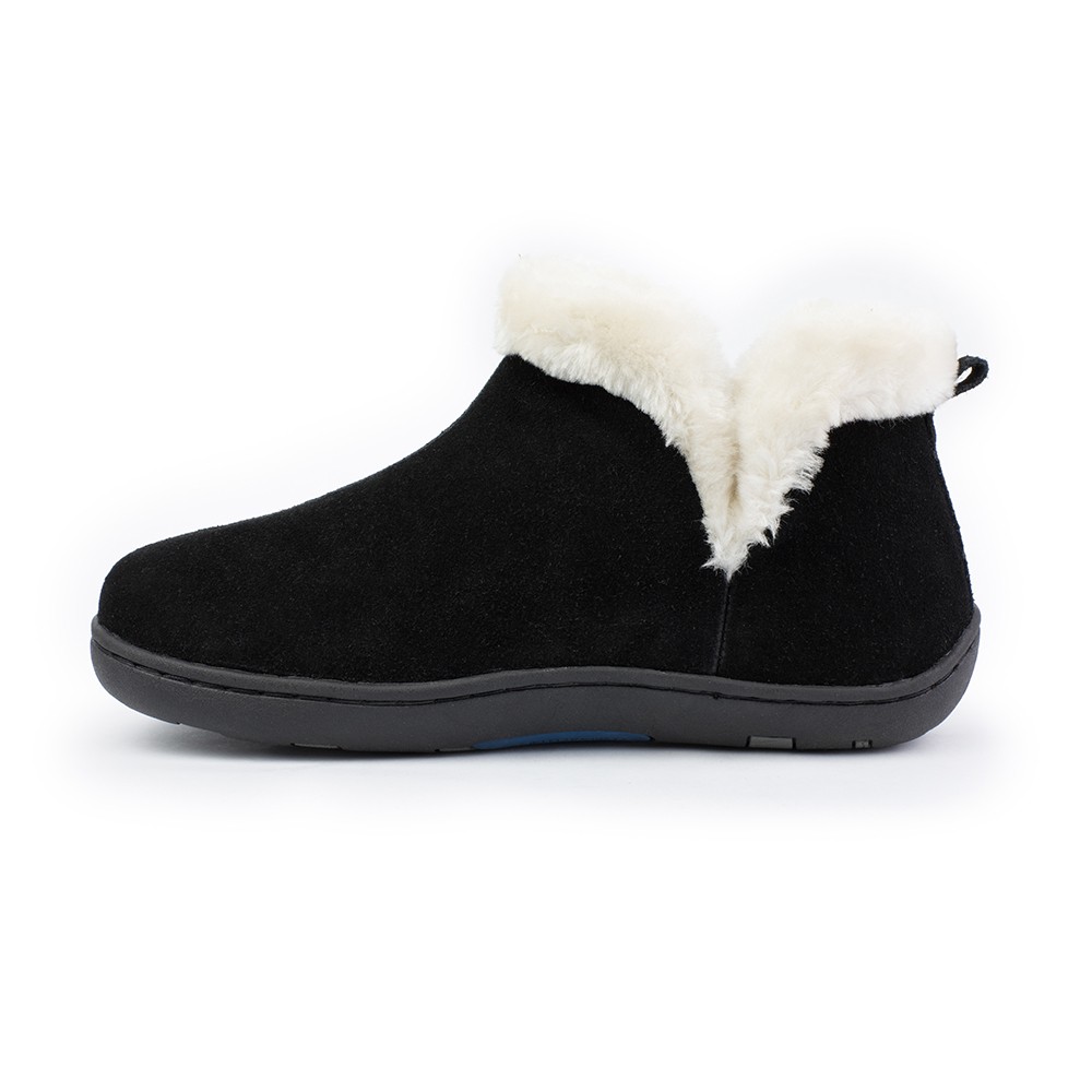 Vallery Bootie Slippers Product Details Suede Leather Upper Faux Fur Collar Fleece Lining Tempur Pedic Cloud Footbed Polyurethane foam for stability The Vallery is a bootie slipper with genuine suede upper and faux fur collar trim. It is constructed with a fleece liner to keep you cozy and warm. Featuring a Cloud footbed with Tempur foam for cushion and a second layer of polyurethane foam for stability. Features an outsole for both indoor and outdoor use. Additional Details Color: Black Occasion: Casual Gender: Womens Age: Adult Brand: Tempur-Pedic