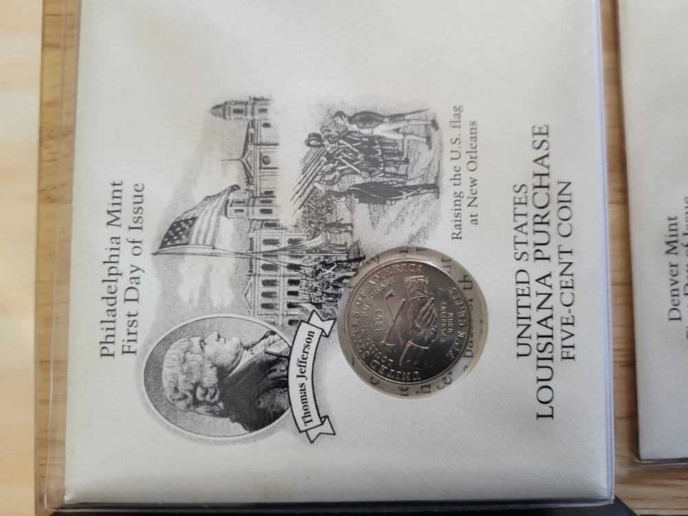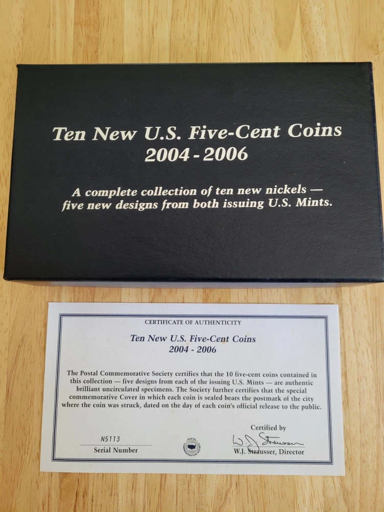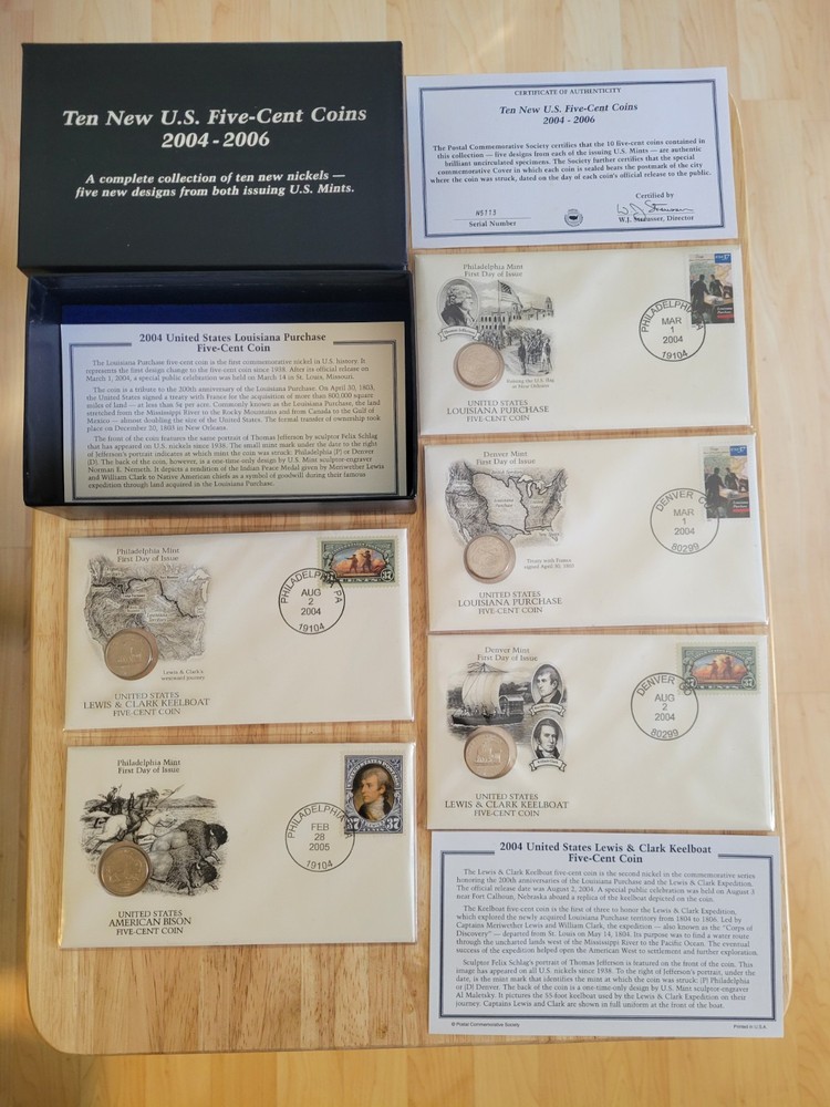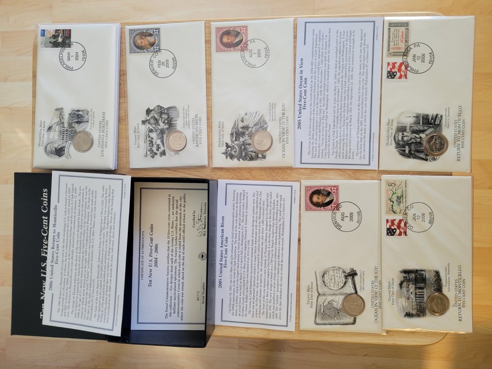 The product is a collection of ten new Jefferson nickels from the years 2004 to 2006, accompanied by U.S. stamps from the same location. The coins are uncertified and are of origin from the United States. This historical collection is a valuable addition to any coin enthusiast's portfolio, showcasing the iconic Jefferson design in a contemporary setting. All coins and stamps are Original from their purchase From PCS.