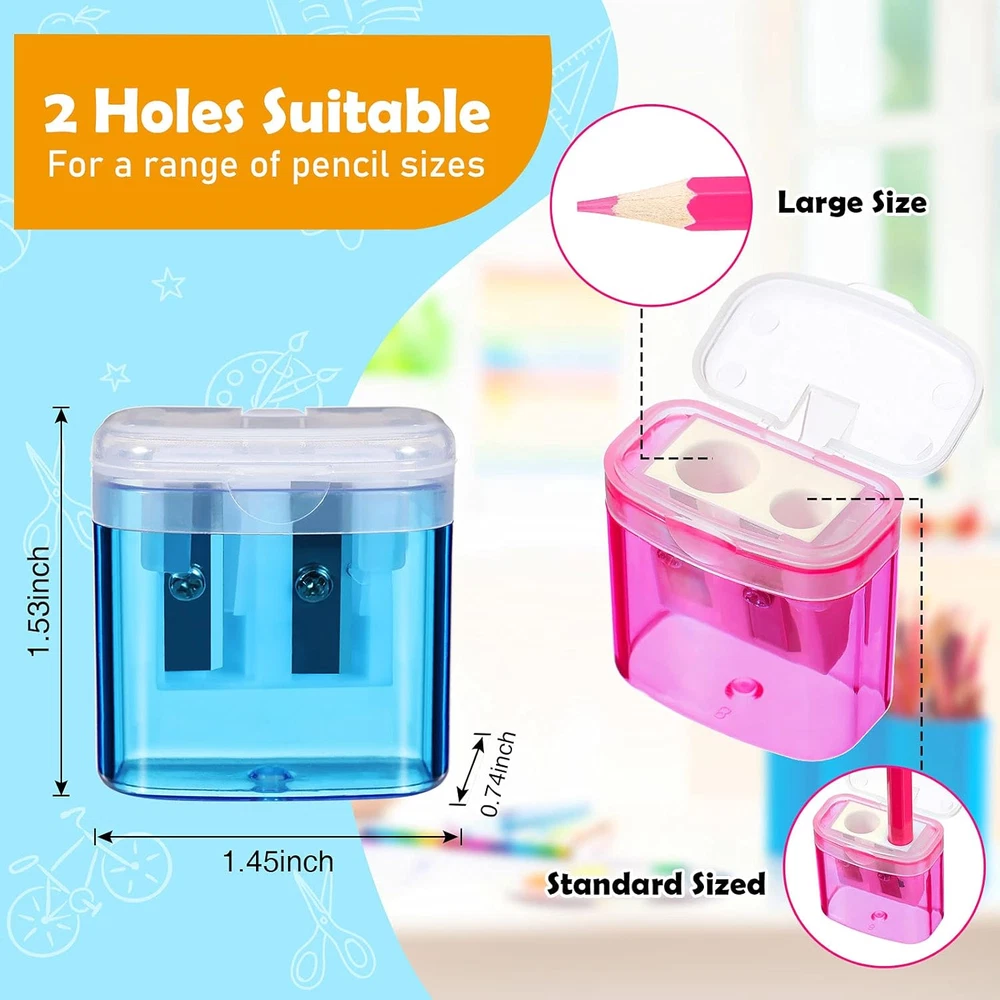 Package includes: you will get 48 cute colored pencil sharpeners, 4 colors in the transparent box, including pink, yellow, blue and green, each color has 12 pieces; There are 4 boxes, each with 12 pieces, a large amount for your daily use or sharing with friends; The packaging design of the box makes it easy to carry, and each box will have your favorite color Quality materials: the inner of the sharpener is made of durable and lightweight plastic, and the edge is made of metal, which can cut the pencil quickly without damaging the pencil; It can easily sharpen the pencil and save your time Equipped with a lid: a manual sharpener with a plastic lid and box to protect the part where the pencil is stored, safely protect your fingers, and you don't need to worry about messing up the workbench; The pencil sharpener is easy to use and easy to clean, just take out the garbage and convenient to use Wide range of uses: the hand-held pencil sharpener is a practical and beautiful stationery applied in schools, offices and families; This is an appropriate gift for students to enjoy their homework; It is also suitable for daily office use and can be applied for birthday party gifts and present bag fillings Double-hole design: 2 sizes of pencil sharpeners are suitable for shaving large or small diameter pencils and crayons; These pencil sharpeners can solve problems for you and provide you with convenient and efficient tools; The shape of the rectangular trash can makes it look cute and interesting; Easy to carry and store, the cute and compact shape and rich colors make it a practical stationery for colleagues or friends to share Product Description Dual Hole Design With 2 kinds of sharpener sizes, suitable for shaving pencils and crayons of large or small diameters, one sharpener can solve all problems, convenient and efficient tools for you. Easy to Clean Trash can shape design is easy to receive pencil shavings, you just need open the lid to empty the shavings conveniently in time, keep desktop tidy and clean. 4 Bright Colors Package comes with 4 different colors, each color has 12 pieces, colorful pencil sharpeners will add fun to learning, kids will love them!