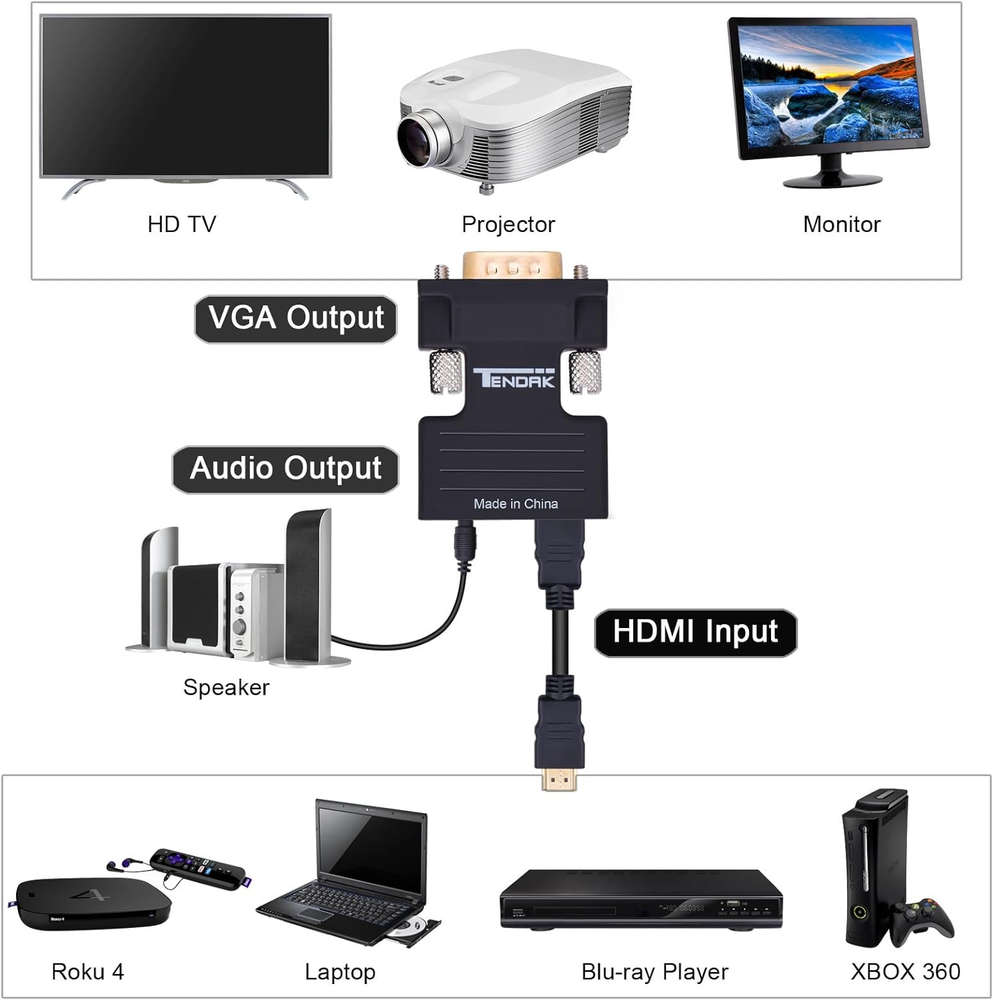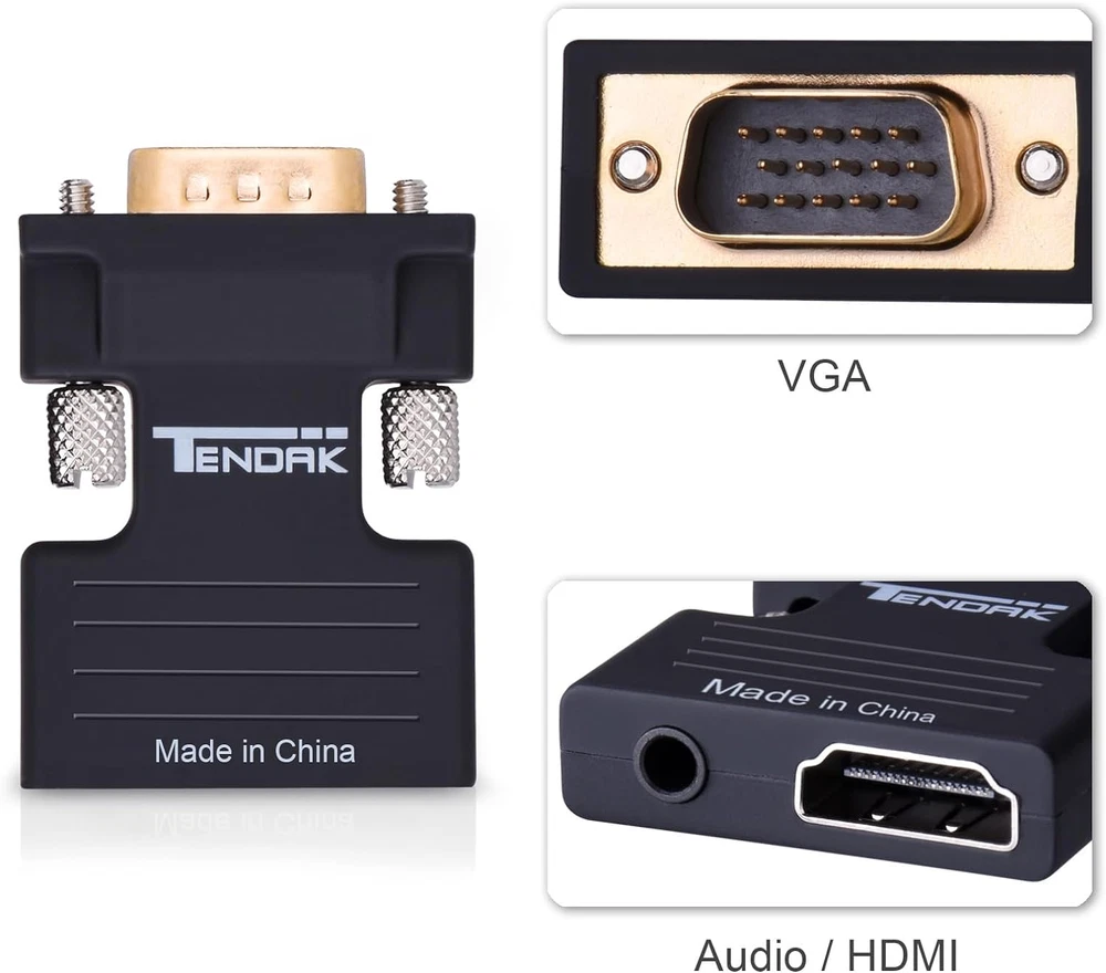 Store New Arrivals Add to Favorite View Feedback Contact Tendak Active 1080P Female HDMI to VGA Male Converter Adapter Dongle with 3.5Mm Stereo Audio Portable HDMI Connector for Laptop PC PS3 Xbox STB Blu-Ray DVD TV Stick Description Item model number AV-107-BK-US Item dimensions L x W x H 1.65 x 1.26 x 0.59 inches Color HDMI Female to VGA Male Product Dimensions 1.65 x 1.26 x 0.59 inches Connector Type HDMI Compatible Devices Projector, Laptop, PC Item Weight 0.64 ounces Is Discontinued By Manufacturer No Specific Uses For Product Monitor,Projector,Tv Manufacturer Tendak Female HDMI to VGA adapter connects an HDMI compatible device to a monitor or projector with VGA port by extra HDMI cable. Kindly Note: NOT BI-DIRECTIONAL - This HDMI VGA video converter only converts HDMI (Female) signal TO VGA (Female). Converts HDMI digital signal to VGA analog signal; 3.5mm audio port sends audio to speakers or a display Gold-plated connectors is compatible with desktop, laptop, Ultrabook, notebook, DVD, media player, cable box, or other devices with HDMI port Supports 720p and 1080p full-size high-definition resolution; Support HDMI V1.4, 3D Plug & Play No driver needed, No external power required. When connecting your monitor, if put your monitor out of range or monitors won't show anything. Please adjust the resolution of your input source and monitor to below 1080P. If the product does not work,please contact us at any time, we will definitely solve it for you within 24H Product Description Work Home Theater Meeting ABOUT US We offer the best prices around on high quality products. Our E-store includes media such as books, movies, music and games while offering electronics, toys, sporting apparel, clothing, tools, general home, garden items and more. SHIPPING We are always working hard to ensure your package arrives as soon as possible. Please understand that some factors like weather, high postal traffic, and the performance of shipping companies are outside of our control. We offer free shipping to the lower 48 states and ship within 2 business days of payment, usually sooner. We do not accept P.O. Boxes. Please provide a physical address. RETURNS We offer a 30-Day Return Policy on items which you are not completely satisfied with. You have the option for a full-refund or an exchange of the item. No returns are available on items shipped outside of the USA. PAYMENT We accept PayPal. CONTACT US This page content is yet to come Please ad us to your favorite seller and visit again later Thank You CUSTOMER SATISFACTION We try our very best to make sure every customer is completely satisfied. If there's a problem, message us! We're happy to help.