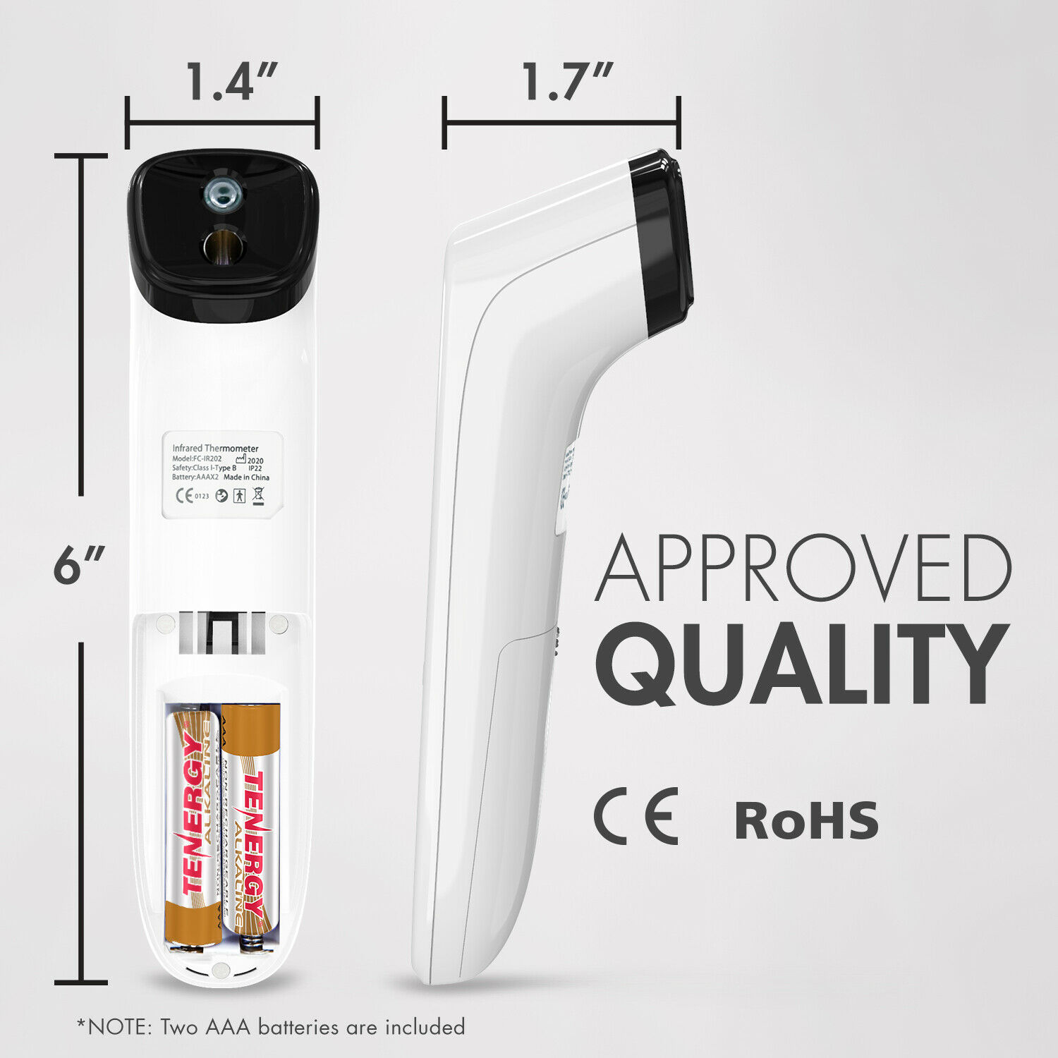 precision. 1-SECOND : collects 100 points of data to instantly return an accurate result within one second. COLOR CODED RESULTS : green for normal range, yellow for elevated, and red for fever. ROOM TEMPERATURE MODE : multi-purpose, seperate mode to additionally measure ambient room temperatures 1-Year Warranty (US Seller). Easy-to-Contact. FDA cleared 510(K) Thermometer What's included in this listing? 1 x 1 x Infrared Forehead Thermometer 2x AAA Battery 1x Storage Pouch 1x User manual Product Description Features And Benefits: Tenergy’s no-touch infrared thermometer, provides everything you need to have a hygienic way to instantly measure temperature for entire family. Packaging includes everything you need to use product and includes 2 AAA batteries. Accurate and reliable no touch digital thermometer uses 116 thermocouple elements to provide fast 1 second high precision measurement with ± 0.2°C / ± 0.4°F margin of error. Easily switch between Fahrenheit to Celsius or vice versa. Easy to use forehead thermometer with backlit LCD screen provides quick green, yellow, red, color coded assessment for quickly assessing temperature. Advanced built-in features include room temperature mode to record ambient temperature, silent mode for late night use and no disturbance, 20 seconds auto shut-off, and access to the last 35 recorded measurements. FDA Cleared. Tested and certified by CE and RoHS for safety and quality. Includes Tenergy 1 year warranty, and life time support from knowledgeable and local support team located in California. Contents Included: 1x Infrared Forehead Thermometer 2x AAA Battery 1x Storage Pouch 1x User manual