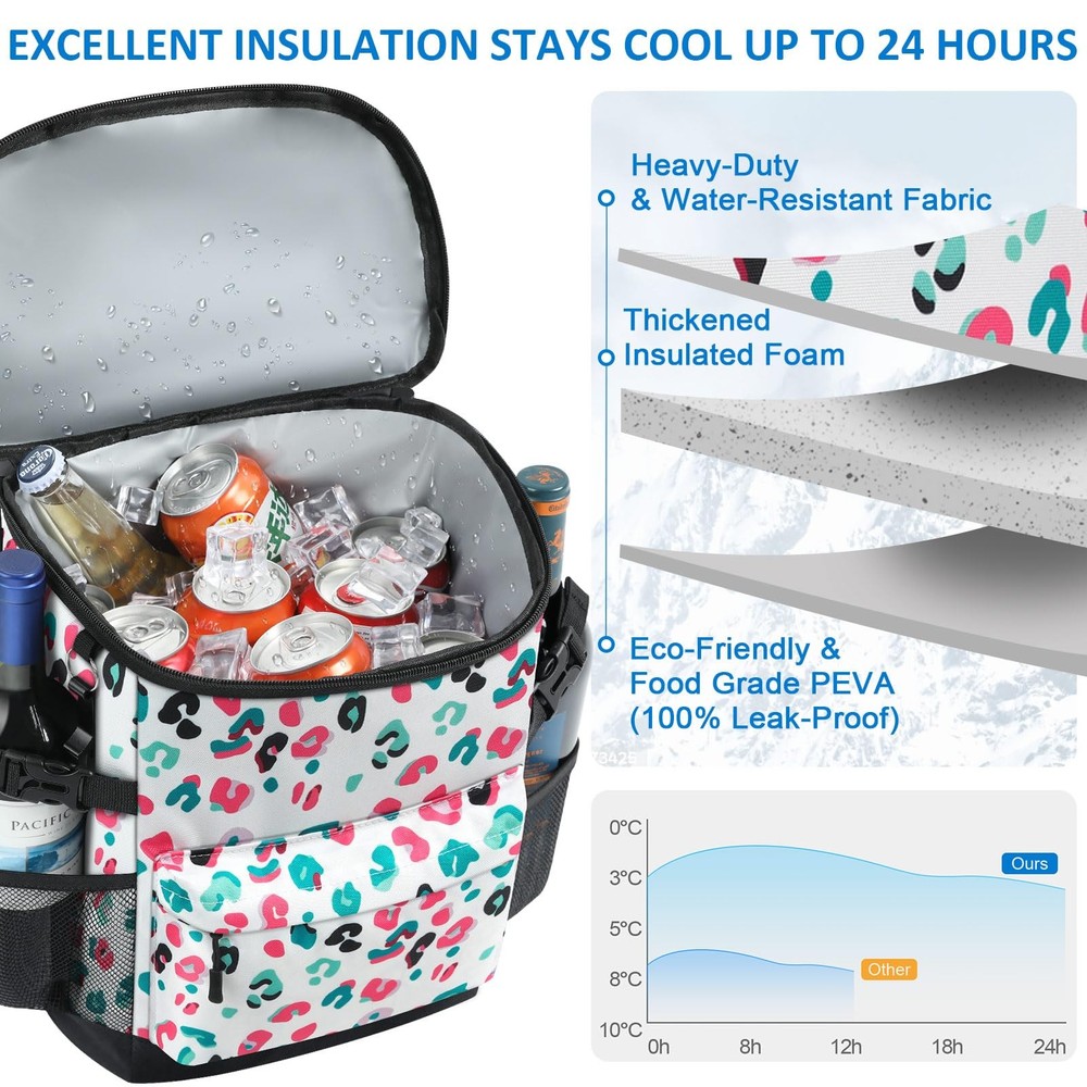 Tenot Cooler Backpack 33 Cans 18L-33 Cans, Blue Leopard Print Description Features: LEAKPROOF COOLER BACKPACK: Tenot lightweight backpack cooler is well insulated enough to keep food cold/hot for up to 16h-24h. There are two dimensions cooler backpacks (18L & 21L) for you selecting.It holds up to 33/40 cans and is lined with a leak-proof liner made of premium quality material that is easy to clean. With our Tenot insulated backpack cooler, your drinks will always stay refreshingly cold EXCELLENT KEEP COOL/WARM: Tenot's insulated cooler backpack are made with premium quality hot seamless pressing PEVA Lining and thickened foam to ensure their keep cool/warm function. This cooler bag are the answer to all your needs for keeping your food warm or cold, whether you're going on a picnic, taking your lunch to work, meeting friends or camping, our soft cooler bag is the answer to your worries, keeping your food fresh and your drinks cold ESSENTIAL OUTDOOR COMPANION: TSA approved dimension cooler backpack for men women. It's an thoughtful solution for people who often by plane or attend outdoor actitives. If you don't need it, just fold it up without taking up any space. Portable cooler bag suitable for varieties of types of outdoor actitives, so you can easily carry it for daily outdoor activities, such as Camping, Hiking, Work, Party, Watching Football/Golf games and so on WIDE APPLICABILITY: The stylish design of this insulated cooler bag is a practical choice for various occasions, These solid color and floral pattern backpack coolers for men women. As you can see, Tenot water cooler backpack in solid colours are suitable for men and soft sided cooler bag with floral prints are suitable for women and young people. The cow and leopard prints in particular may be enjoyed by your children, making it a practical gift for both men and women AMAZING CAPACITY: Tenot cooler backpack has a compact and stylish design but with a large capacity, the main pocket holds 33 cans (18L) of beverages, making it easy to organise all your drinks and snacks; the front pocket holds small items such as paper towels, keys and a mobile phone, and the two mesh pockets on the side hold beer and wine; This waterproof backpack cooler has excellent water resistance and can be a great companion for carrying your lunch, camping or other outdoor activities Product Details: Handling We will ship all orders within 1 business day of payment. Delivery We Do Not Ship Outside of the Continental US. Return Policy All items qualify for returns within 30 days of receipt. Buyer is responsible for return shipping on any item that is not damaged. Feedback We take our reputation seriously, we buy and sell online, so we understand the value of trust. If you are unsatisfied with your order, please contact us and we will work with you to resolve it to your satisfaction.
