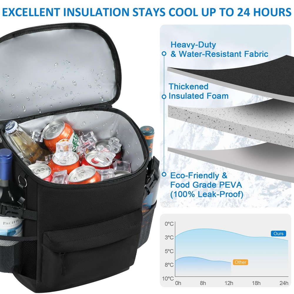 Tenot Cooler Backpack 33 Cans Coolers Insulated 18L-33 Cans, Black Product Details LEAKPROOF COOLER BACKPACK: Tenot lightweight backpack cooler is well insulated enough to keep food cold/hot for up to 16h-24h. There are two dimensions cooler backpacks (18L & 21L) for you selecting.It holds up to 33/40 cans and is lined with a leak-proof liner made of premium quality material that is easy to clean. With our Tenot insulated backpack cooler, your drinks will always stay refreshingly cold EXCELLENT KEEP COOL/WARM: Tenot's insulated cooler backpack are made with premium quality hot seamless pressing PEVA Lining and thickened foam to ensure their keep cool/warm function. This cooler bag are the answer to all your needs for keeping your food warm or cold, whether you're going on a picnic, taking your lunch to work, meeting friends or camping, our soft cooler bag is the answer to your worries, keeping your food fresh and your drinks cold ESSENTIAL OUTDOOR COMPANION: TSA approved dimension cooler backpack for men women. It's an thoughtful solution for people who often by plane or attend outdoor actitives. If you don't need it, just fold it up without taking up any space. Portable cooler bag suitable for varieties of types of outdoor actitives, so you can easily carry it for daily outdoor activities, such as Camping, Hiking, Work, Party, Watching Football/Golf games and so on WIDE APPLICABILITY: The stylish design of this insulated cooler bag is a practical choice for various occasions, These solid color and floral pattern backpack coolers for men women. As you can see, Tenot water cooler backpack in solid colours are suitable for men and soft sided cooler bag with floral prints are suitable for women and young people. The cow and leopard prints in particular may be enjoyed by your children, making it a practical gift for both men and women AMAZING CAPACITY: Tenot cooler backpack has a compact and stylish design but with a large capacity, the main pocket holds 33 cans (18L) of beverages, making it easy to organise all your drinks and snacks; the front pocket holds small items such as paper towels, keys and a mobile phone, and the two mesh pockets on the side hold beer and wine; This waterproof backpack cooler has excellent water resistance and can be a great companion for carrying your lunch, camping or other outdoor activities