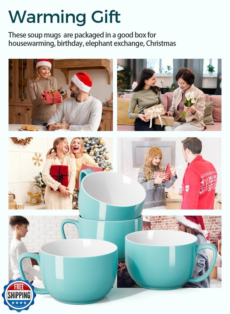 Teocera 24 oz Soup Bowls with Handles, Porcelain Large Coffee Mug Set, Jumbo Mugs, Soup Bowls Mugs set of 4 for Coffee, Oatmeal, Stew - Striped Design, Turquoise Features Large Handle for Big Hands - The handles are big enough for 3 or 4 fingers which is important when they're full. And the wide handle with a flat top will be easier to grip than the typical rounded version. And the handles don't get hot when microwaved, which is an added plus. Striped Design - The large mugs were designed with barely visible striping on the outside for more style. That is more practical yet classic than pure color mugs. Do not hesitate to add this teocera coffee mug set of 4 to your kitchen collection! XXL Capacity - 24oz soup mugs are for people who prefer big drinks. Anything goes in it, deep and large mugs for teas, gumbo, chili or stew. And the 3.5 inches height makes them hard to tip over and will let you feel more secure. Decent Weight, Long-lasting Porcelain - These large mugs with handle are great for office use and home use, as they work well in both cold and hot temperatures. The sturdy porcelain is oven, microwave, freezer and dishwasher safe. 30-DAY Promise❤ - Teocera team has been committed to providing quality products and outstanding service support. We offer a replacement or a 100% refund if you have any questions or concerns about Teocera coffee mugs. Shipping Free & Fast Shipping: We offer free shipping to most of the USA with a normal delivery time of 3-7 days. However, due to the current situation, additional delivery time (up to 3 weeks) may be required for some items. Alternative Carriers: We may use alternative carriers (e.g., USPS, FedEx, UPS) to ensure your package arrives safely and on time. Due to the use of multiple carriers, we are unable to provide a tracking number automatically. Handling Time: Orders are processed and shipped within 1-2 business days of receiving cleared payment. Shipping Restrictions: Shipping to Alaska, Hawaii, Puerto Rico, Guam, and other US territories may incur shipping charges or delivery restrictions. Please contact us before ordering, or your order can be refunded/cancelled. State Restrictions: Certain items may not be shipped to California due to state regulations. Contact for Tracking Updates: If you require tracking updates or have any concerns about the delivery of your order, please feel free to contact us, and we will be happy to assist you. Return Policy 30-Day Hassle-Free Returns: If you are not completely satisfied with your purchase, you can return the item for free within 30 days of receiving it for a full refund or exchange. Easy Return Process: Contact us, and we will provide you with a prepaid return shipping label and detailed instructions. No Restocking Fee: There are no restocking fees for returns. However, the buyer is responsible for return shipping costs if the return is not due to a seller"s error. Refund Processing: Refunds will be processed within 1 business day of receiving the returned item in its original condition. Feedback Your feedback is extremely important to us. We strive to provide the best products and customer service possible. If you are satisfied with your purchase, please take a moment to leave us a positive review. If you have any concerns or issues with your order, please contact us before leaving negative feedback. We are committed to resolving any problems and ensuring your satisfaction. Contact Us If you have any questions or concerns, please feel free to reach out to our customer support team. You can contact us through the eBay messaging system. We are available Monday to Friday, 9:00 am to 5:00 pm EST, and we will do our best to respond to your inquiry within 24 hours. Thank you for supporting our small family business!