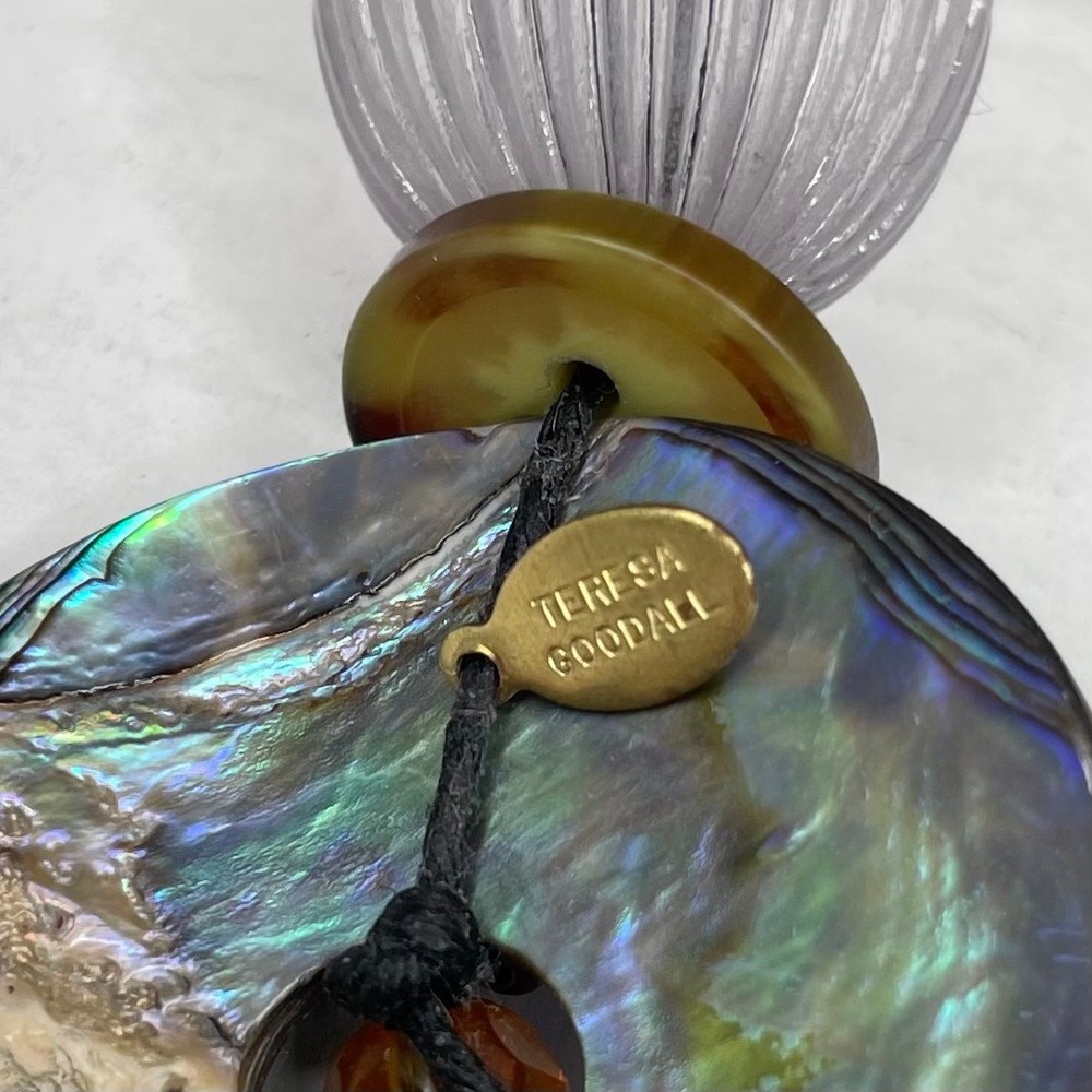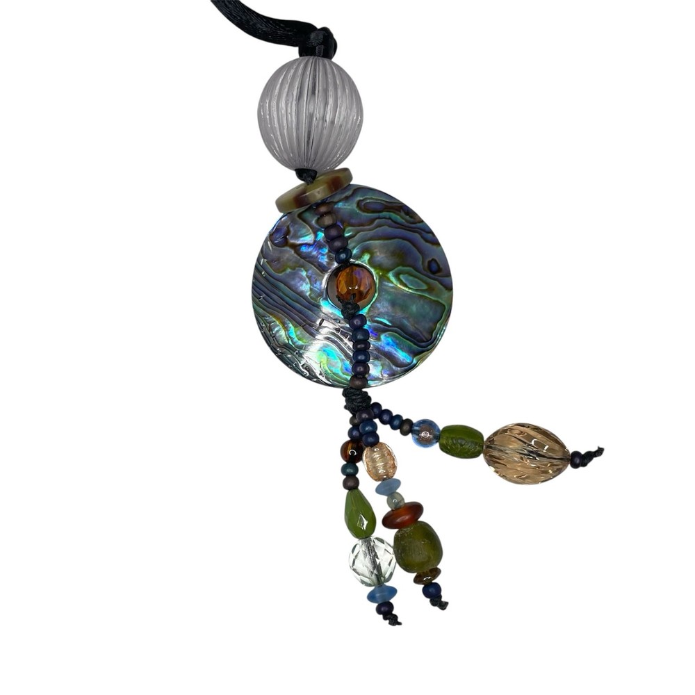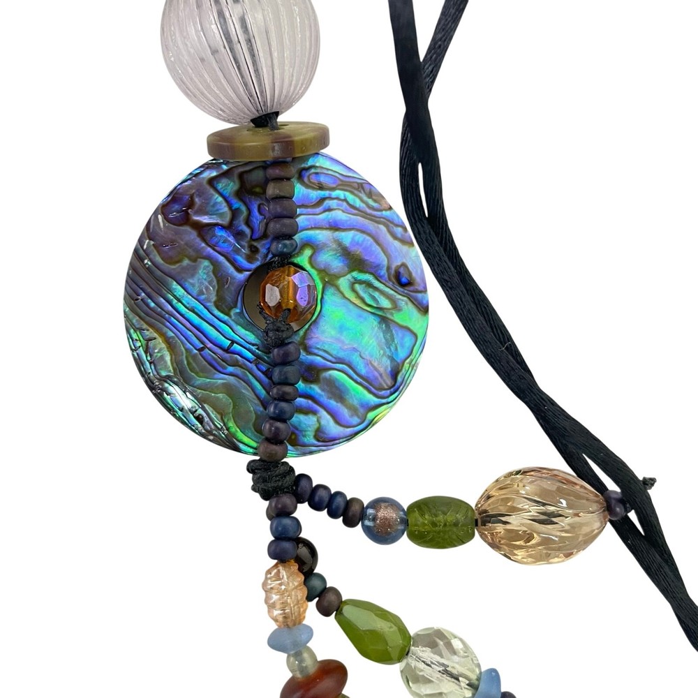 Teresa Goodall Handcrafted One of a Kind Unique Bead Shell Pendant Boho Statement Necklace Knotted black cord attached to pendant Pendant has abalone shell with tassels of multicolor beads of different sizes and shapes Handcrafted One of a kind Length including pendant- 21"