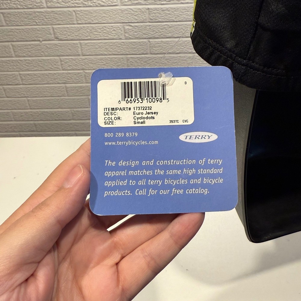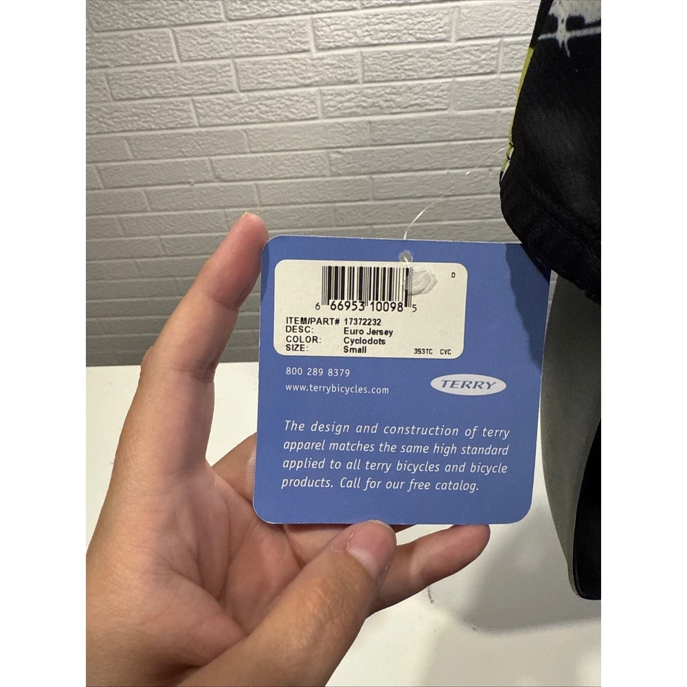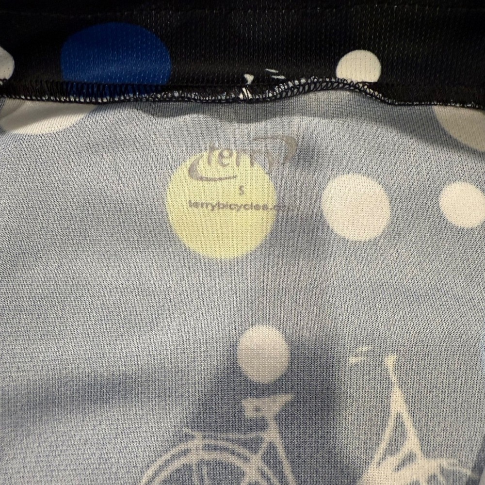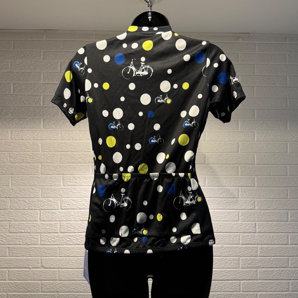 Brand new with tags, Great Condition. Cruise in style with this Terry Euro cycling jersey, a statement piece that blends performance and panache. Envision yourself effortlessly gliding through scenic routes, the lightweight fabric wicking away moisture as you conquer every hill. The playful bicycle and polka dot design in white, blue, and yellow pops against the black backdrop, radiating energy and fun. A full zip allows for adjustable ventilation, while the three rear pockets provide ample space for essentials. Perfect for weekend rides, charity events, or showing off your unique style on group tours. Color: Black Type: Casual Department: Women Fabric Type: Jersey Style: Jersey Performance/Activity: Cycling Sleeve Length: Short Sleeve Features: Full Zip, Breathable, Lightweight, Moisture Wicking, 3 Rear Pockets Closure: Zip Material: Spandex Blend, Polyester Blend, Performance Fabric Fit: Slim Pattern: Polka Dot Keywords: Terry, cycling jersey, womens, bike print, short sleeve, full zip, black, blue, yellow, polka dot, sportswear, activewear, size small, euro jersey
